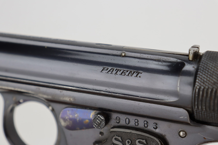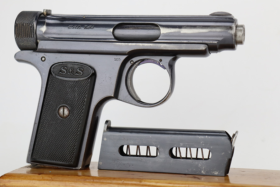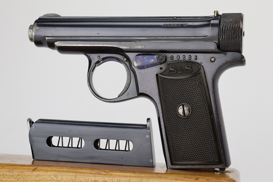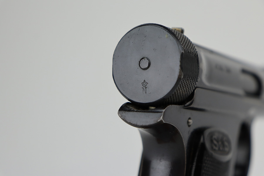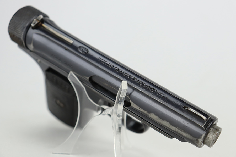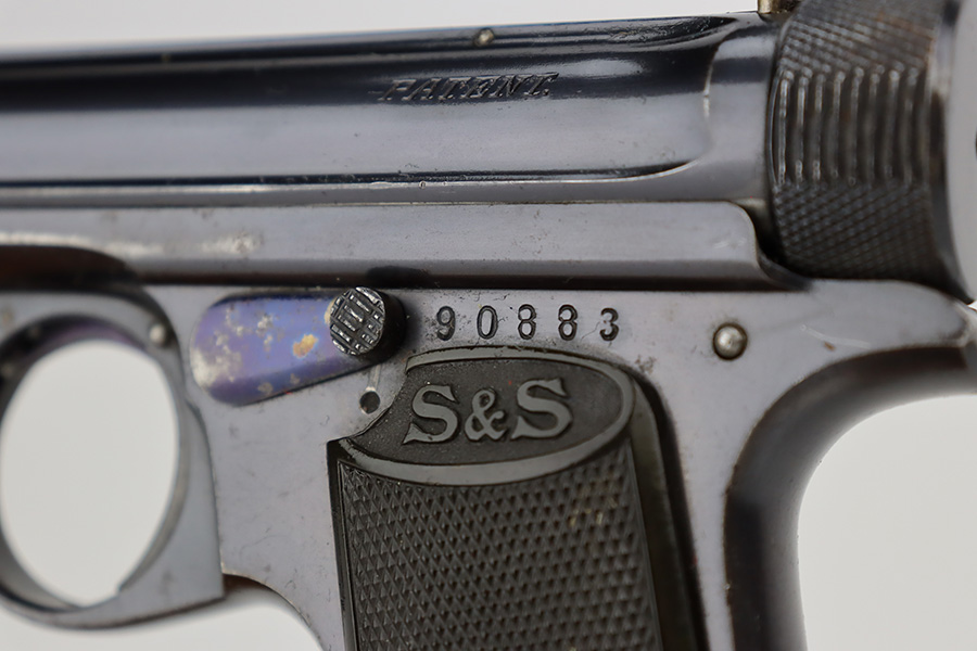 7/10/23 – This is a very nice example of a Sauer Model 1913. It is all matching and has the proper “Crown N” proofs. It has retained somewhere between 85-90% of its original bluing with wear around the muzzle and on the high edges of the slide – most noticeable along the right side. Comes with excellent period-correct black bakelite grips and one proper magazine. Minty bore.