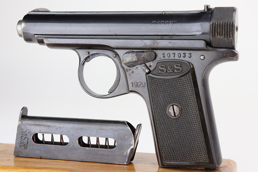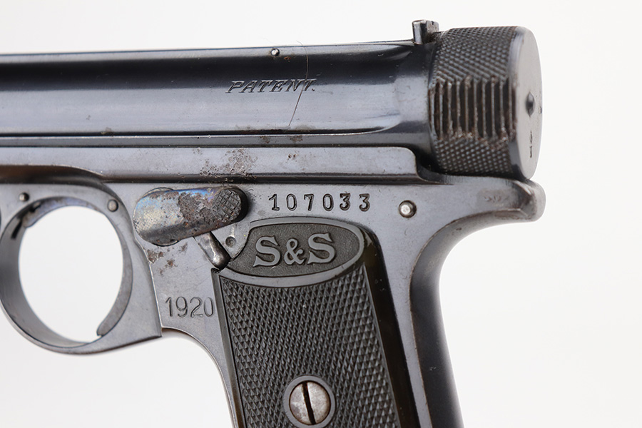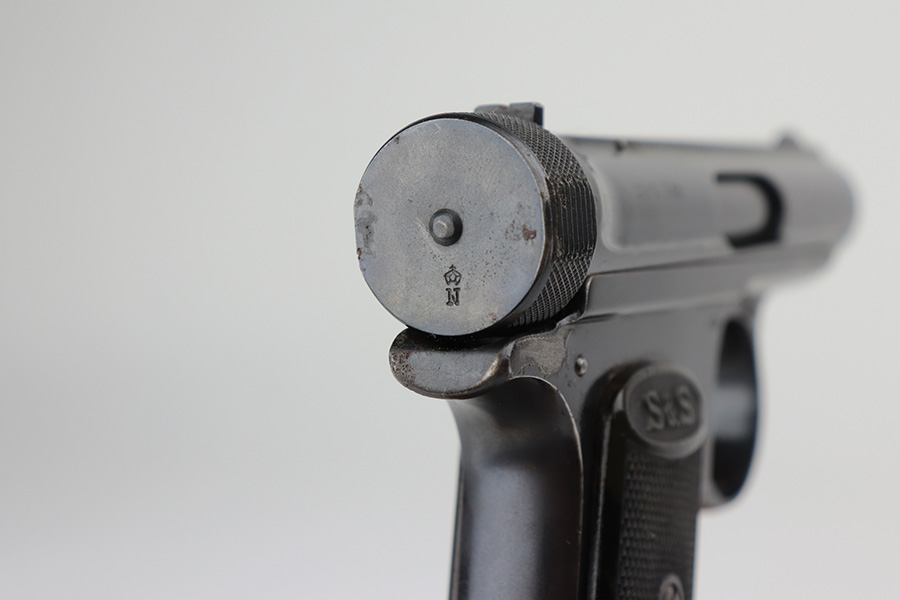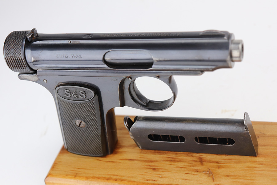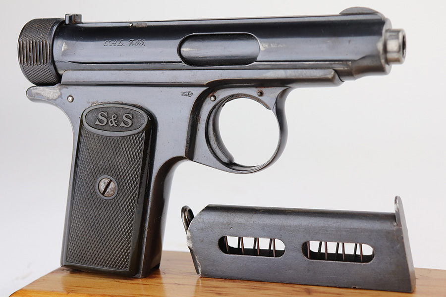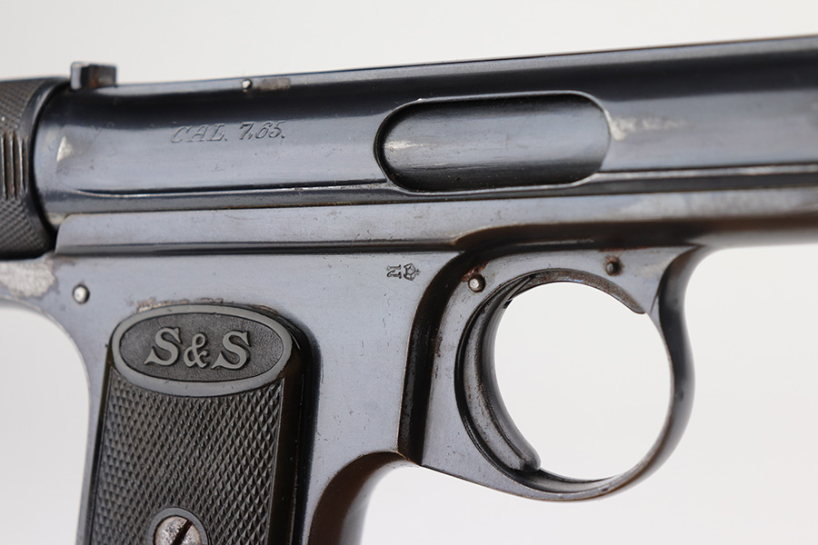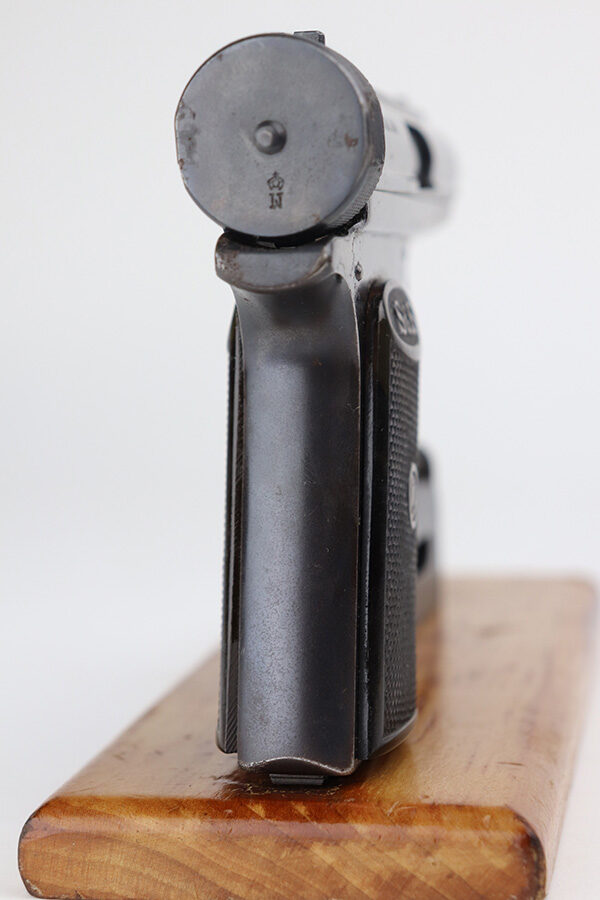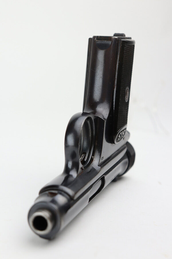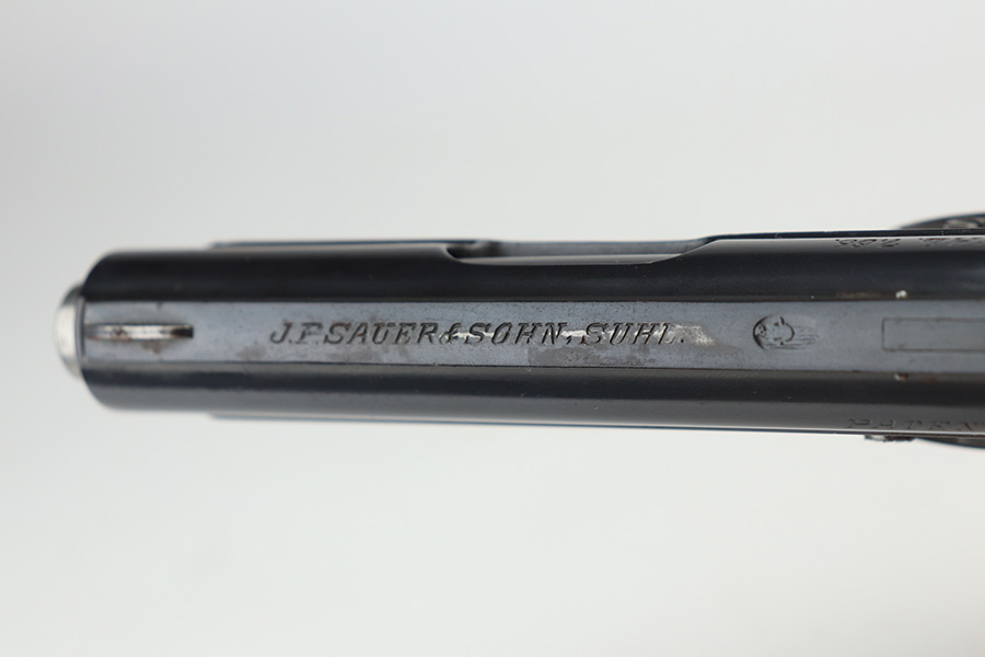 8/16/21 – This is an excellent example of a Sauer Model 1913 manufactured in the early 1900’s. The gun is all matching and has the proper “Crown N” proofs. This one also has a “1920” marking on the left side of the frame, indicating it was reworked for police use. It has retained about 97% of its finish. There is minor wear along some of the high edges and around the muzzle. An area of wear on the right side of the tang. There is a small area of heavy pitting on and around the safety lever. Patina and pin-pricking on the straps. Comes with excellent grips and a period-correct magazine. The bore is near-mint.