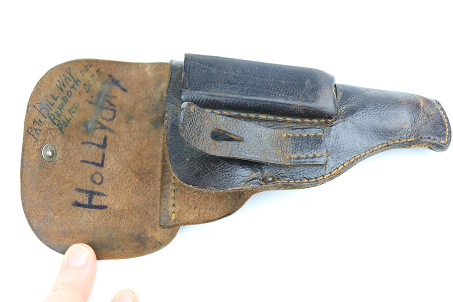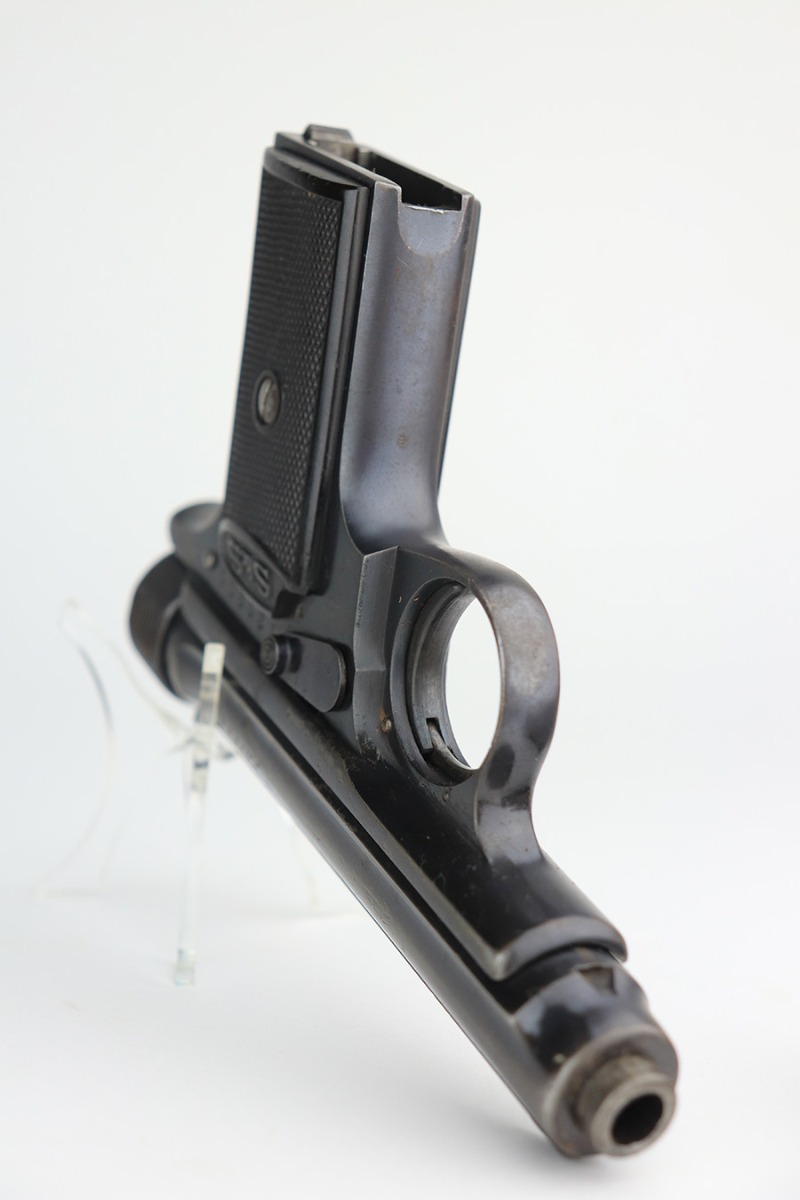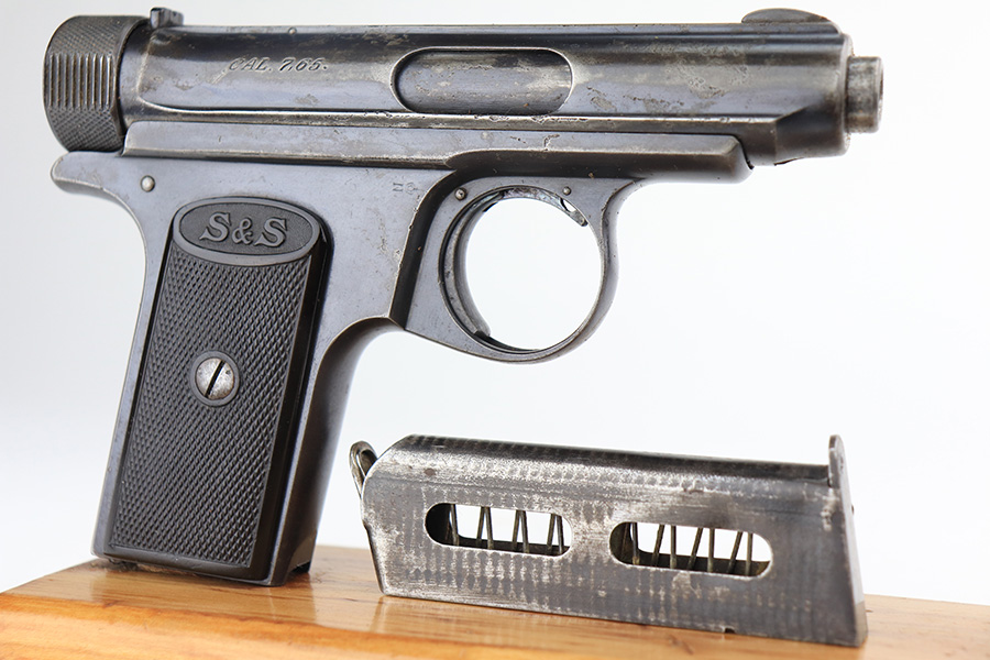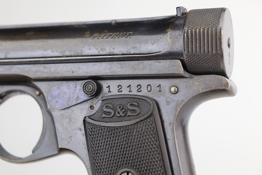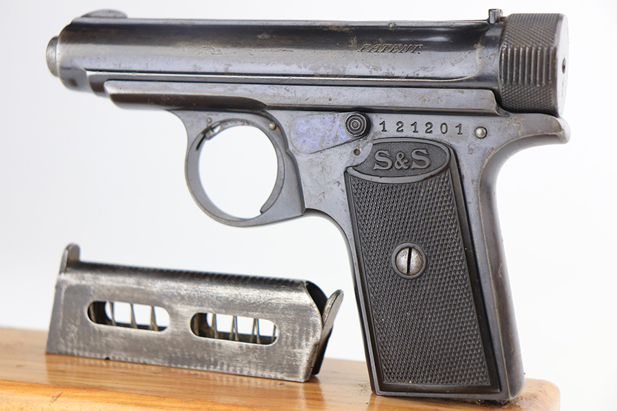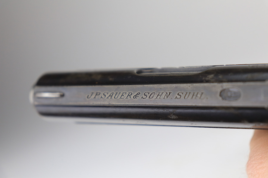 2/8/22 – This is a nice example of a Sauer Model 1913 likely manufactured in the 1920’s. It is all matching and has the proper “Crown N” proofs. The gun comes with a 1915-dated police holster and two period-correct magazines. The holster has two small holes in the top flap and a name written on the inside. The gun has retained roughly 85% of its bluing. The finish loss is spotty and most noticeable on both sides of the slide. There is minor pitting in those same areas. There is minor freckling on both grip straps. There are two unknown proofs on both grip straps – we’re not sure of the meaning. Comes with a pair of very nice period-correct black bakelite grips. The bore is near-mint.
