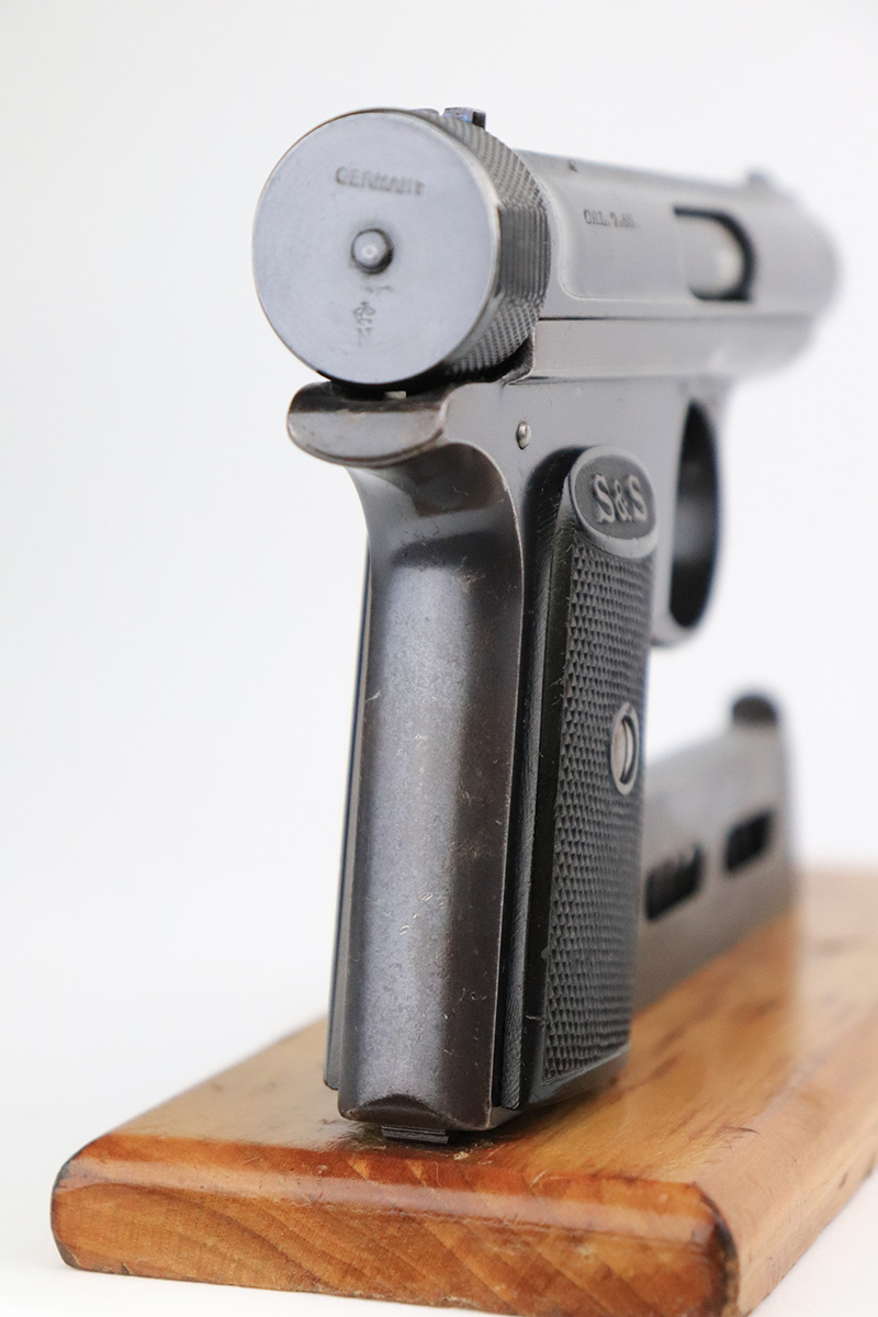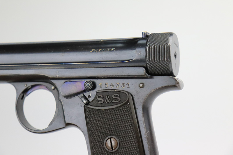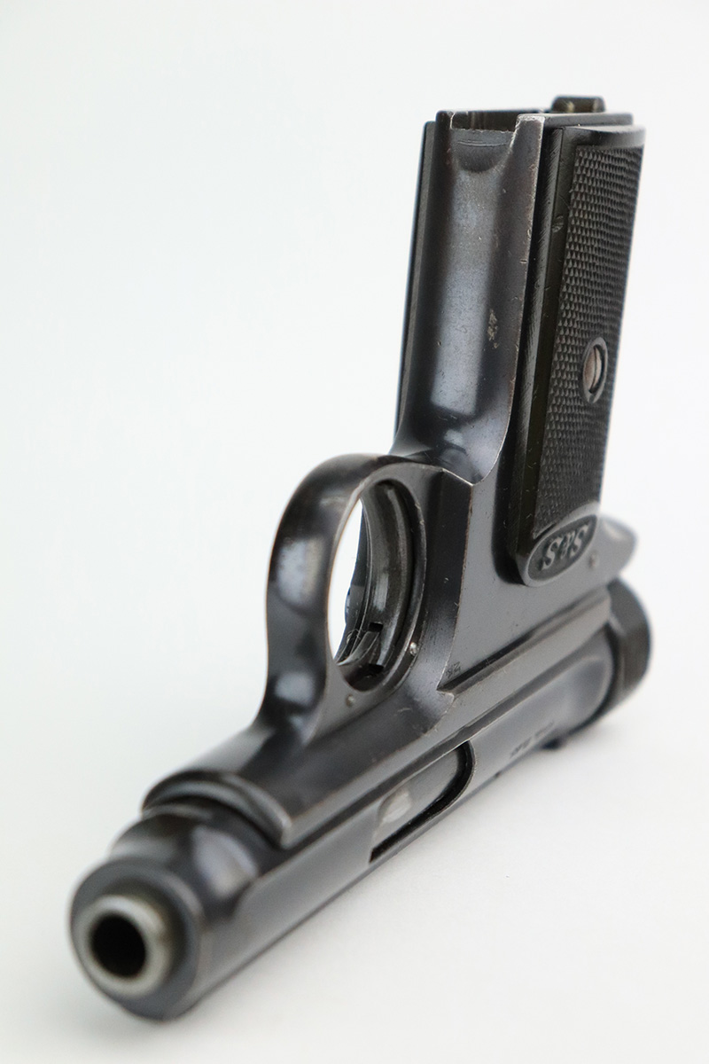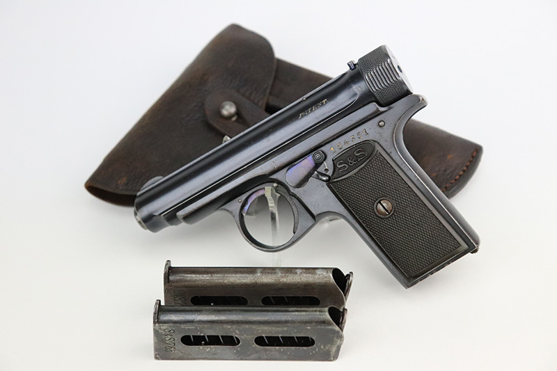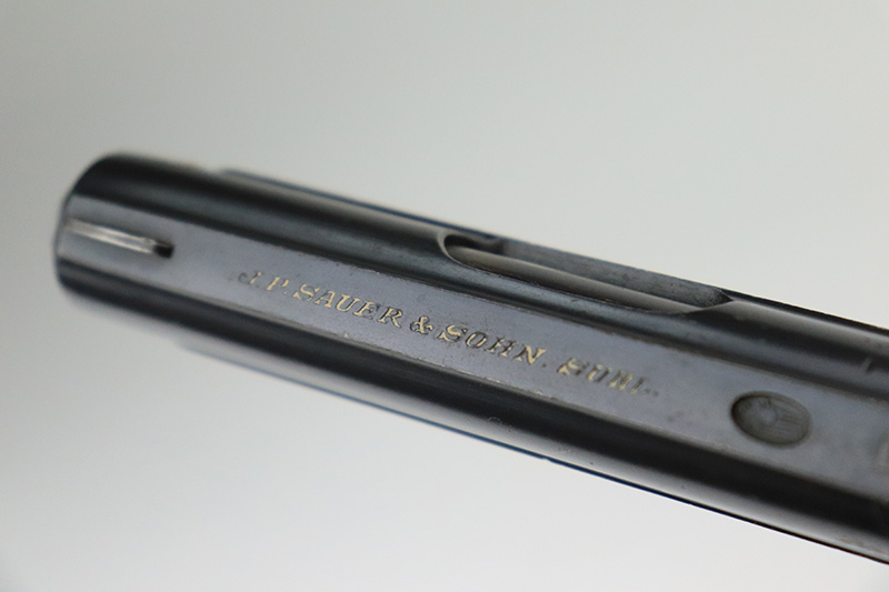 11/23/22 – This is an excellent example of a Sauer Model 1913. It is all matching and has the proper “Crown N” proofs. Germany export marking on the cocking knob, indicating it was intended for international sale. It comes as a rig with a nice 1915-dated pebble grain police-style holster and two period-correct magazines. The gun itself has retained about 96% of its original finish. There is very minor wear on some of the high edges and some handling marks / tiny dings here and there. Brown patina and pin-pricking on the grip straps. Comes with nice period-correct bakelite grips. Mint bore.