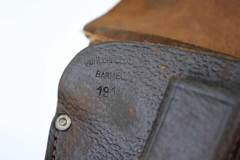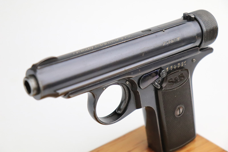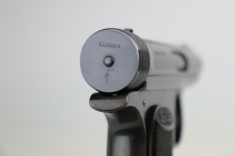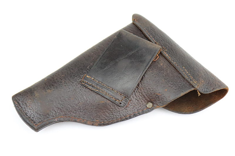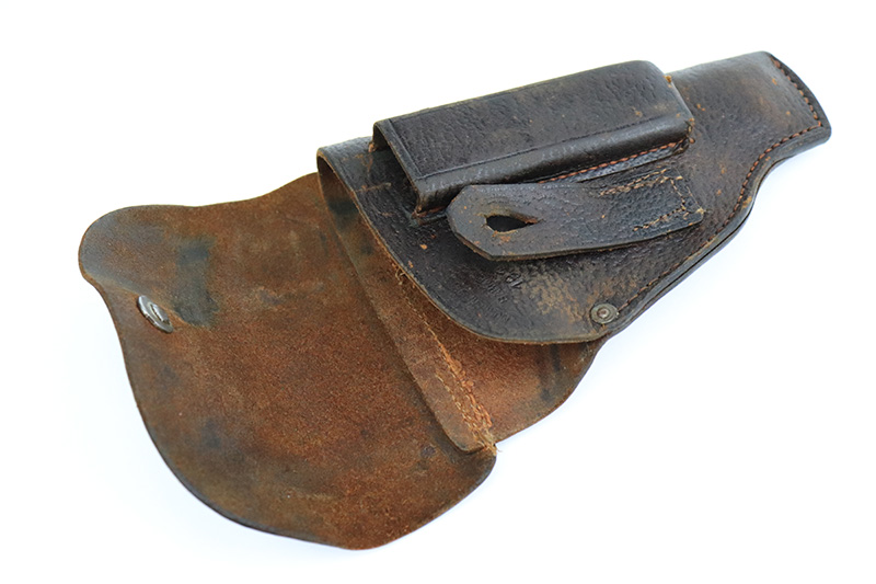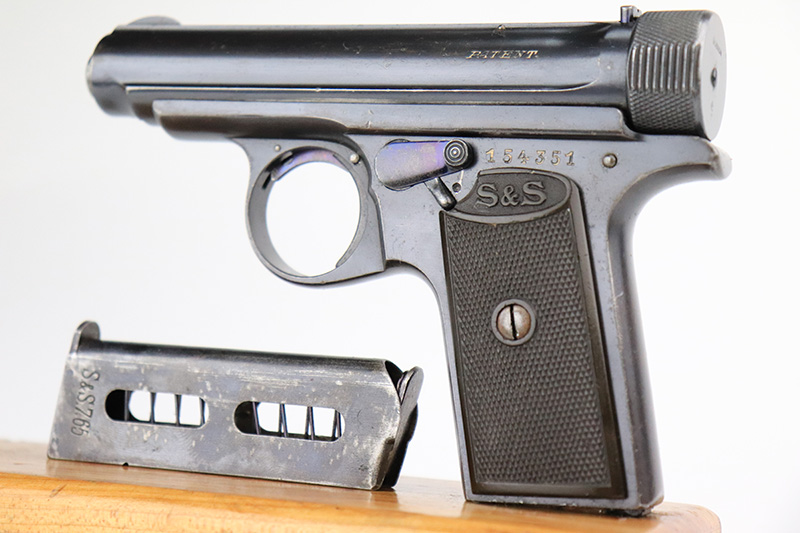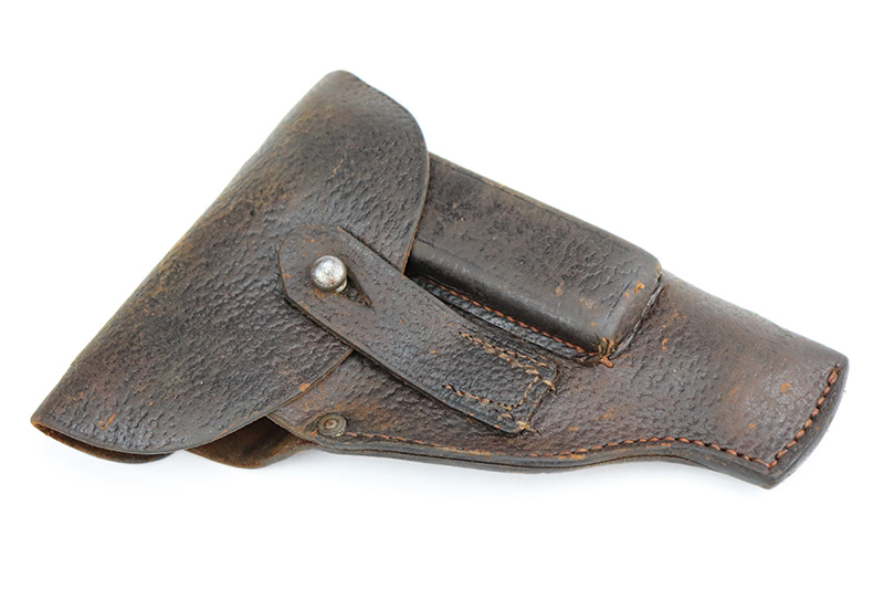 11/23/22 – This is an excellent example of a Sauer Model 1913. It is all matching and has the proper “Crown N” proofs. Germany export marking on the cocking knob, indicating it was intended for international sale. It comes as a rig with a nice 1915-dated pebble grain police-style holster and two period-correct magazines. The gun itself has retained about 96% of its original finish. There is very minor wear on some of the high edges and some handling marks / tiny dings here and there. Brown patina and pin-pricking on the grip straps. Comes with nice period-correct bakelite grips. Mint bore.