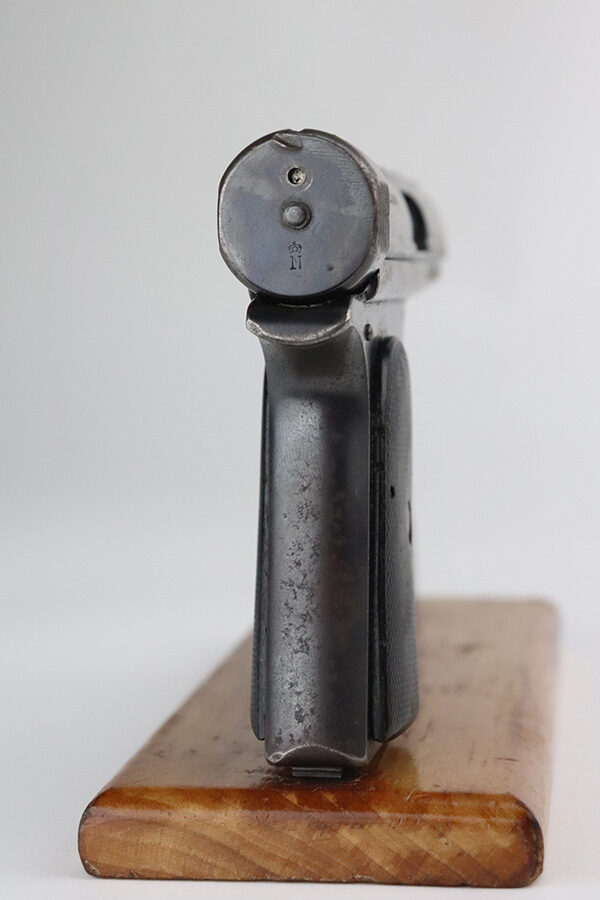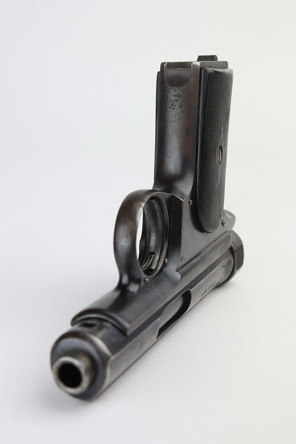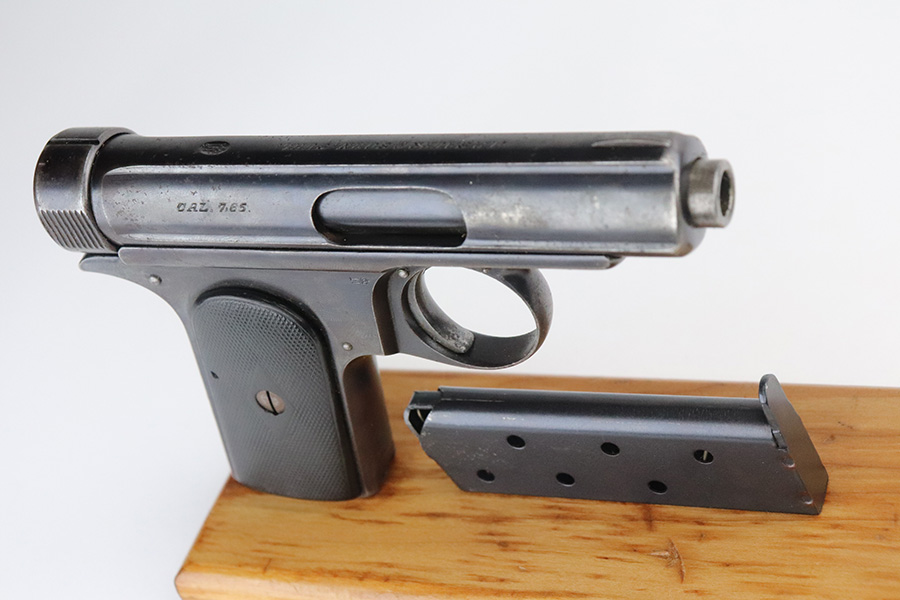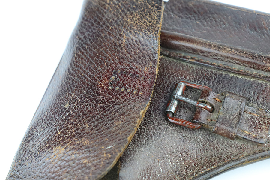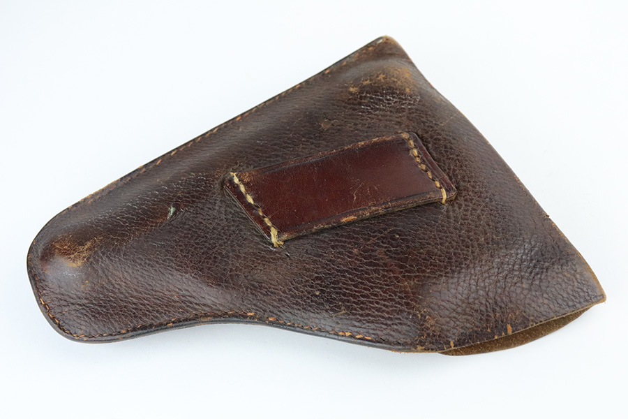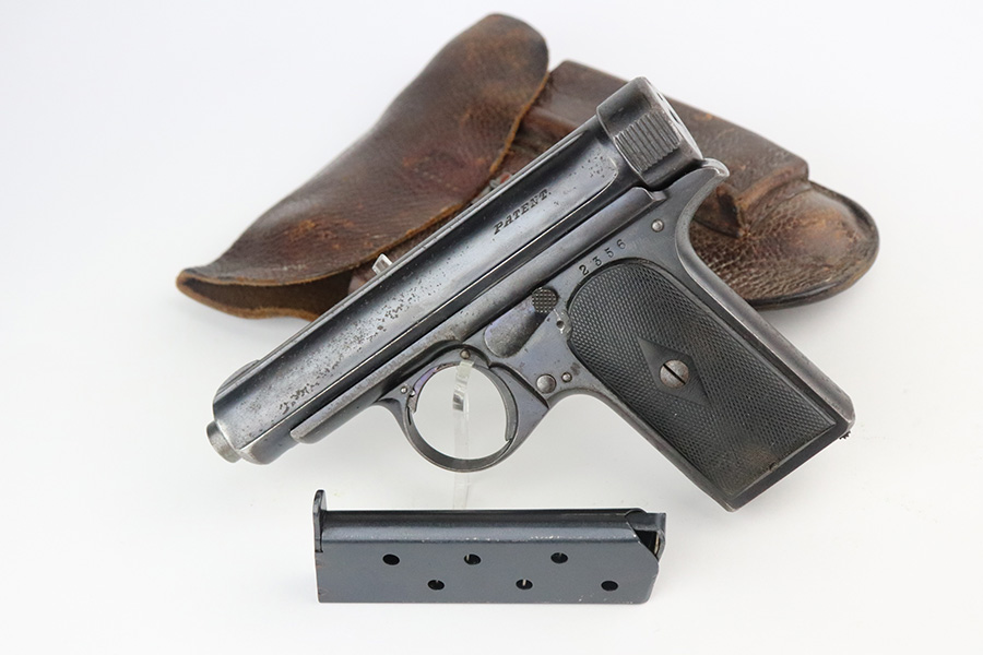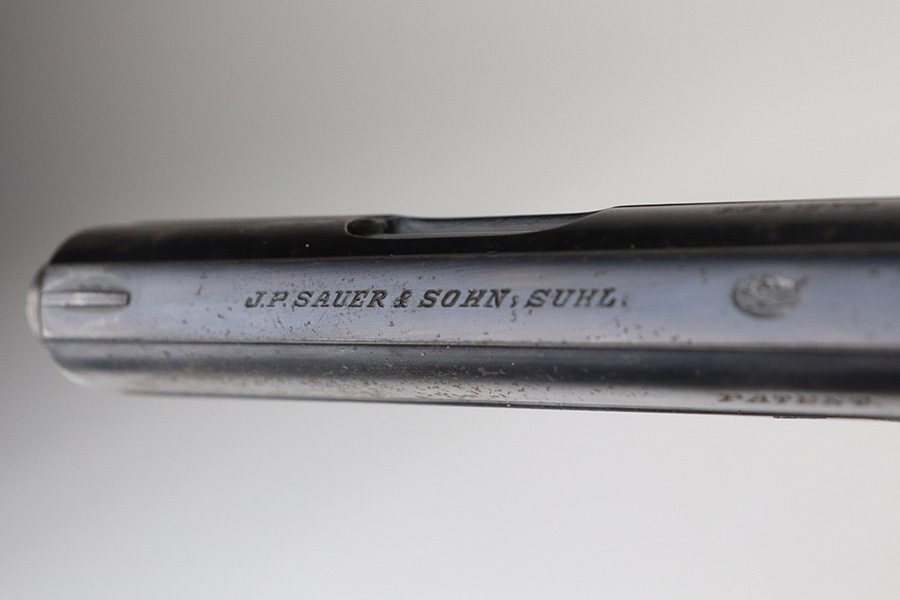 8/16/21 – This is a nice example of an early Sauer Model 1913. This is a first variation example with a magazine safety release button on the left side of the frame. The gun is all matching and has the proper “Crown N” commercial proofs. It comes with a nice period-correct leather holster and one proper magazine. It has retained about 95% of its original finish. There is minor wear on the high edges, wear around the muzzle, and spotty wear on the right side of the slide. There are a few small scratches on the right side of the frame above the trigger guard. While there isn’t much actual finish loss, there is spotty oxidation throughout, most noticeable on the straps and left side of the slide. Comes with slightly worn original grips – small hole in the right panel. The bore has strong rifling with minor frosting in the grooves.