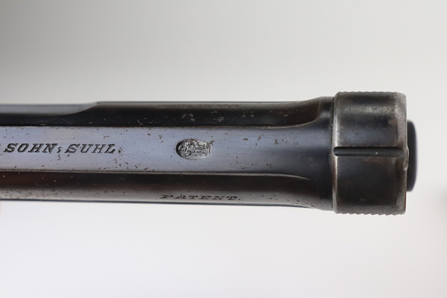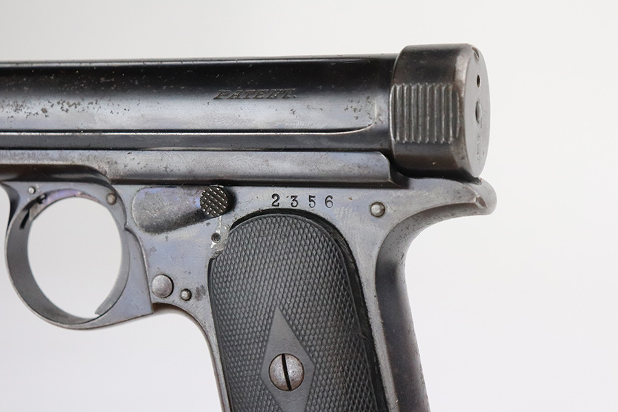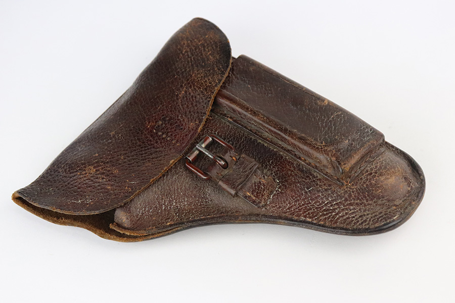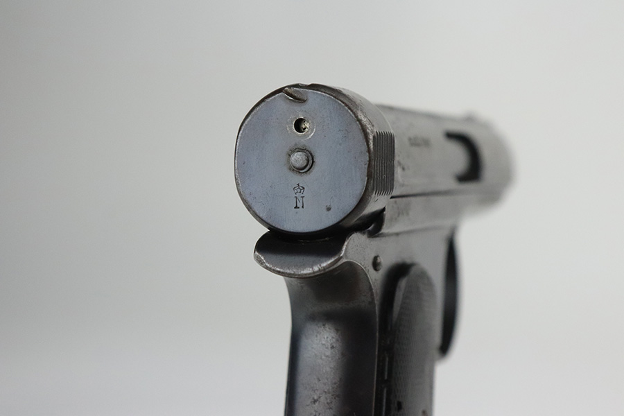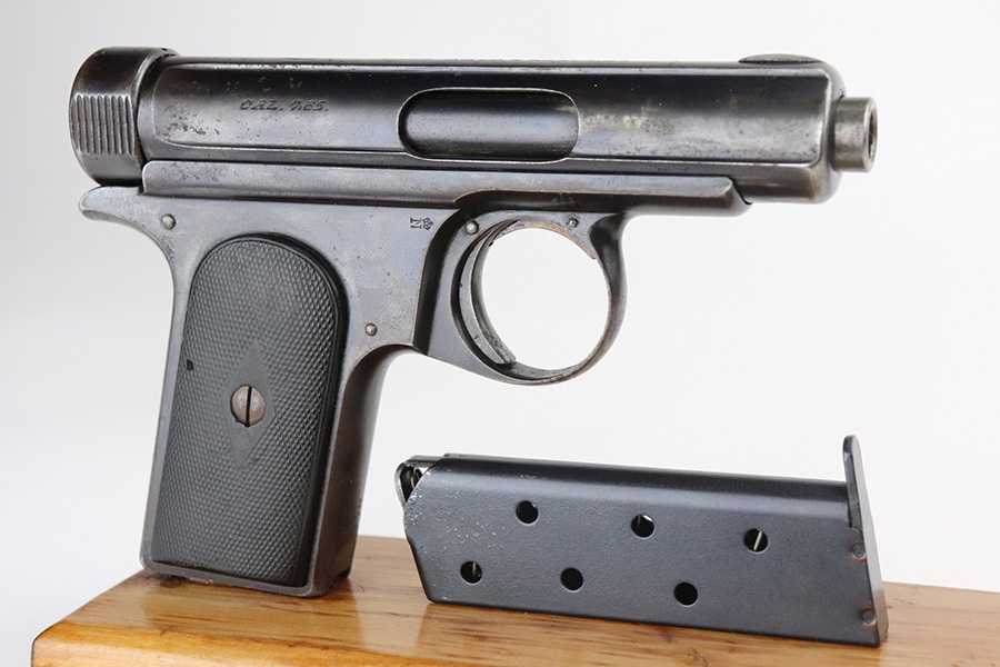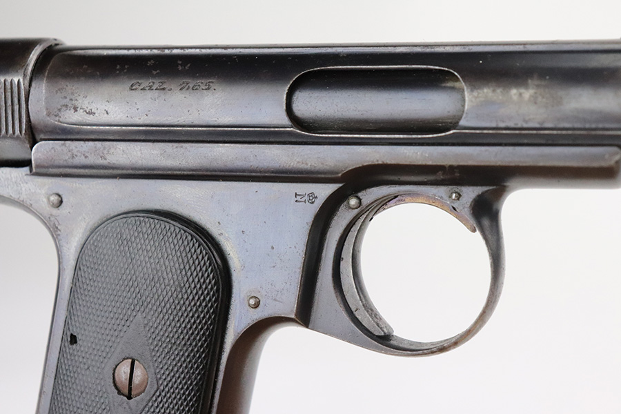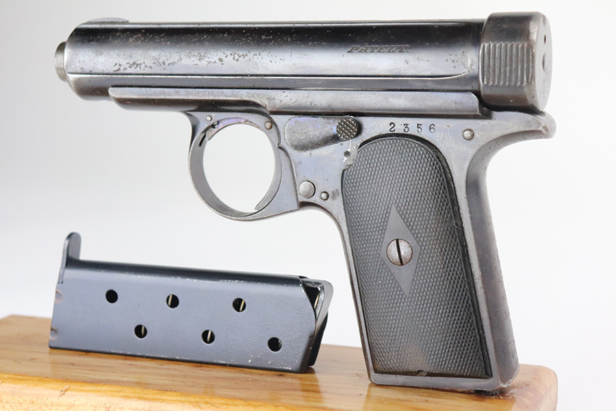 8/16/21 – This is a nice example of an early Sauer Model 1913. This is a first variation example with a magazine safety release button on the left side of the frame. The gun is all matching and has the proper “Crown N” commercial proofs. It comes with a nice period-correct leather holster and one proper magazine. It has retained about 95% of its original finish. There is minor wear on the high edges, wear around the muzzle, and spotty wear on the right side of the slide. There are a few small scratches on the right side of the frame above the trigger guard. While there isn’t much actual finish loss, there is spotty oxidation throughout, most noticeable on the straps and left side of the slide. Comes with slightly worn original grips – small hole in the right panel. The bore has strong rifling with minor frosting in the grooves.