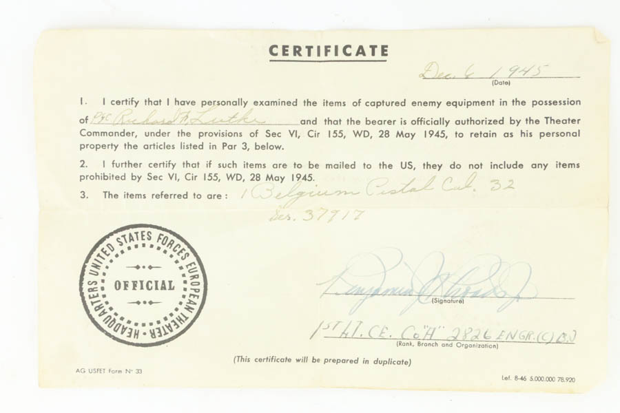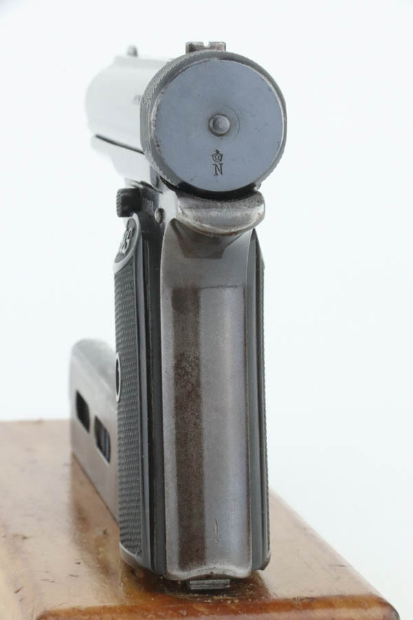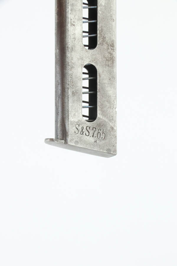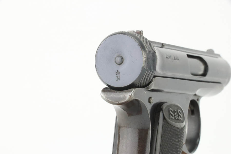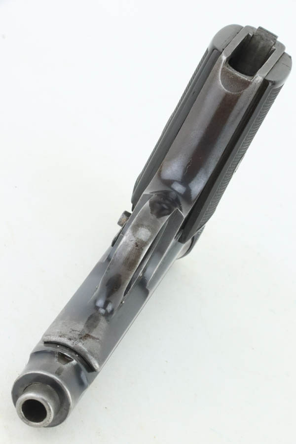 8/16/24 – This is a Sauer Model 1913 pistol from the 1920’s. Chambered in 7.65mm. It is all matching and “Crown N” proofed. This one comes with an original copy of WWII capture paperwork. The document lists this gun by serial number and incorrectly calls it a “Belgium Pistol”. The gun itself has retained roughly 85% of its original finish. The majority of the wear is around the muzzle and along both sides of the slide. Brown patina on the grip straps and a few small marks on the right side of the frame. Fitted with black bakelite grips and comes with one proper magazine. The bore shows pitting throughout.