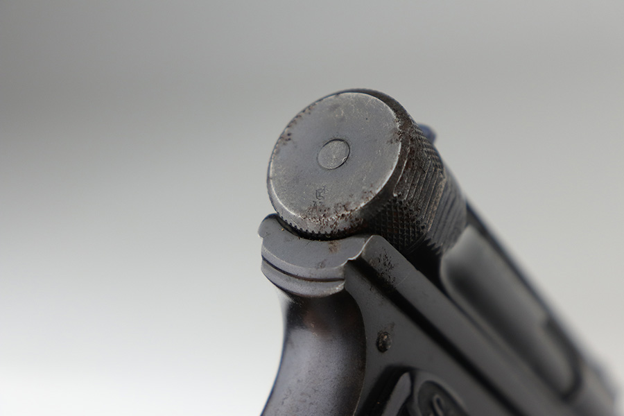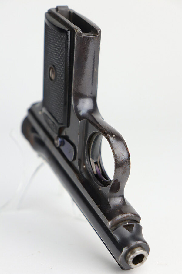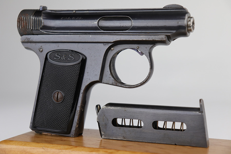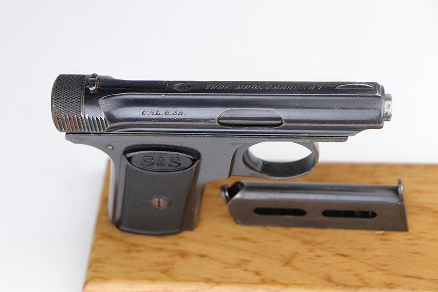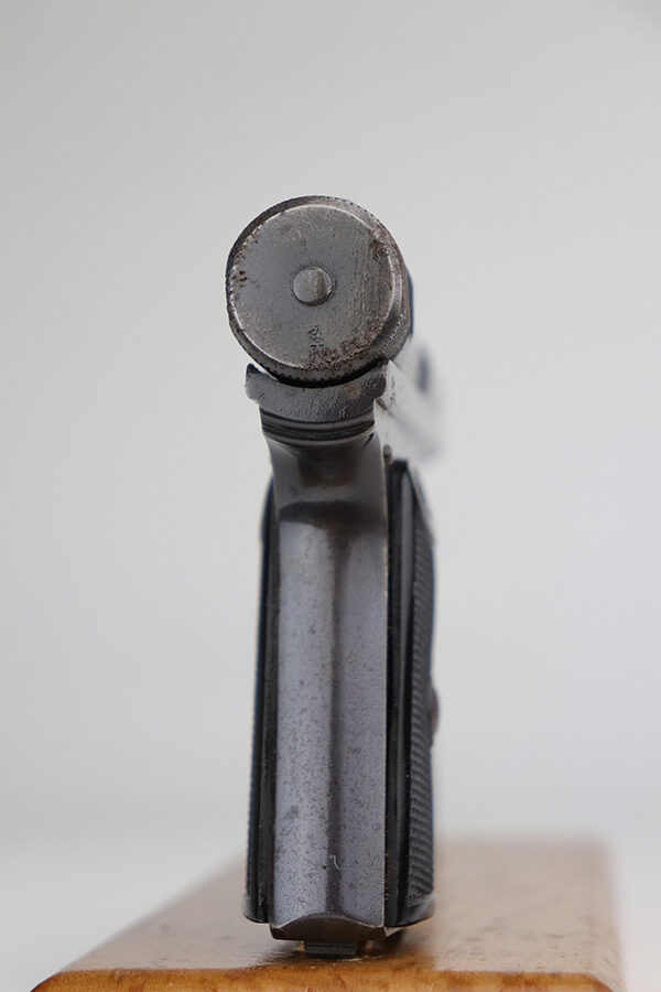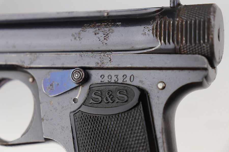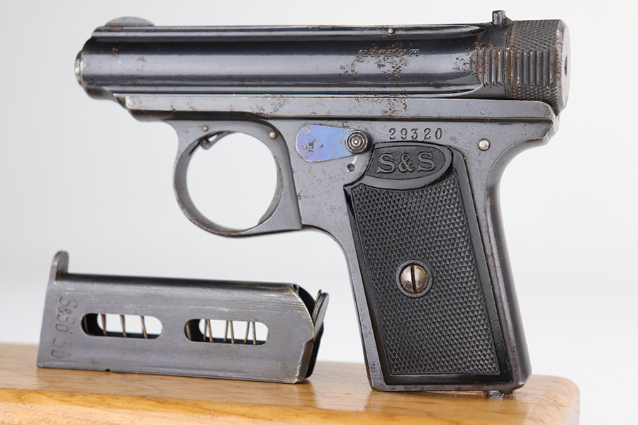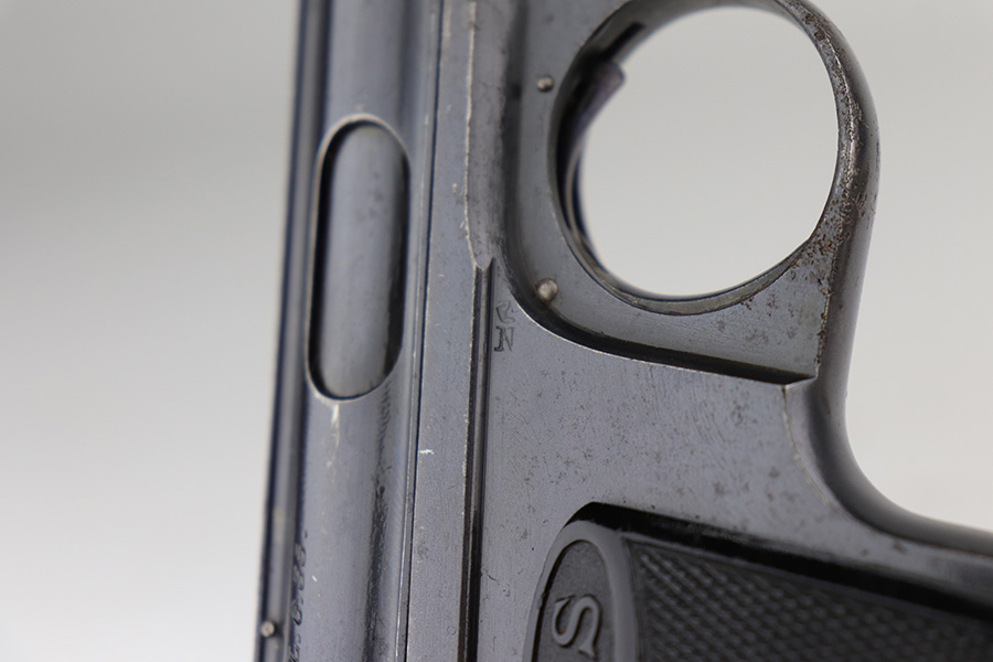 9/10/21 – This is a nice example of a Sauer Model 1919, chambered in .25 ACP. It is all matching and has the proper “Crown N” commercial proofs. It has retained about 96% of its original finish with minor wear along the high edges and around the muzzle. While there isn’t much actual finish loss, there are areas of pitting throughout, most noticeable on the left side of the gun and on the front strap. Comes with excellent black bakelite grips and a proper magazine. The bore is mint.