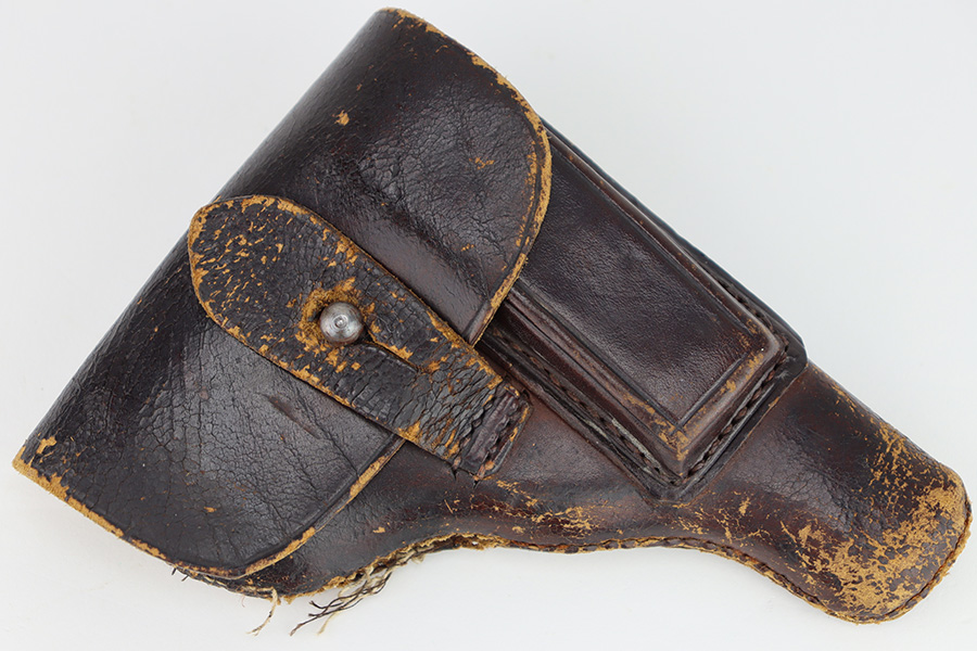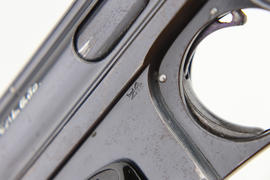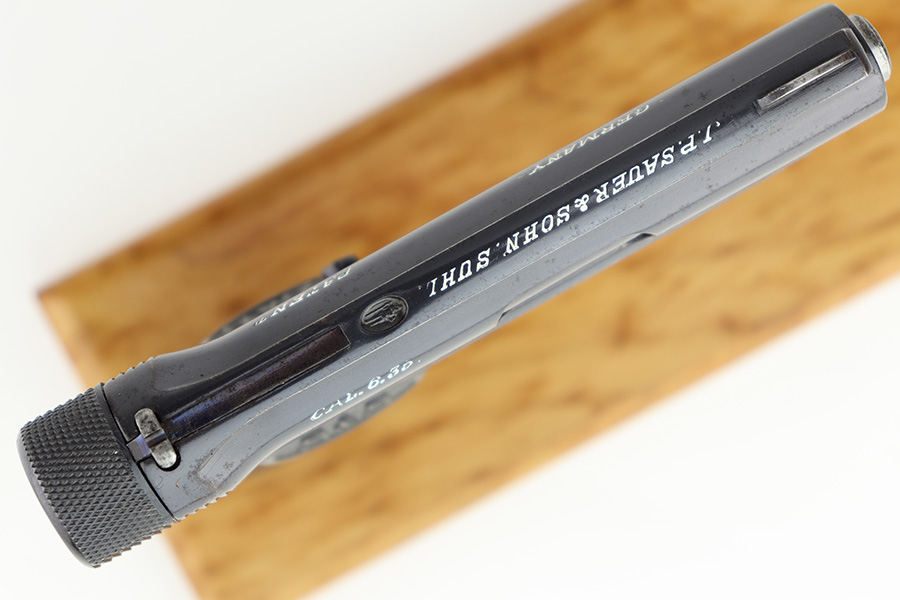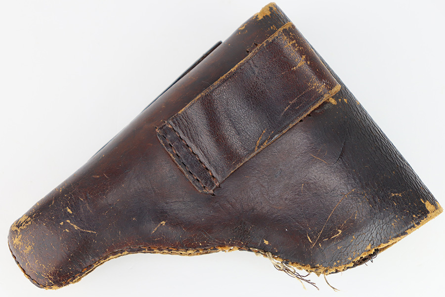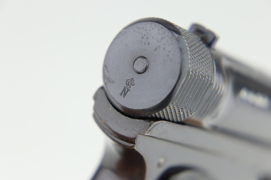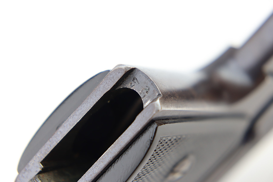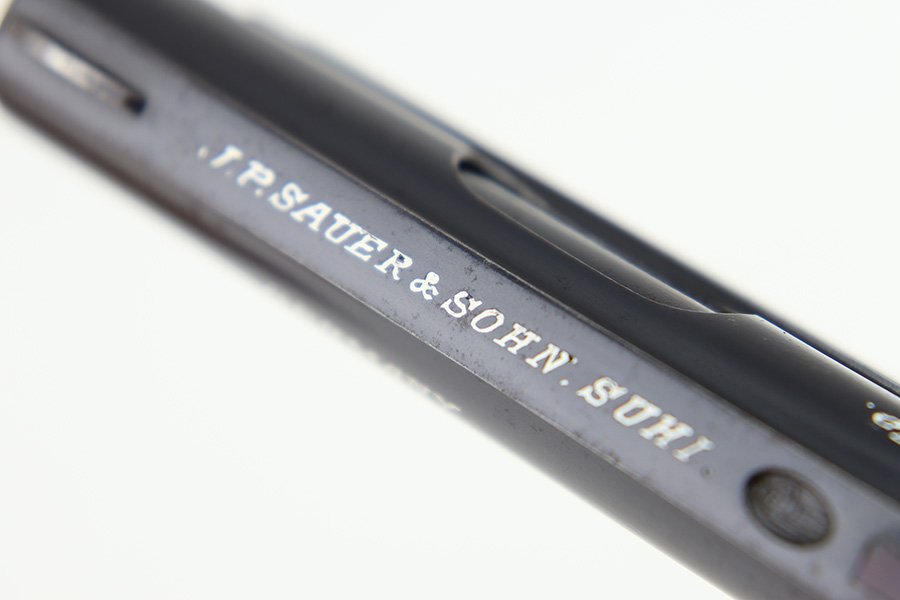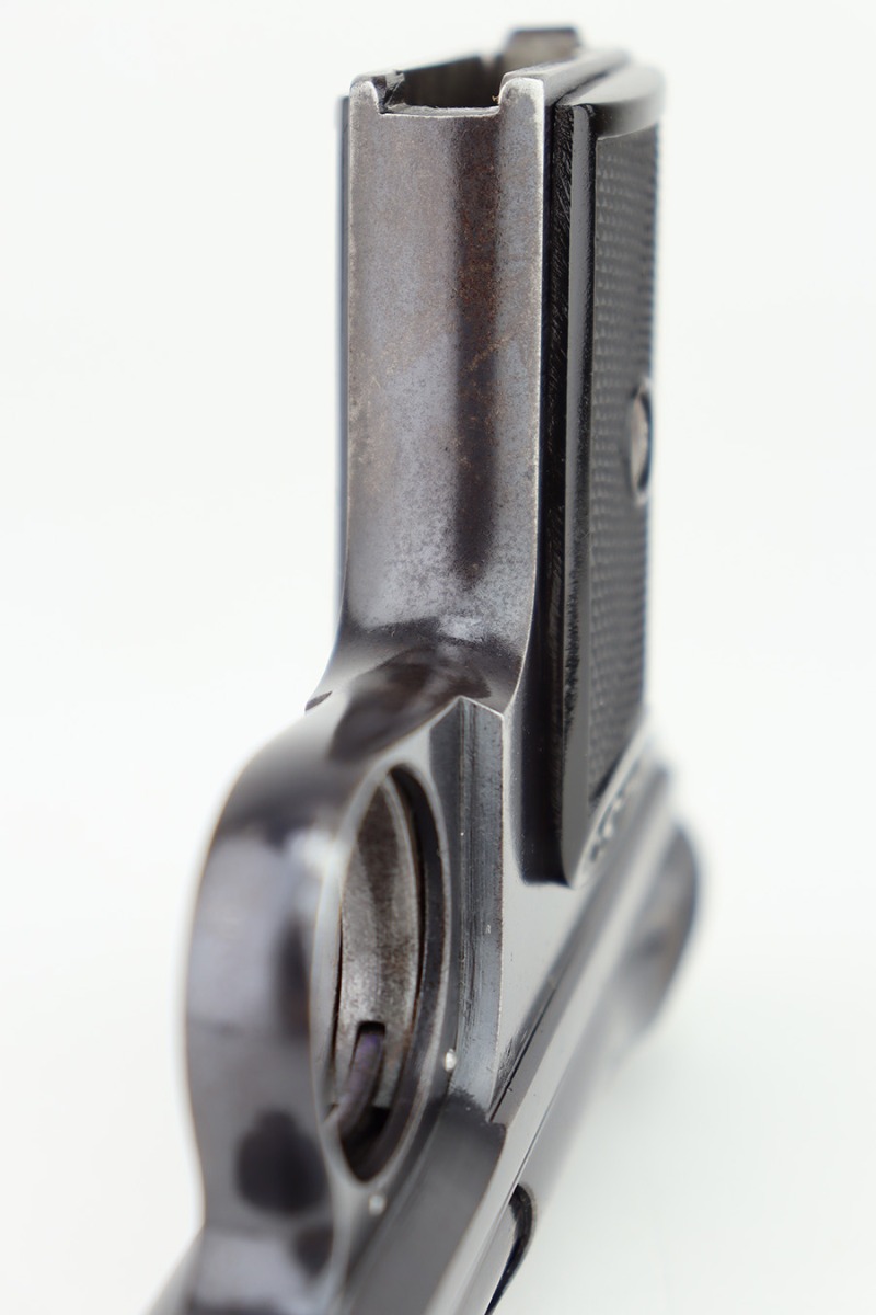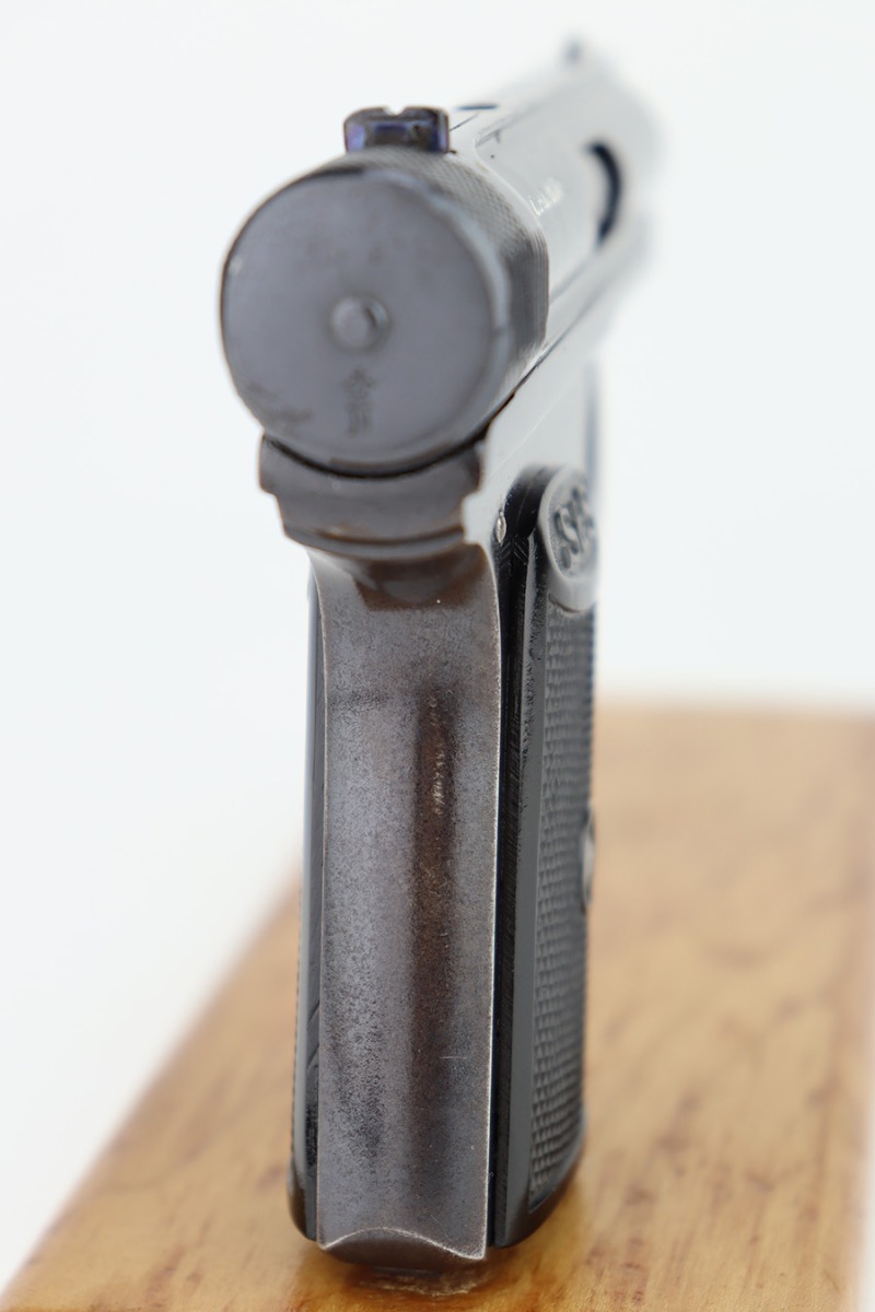 12/1/23 – This is a first-variation Sauer Model 1919 sold in the commercial market in the 1920’s. All matching and properly “Crown N” proofed. It comes as a rig with one proper magazine and a worn holster – the stitching along the main seam of the holster is missing. The gun itself has retained about 94% of its original finish. Minor high edge wear, some small spots of tiny pitting here and there, and some dulling / pin-pricking on the grip straps. Fitted with period-correct black bakelite grips. The bore has good rifling with minor pin-pricking throughout.