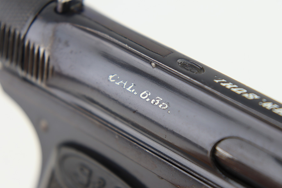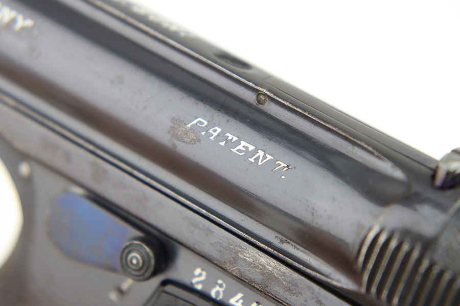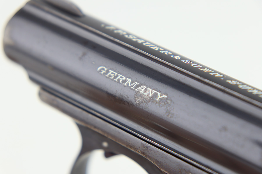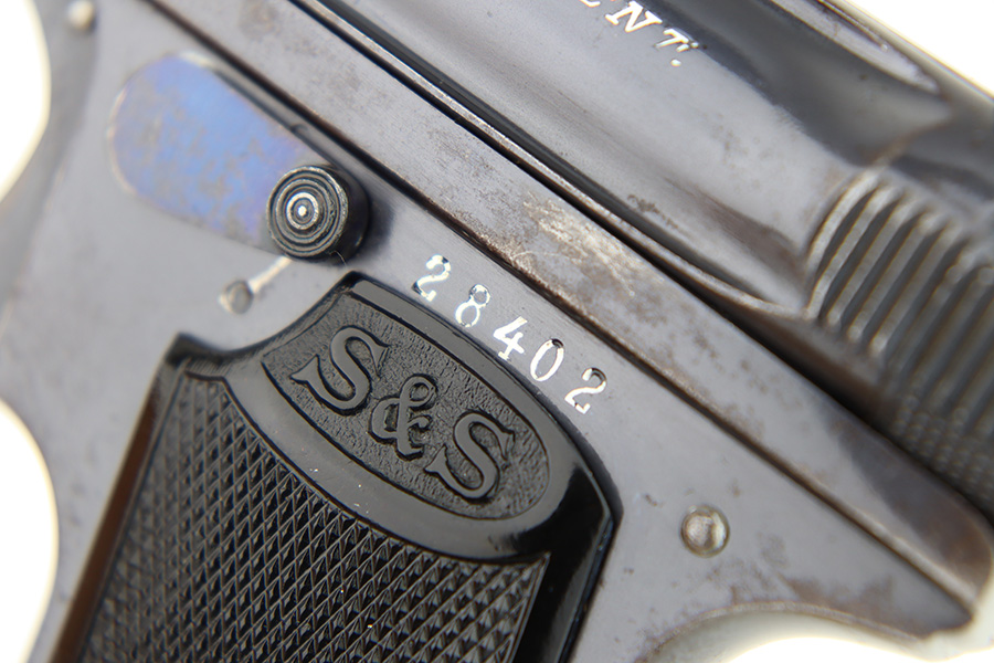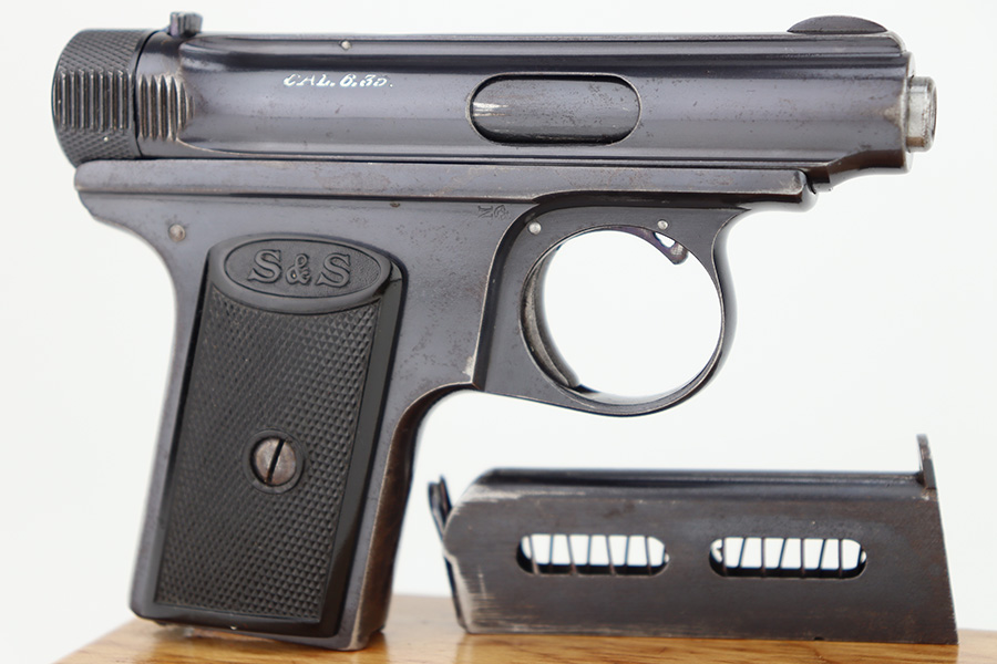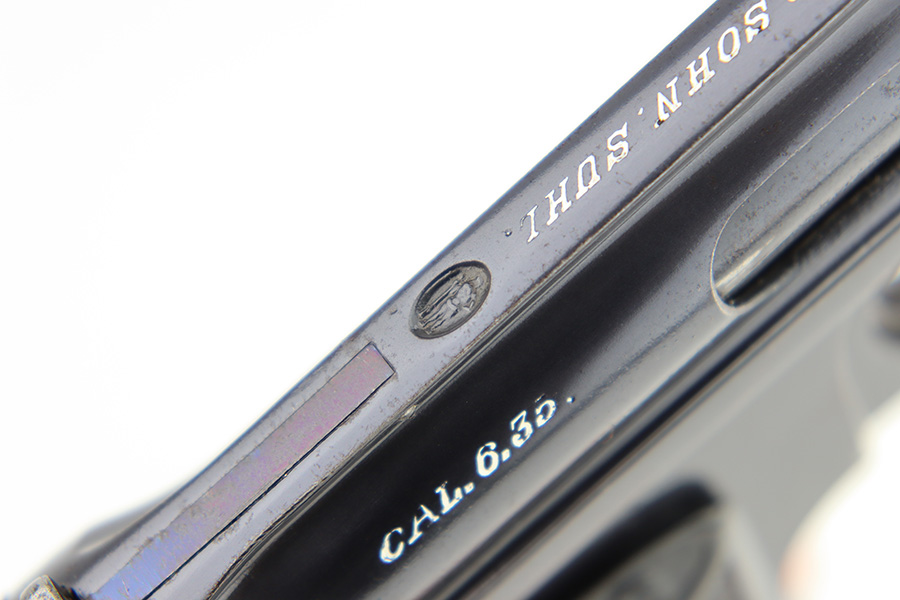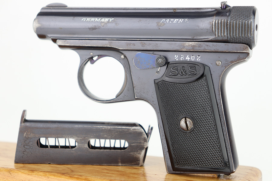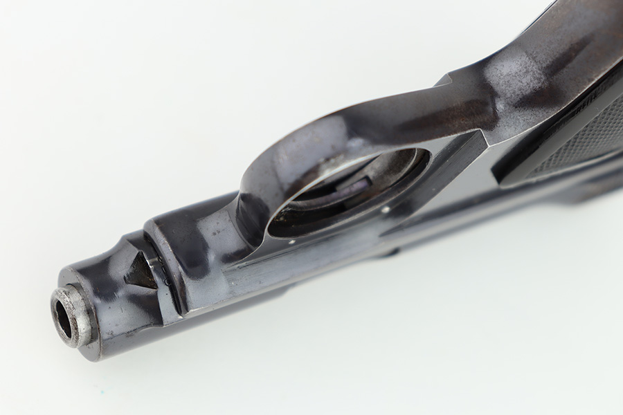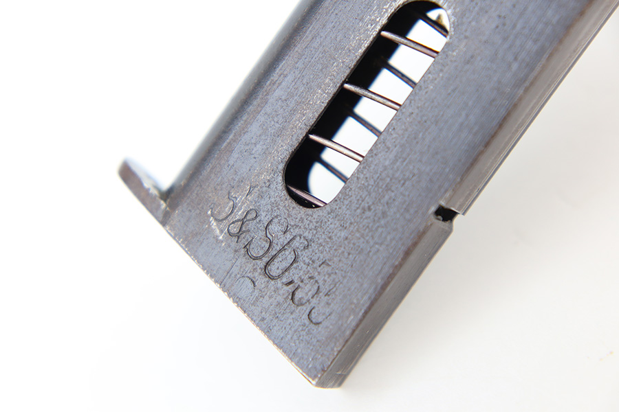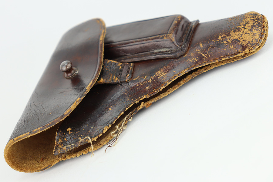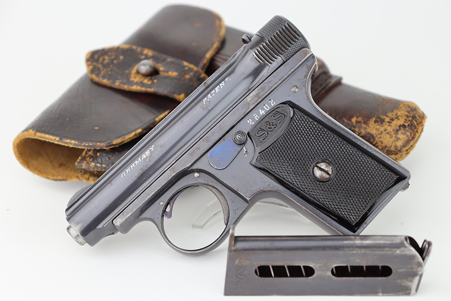 12/1/23 – This is a first-variation Sauer Model 1919 sold in the commercial market in the 1920’s. All matching and properly “Crown N” proofed. It comes as a rig with one proper magazine and a worn holster – the stitching along the main seam of the holster is missing. The gun itself has retained about 94% of its original finish. Minor high edge wear, some small spots of tiny pitting here and there, and some dulling / pin-pricking on the grip straps. Fitted with period-correct black bakelite grips. The bore has good rifling with minor pin-pricking throughout.