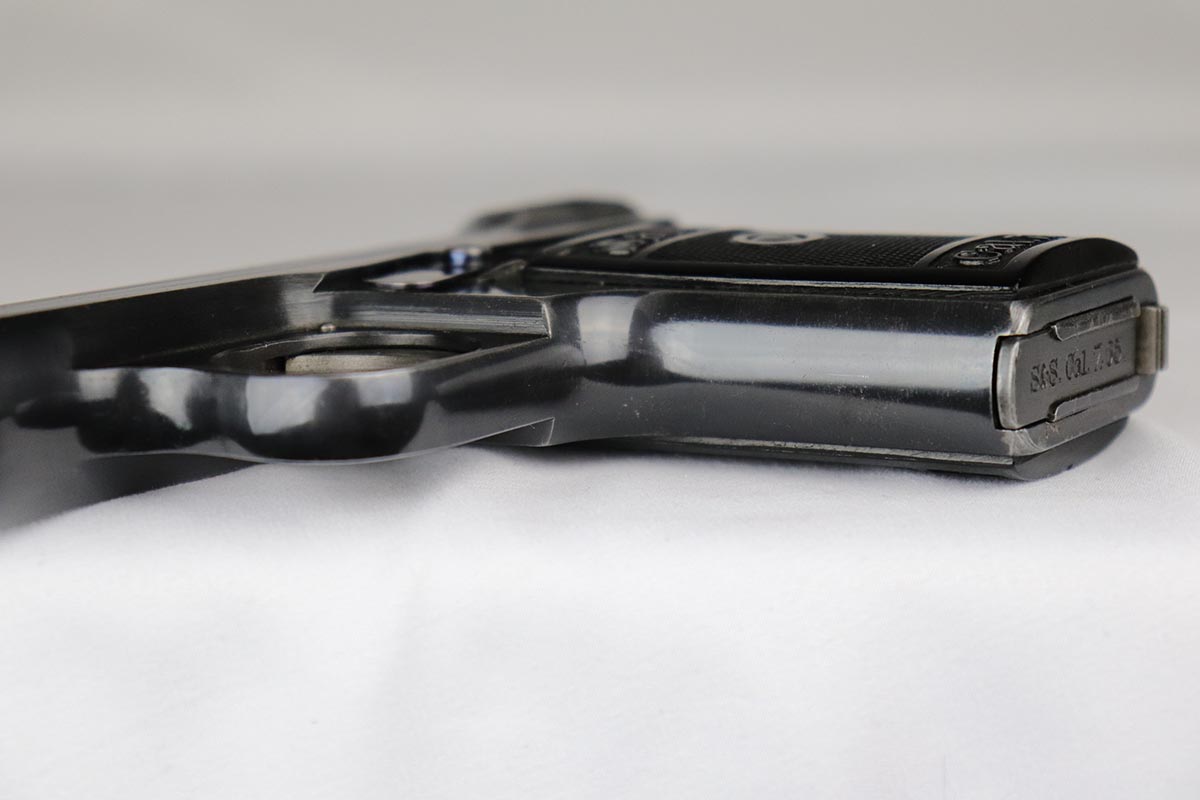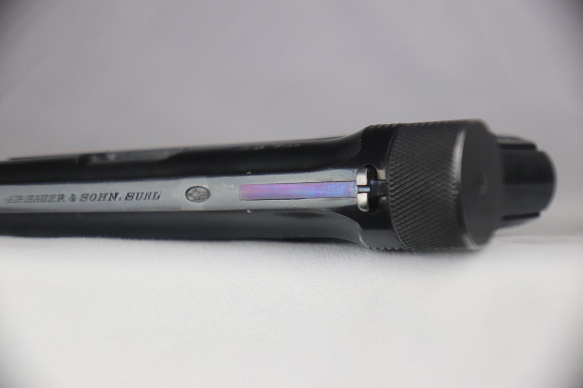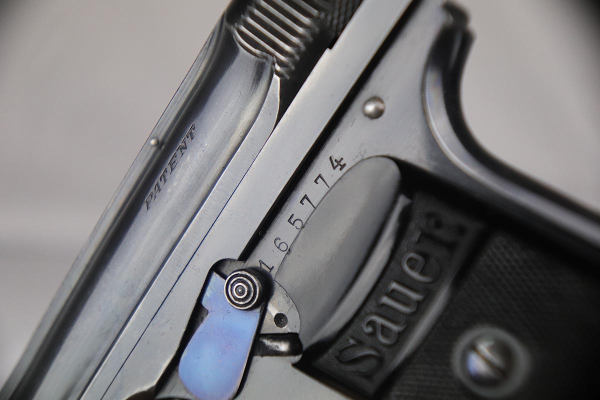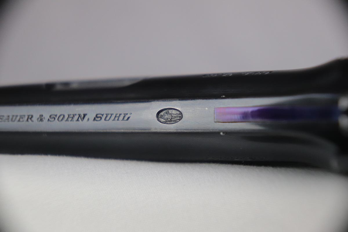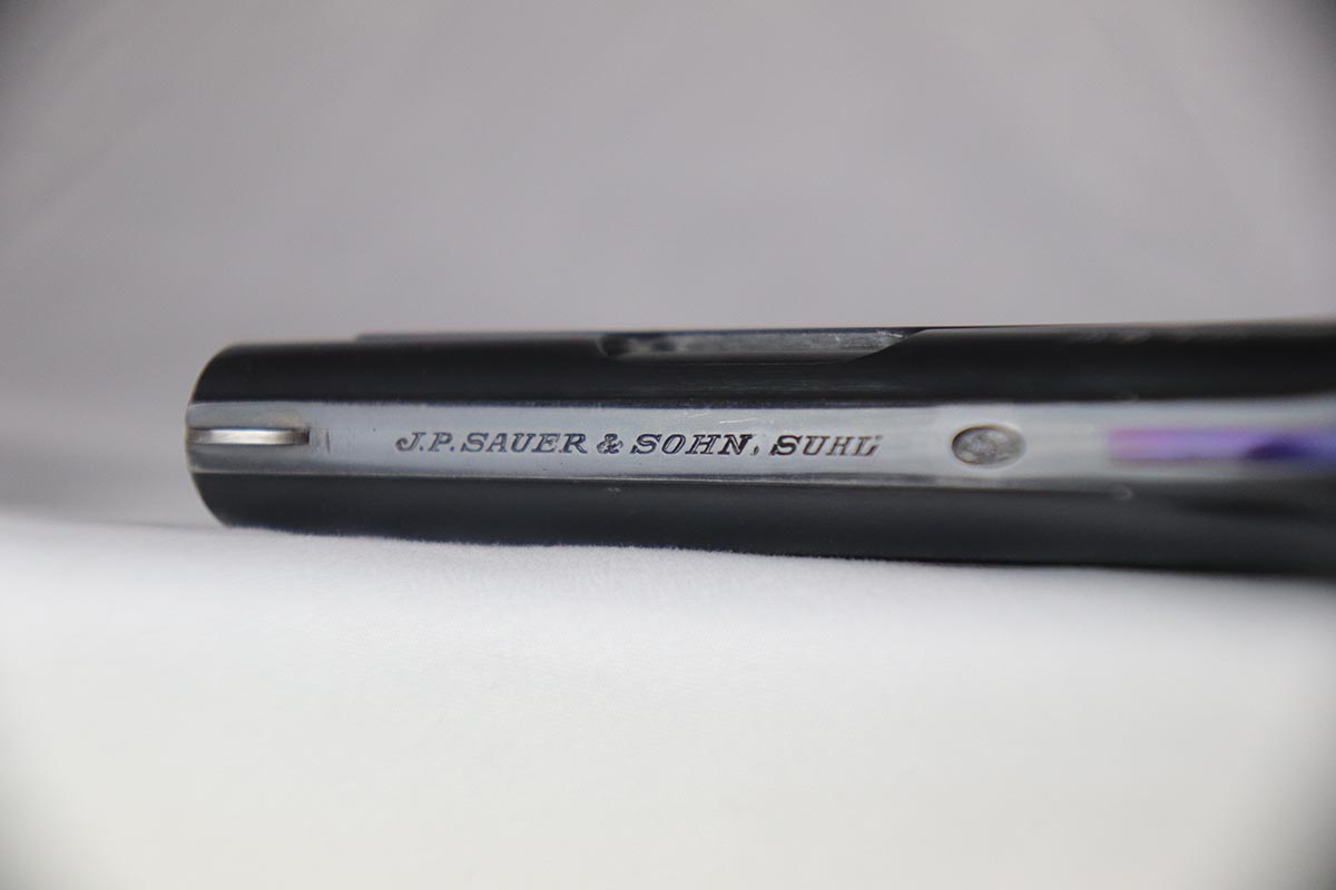 2/6/20 – This is a very rare Sauer modell 1926 export, one of only 3,000-4,000 of this variation produced, and not a lot is known about them.  This one has the telltale characteristics that separate it from the 1919 model and the 1929/30.  The serrations on the cocking knob continue to the slide, and the trigger guard is the (correct) later oval shape.  This one is all original and correct with about 94% high-polish blue remaining.  The wear is evenly distributed on either side of the slide, likely from a holster.  Minty grips and excellent bore.  Proper magazine.