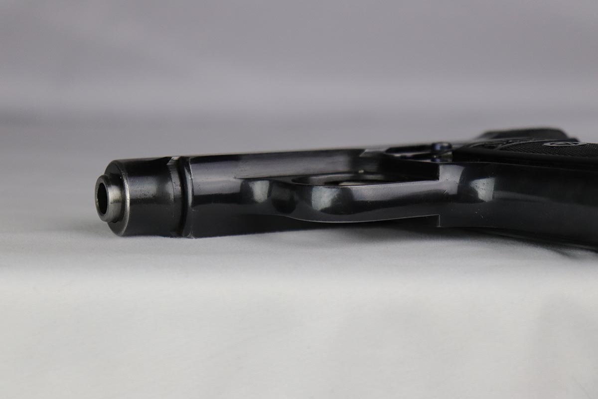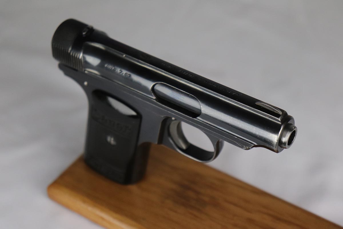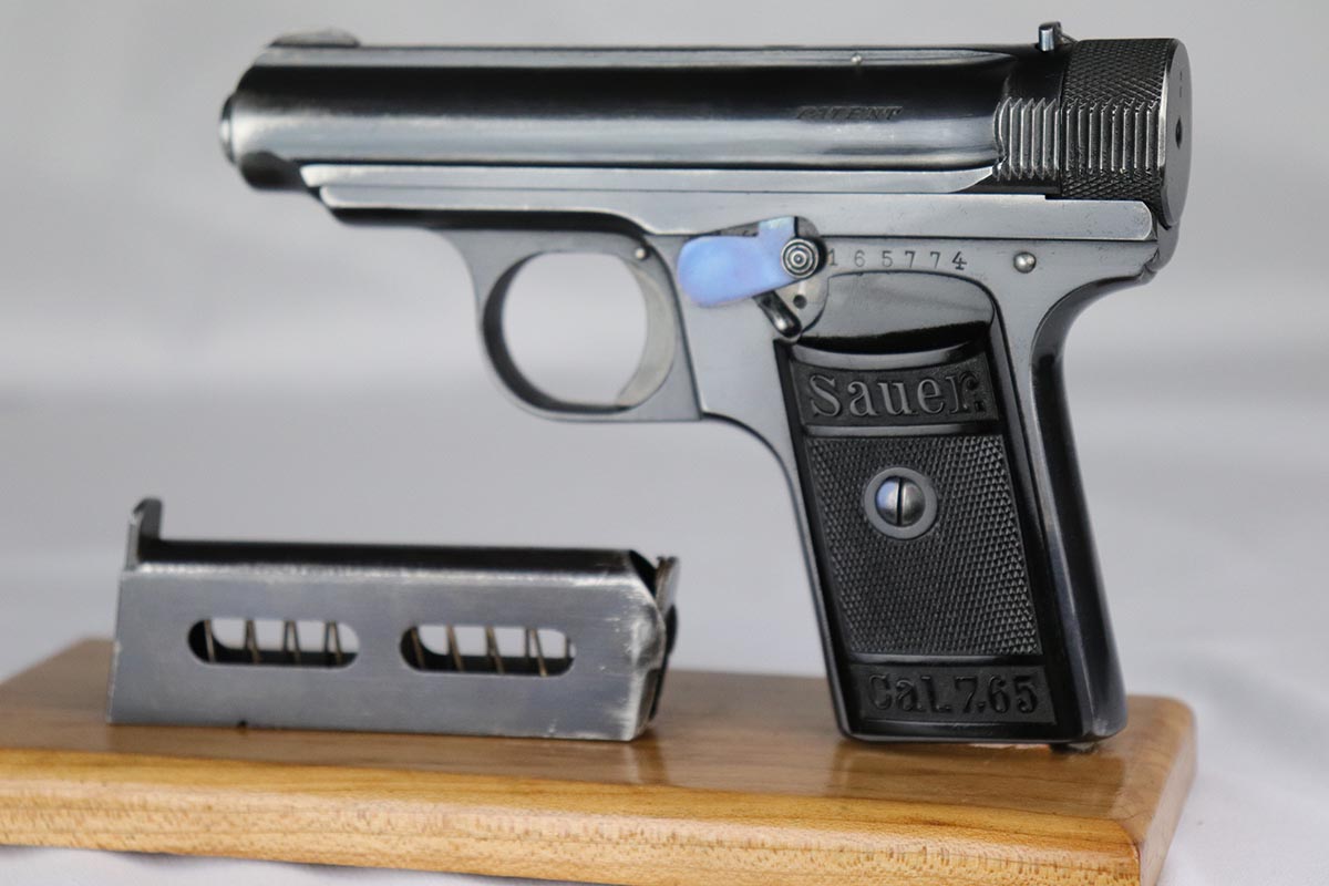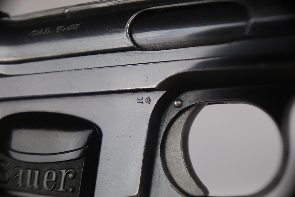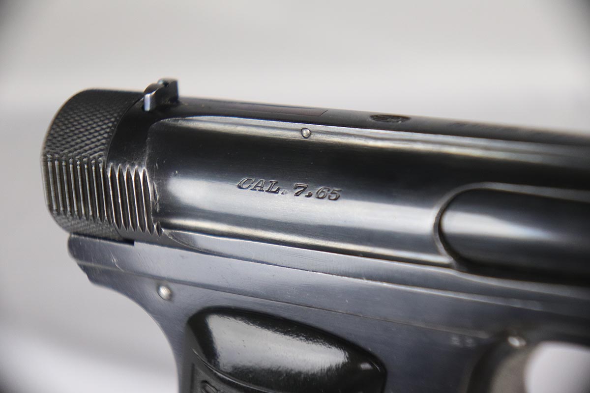 2/6/20 – This is a very rare Sauer modell 1926 export, one of only 3,000-4,000 of this variation produced, and not a lot is known about them.  This one has the telltale characteristics that separate it from the 1919 model and the 1929/30.  The serrations on the cocking knob continue to the slide, and the trigger guard is the (correct) later oval shape.  This one is all original and correct with about 94% high-polish blue remaining.  The wear is evenly distributed on either side of the slide, likely from a holster.  Minty grips and excellent bore.  Proper magazine.