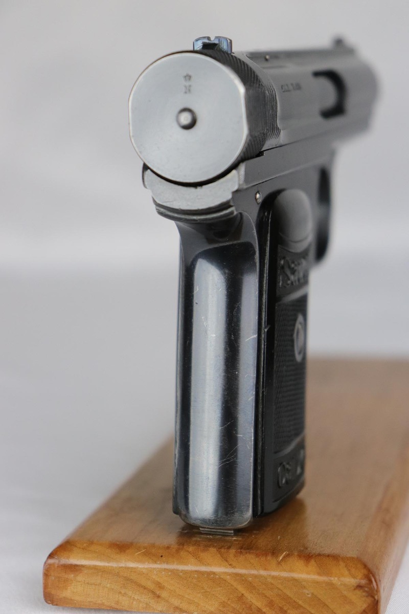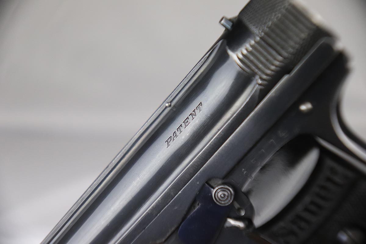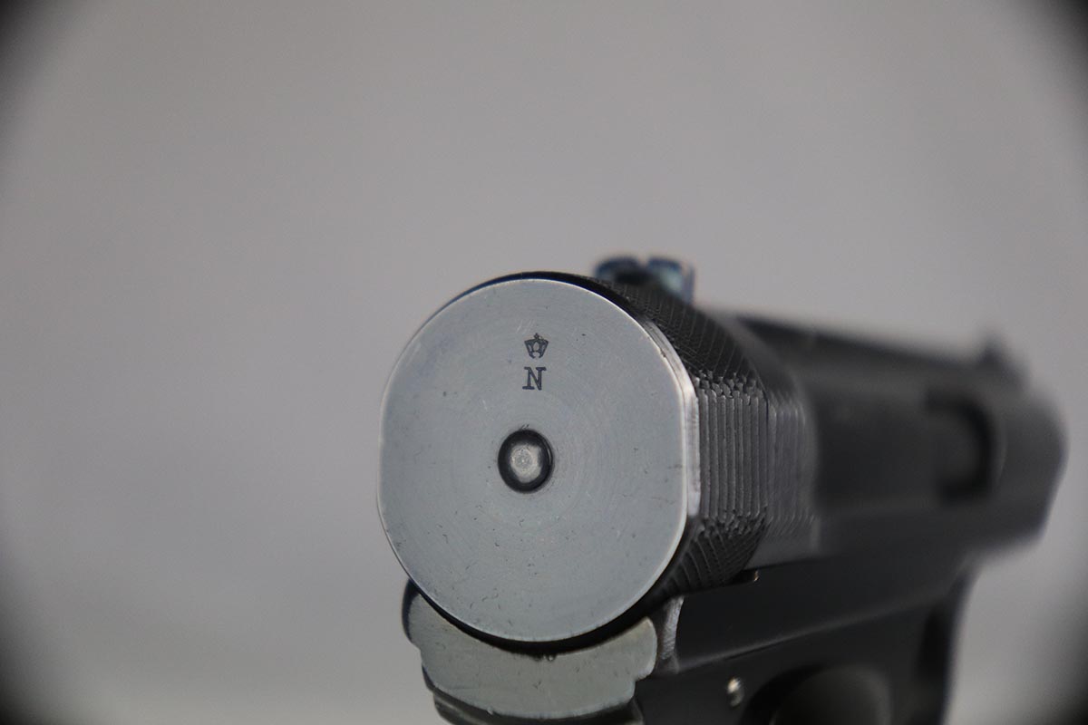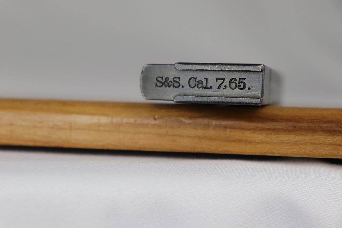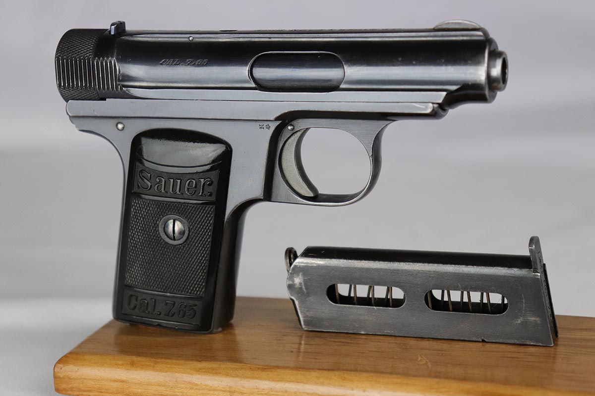 2/6/20 – This is a very rare Sauer modell 1926 export, one of only 3,000-4,000 of this variation produced, and not a lot is known about them.  This one has the telltale characteristics that separate it from the 1919 model and the 1929/30.  The serrations on the cocking knob continue to the slide, and the trigger guard is the (correct) later oval shape.  This one is all original and correct with about 94% high-polish blue remaining.  The wear is evenly distributed on either side of the slide, likely from a holster.  Minty grips and excellent bore.  Proper magazine.