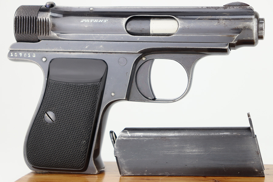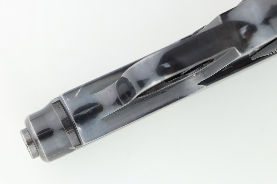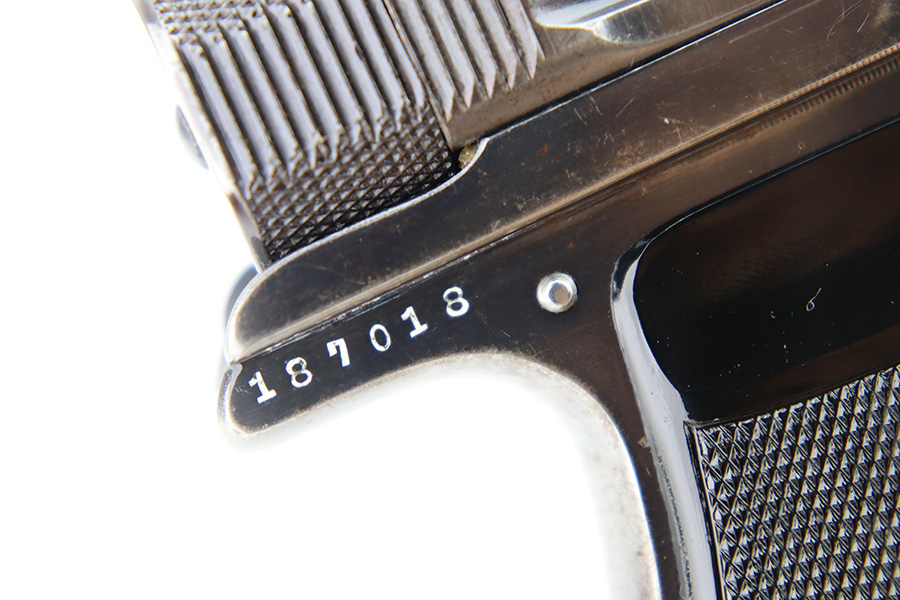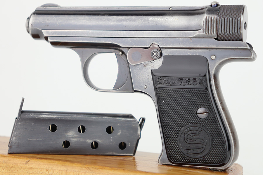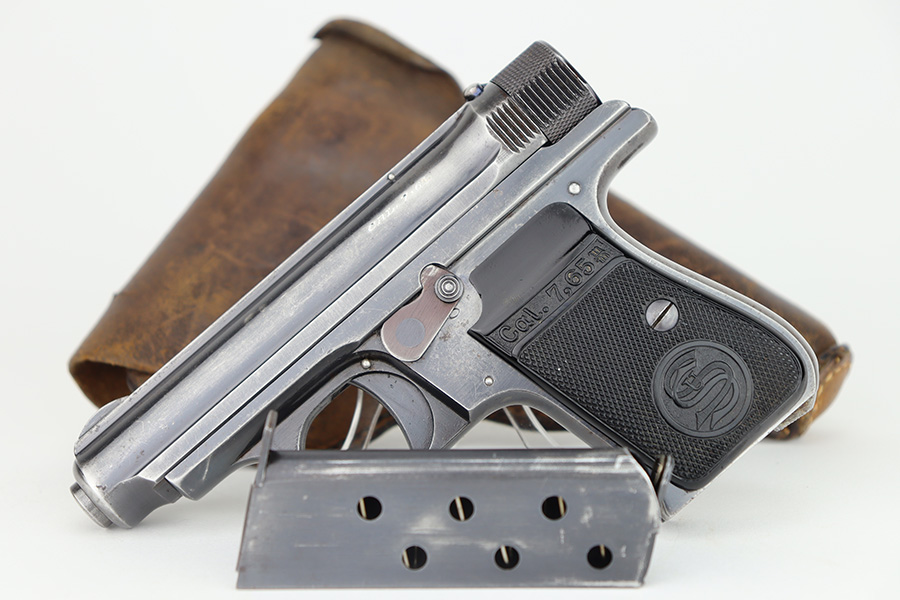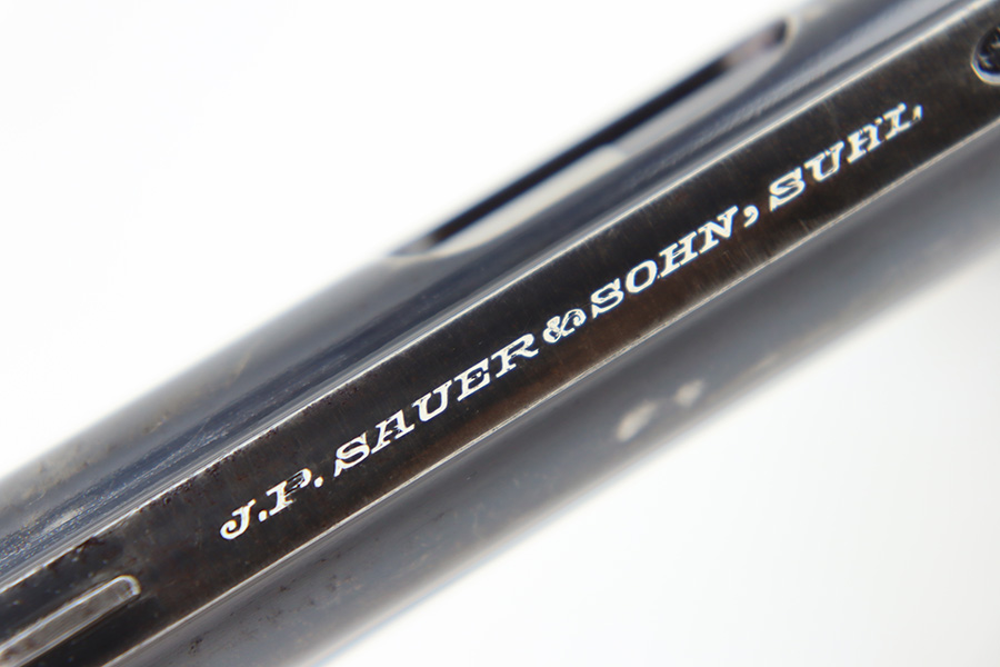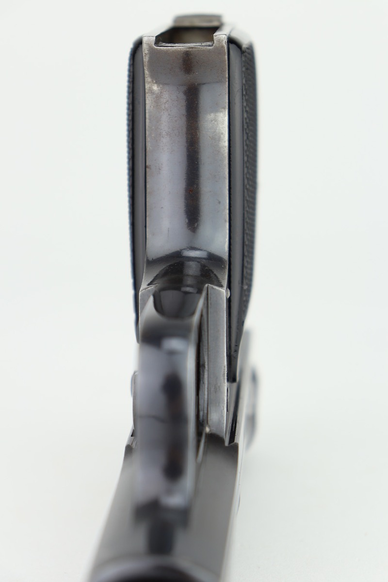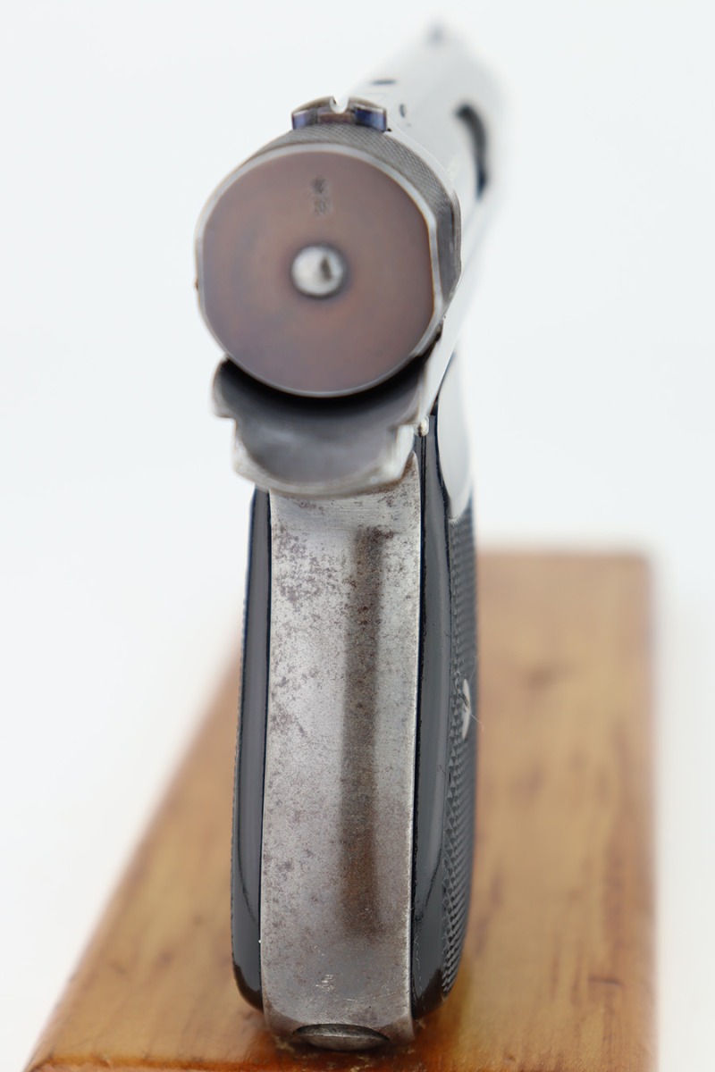 12/1/23 – This is a Sauer Model 1930 sold in the commercial market in the 1930’s. All matching and “Crown N” proofed. Comes as a rig with a thin leather holster and one proper magazine. The gun itself has retained roughly 75% of its original high polish finish. Minor spotty wear throughout and noticeable finish loss on the rear grip strap. Fitted with period-correct black bakelite grips. Excellent bore with strong rifling.