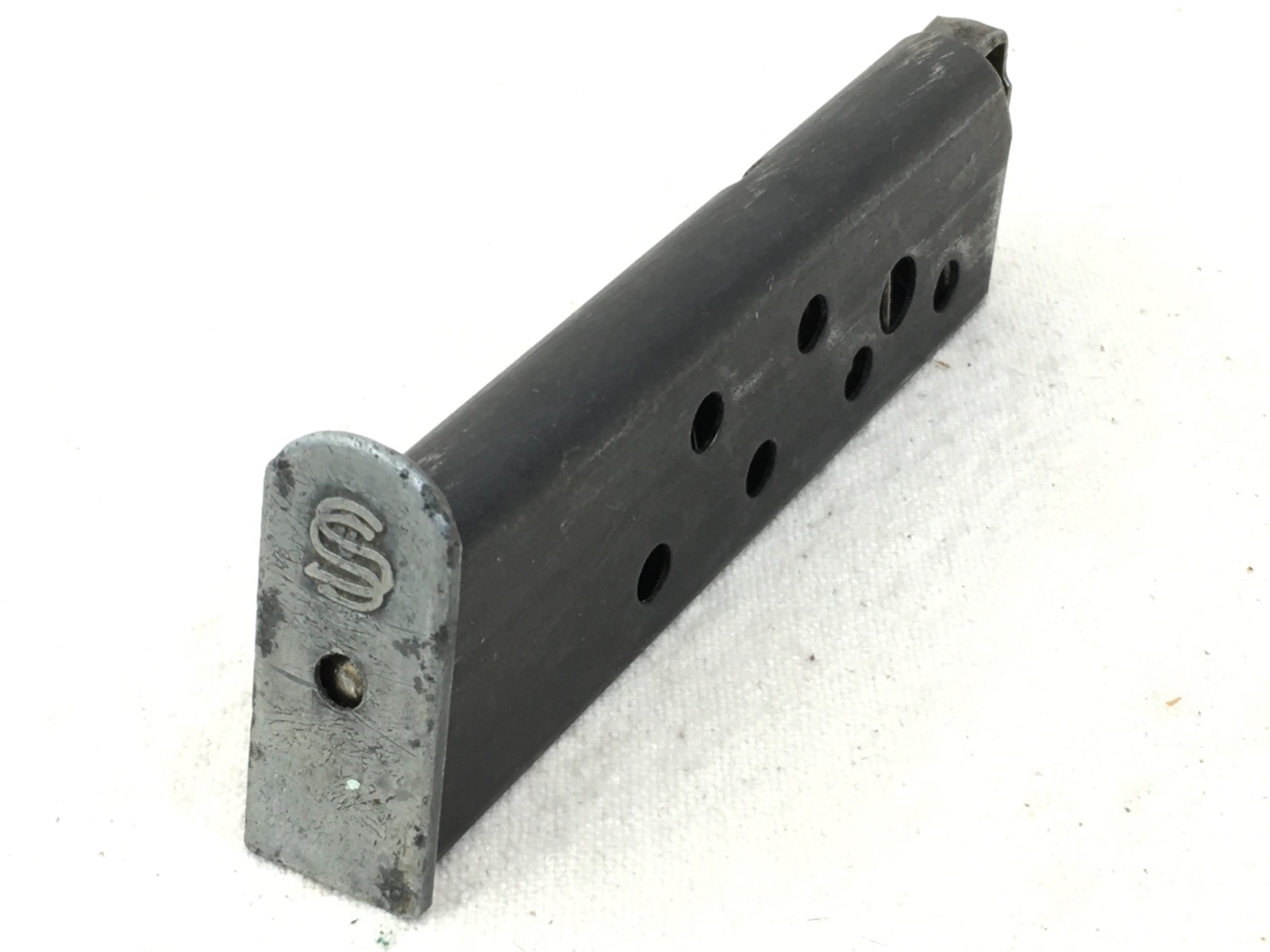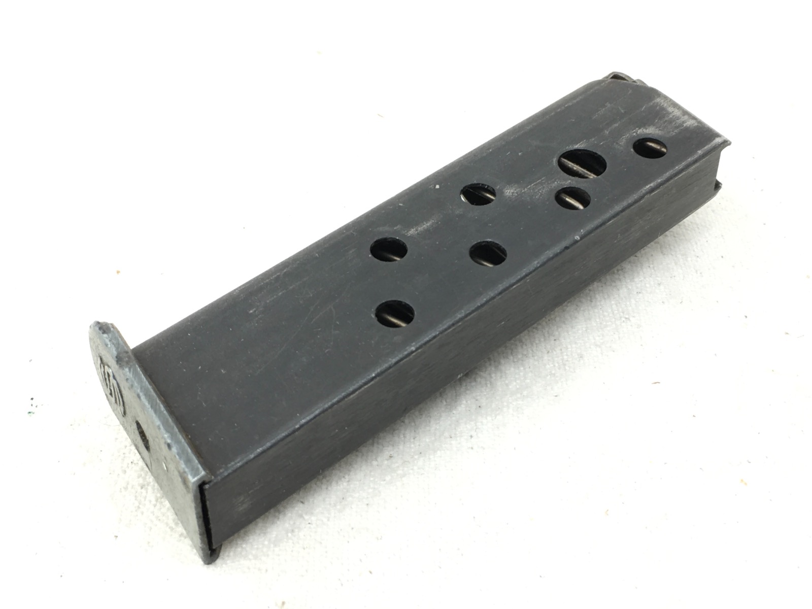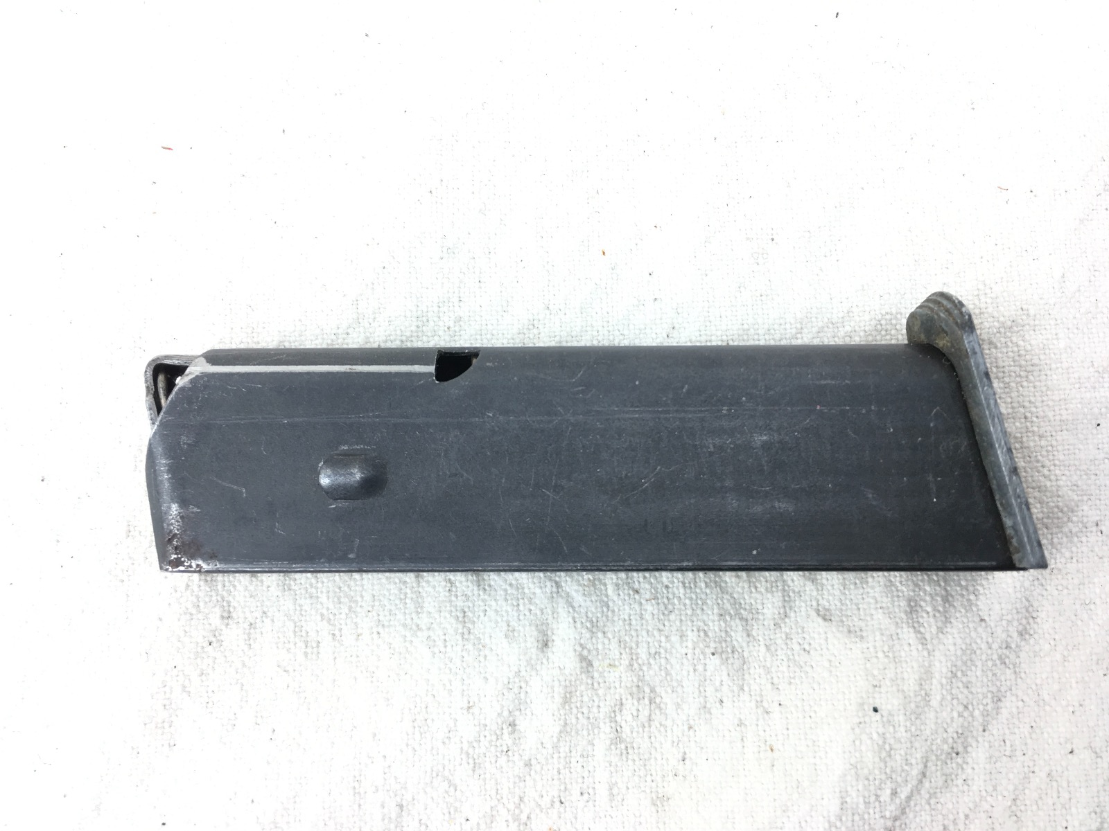 1/16/19 – This is a slightly rare, desirable Sauer 38h magazine with a zinc base. The base is stamped with the Sauer double S logo, and is a light zinc color. The magazine frame is blued and slightly discolored in a few small areas, but there is no rust or pitting. The spring is strong and fully functional. Guaranteed original.