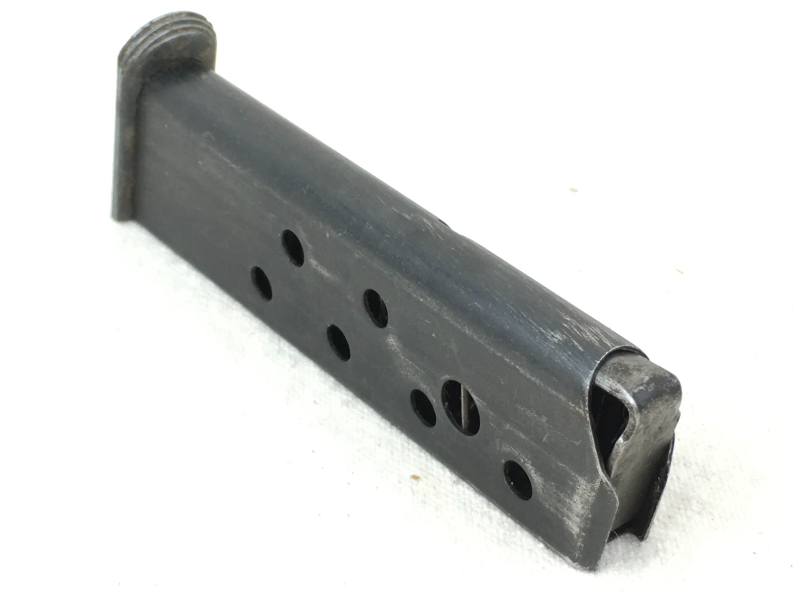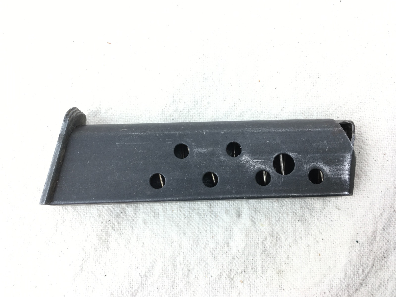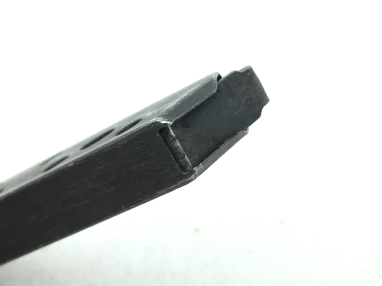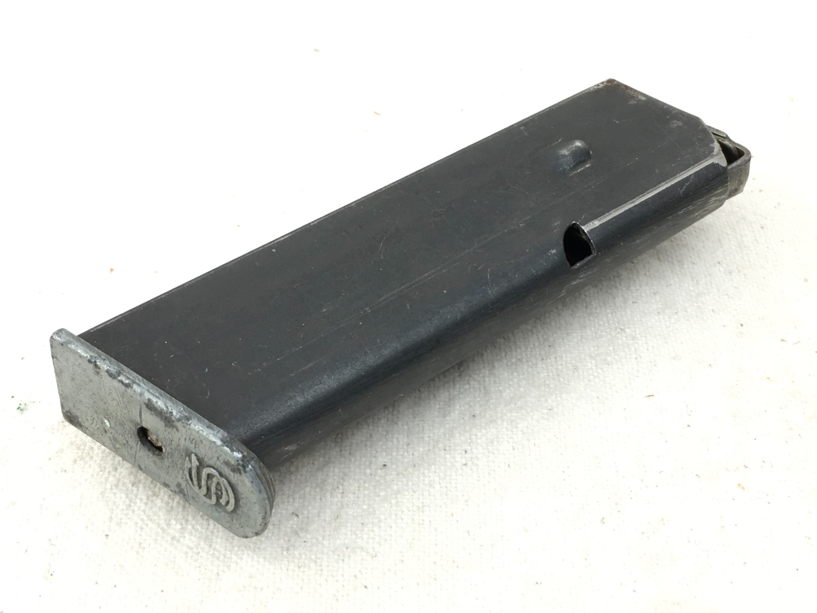 1/16/19 – This is a slightly rare, desirable Sauer 38h magazine with a zinc base. The base is stamped with the Sauer double S logo, and is a light zinc color. The magazine frame is blued and slightly discolored in a few small areas, but there is no rust or pitting. The spring is strong and fully functional. Guaranteed original.