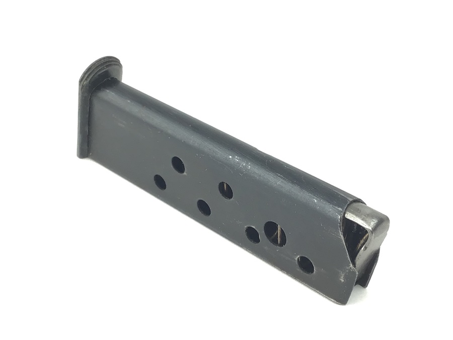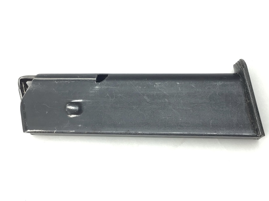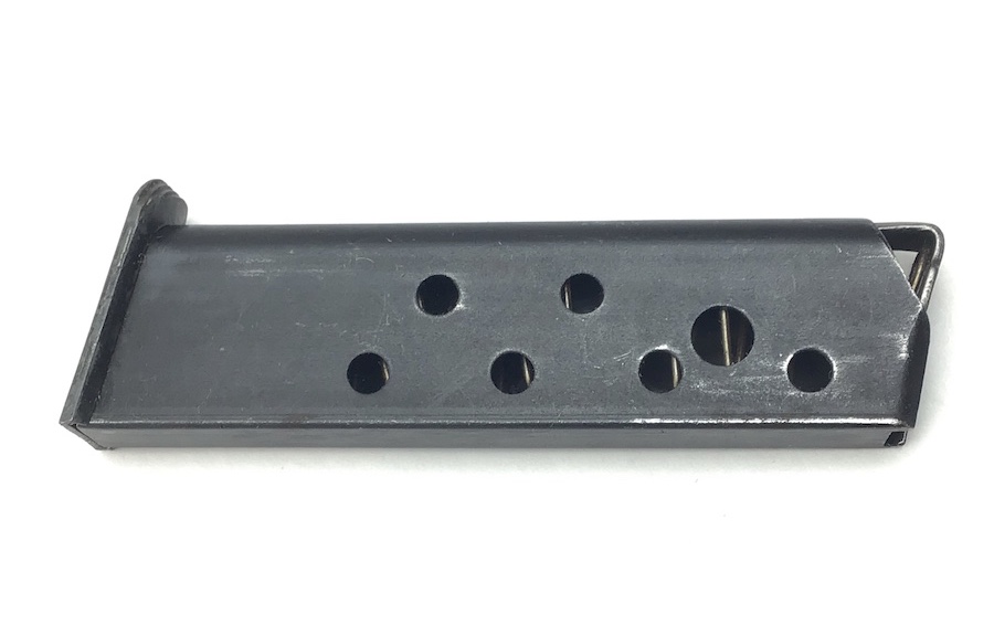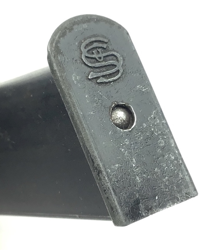2/3/21 – This is a slightly rare, desirable Sauer 38h magazine with a zinc base. The base is stamped with the Sauer double S logo. The magazine frame is blued and slightly discolored in a few small areas, but there is no rust or pitting. The spring is strong and fully functional. Guaranteed original.
