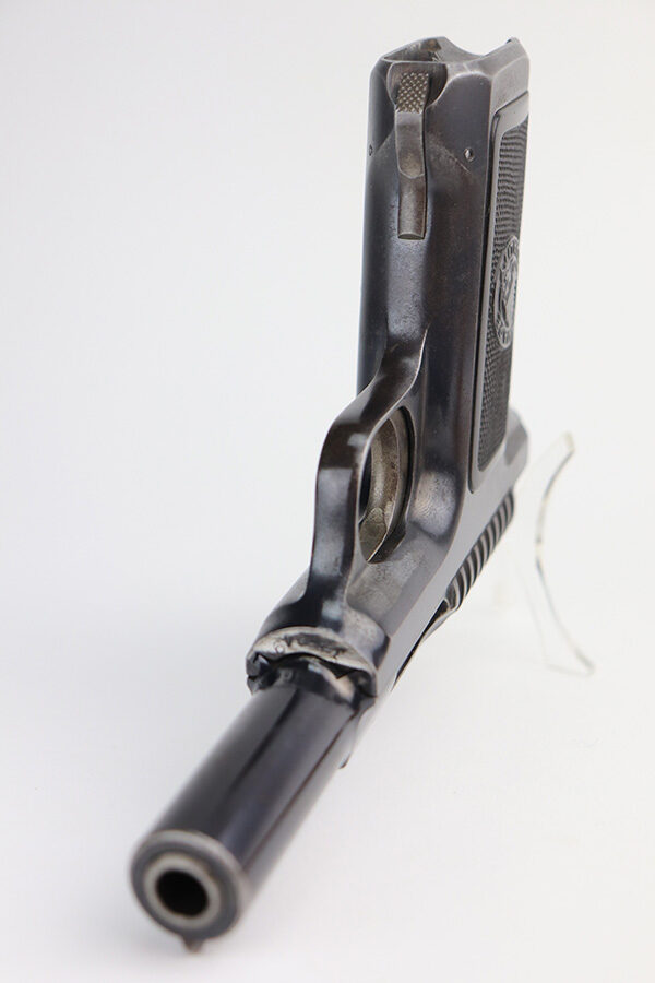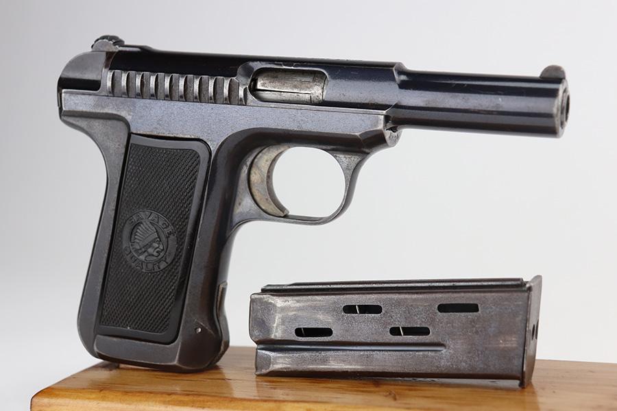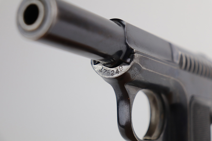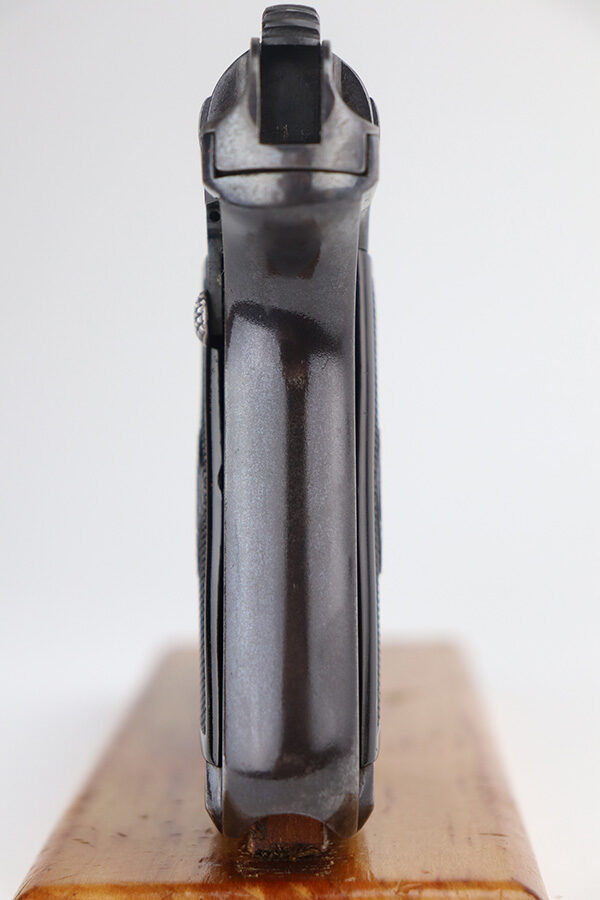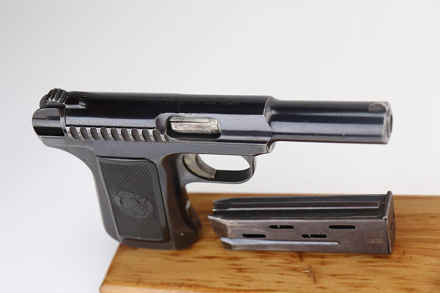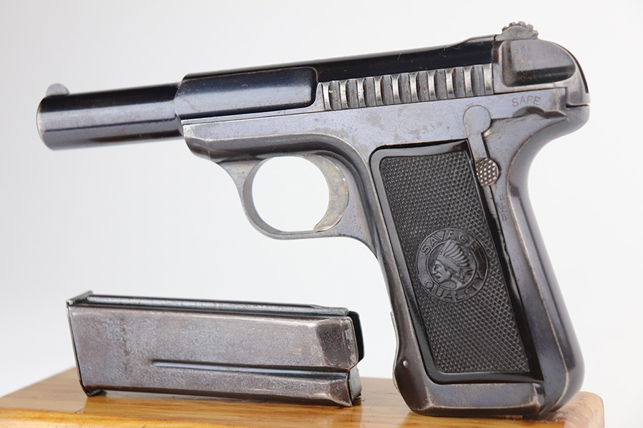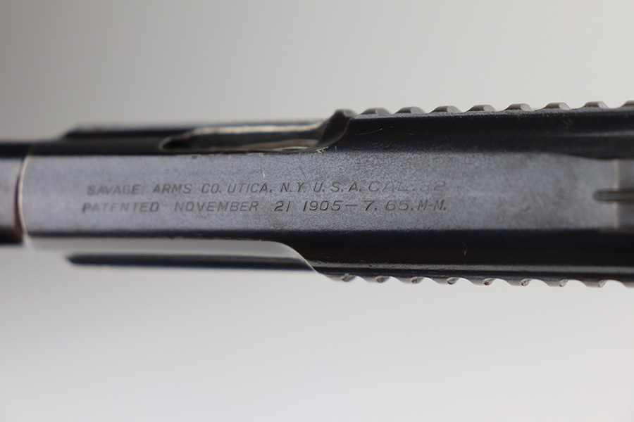 6/15/21 – This is a nice example of a Savage Model 1907, chambered in .32 ACP. The gun is all correct and has retained about 93% of its original bluing. There is minor wear on the high edges in general and around the muzzle. Spotty patina on the straps. Tiny dots of oxidation and freckling throughout. Comes with excellent grips and a correct magazine. Very nice bore – shiny with strong rifling with minor freckling here and there.