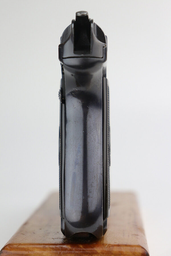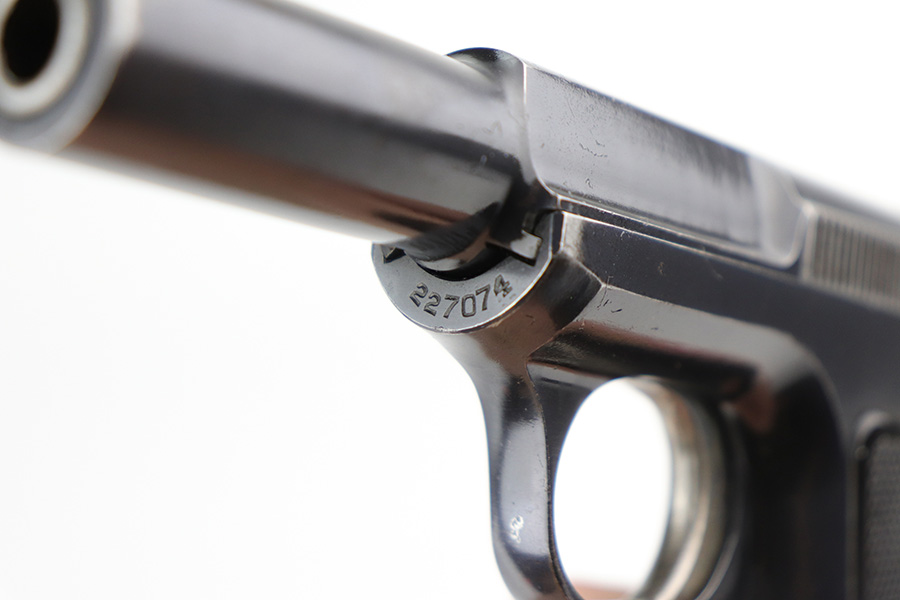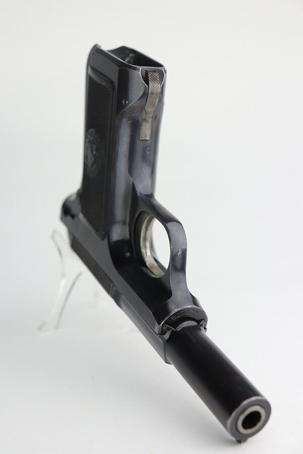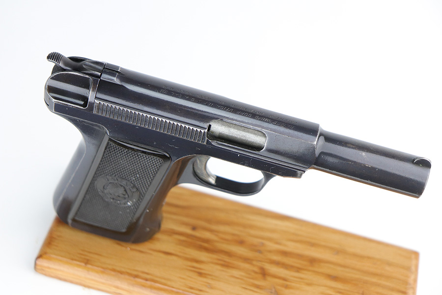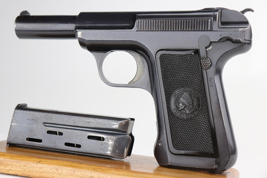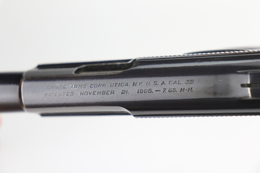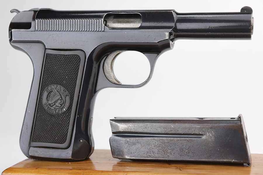 9/22/21 – This is a minty example of a Savage Model 1907 manufactured in 1920. The gun is all matching and has retained about 97% of its finish. There is minor wear on the high edges and around the muzzle, some minor spotty wear on the barrel, and areas of minor freckling and patina on the straps and on the barrel. The case hardening on the small parts is mostly worn. Comes with excellent black bakelite grips and a proper magazine. The bore has good rifling with pin-pricking throughout.