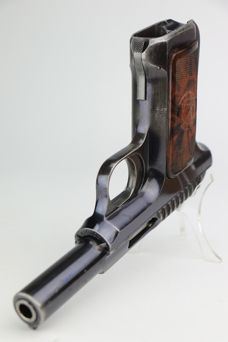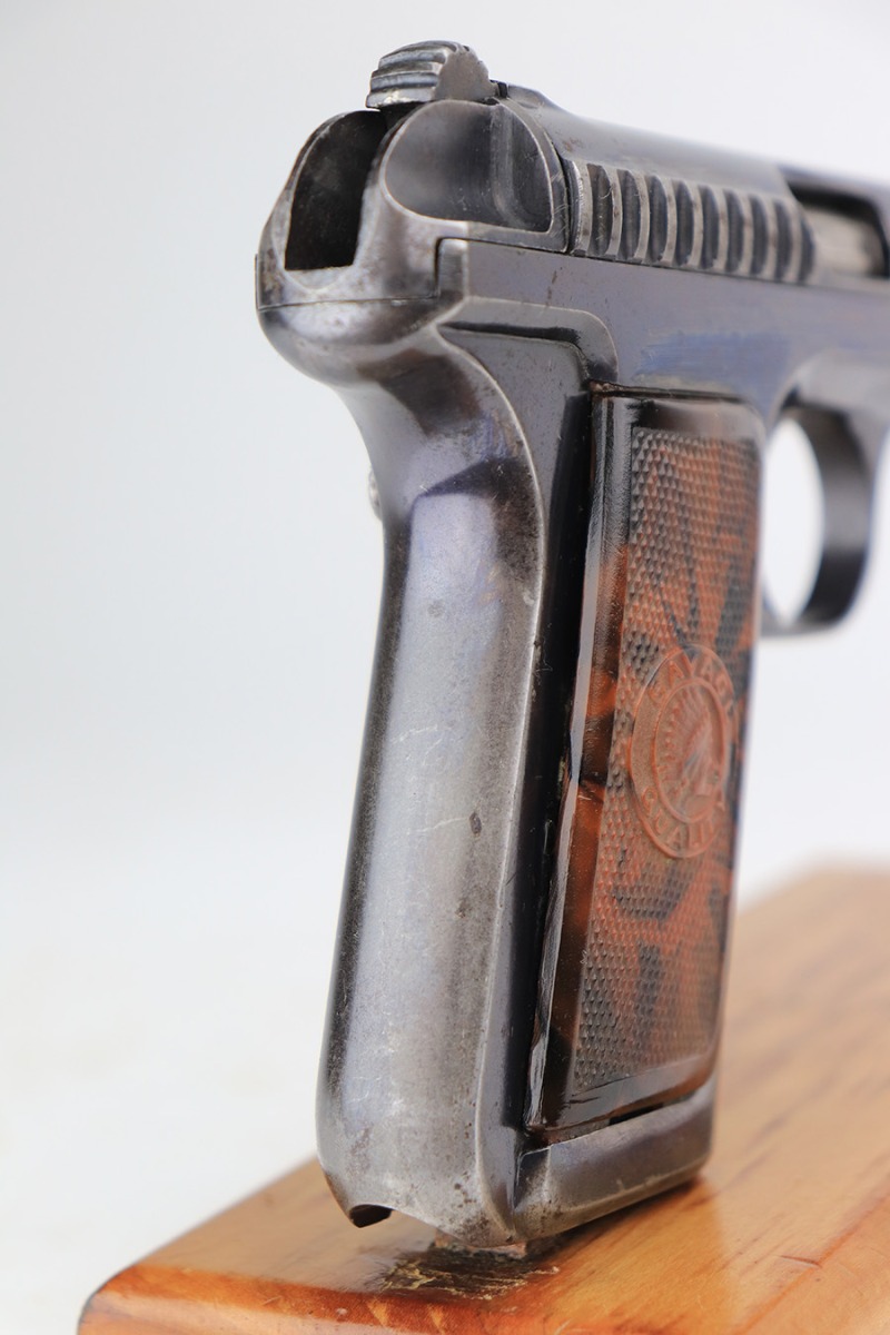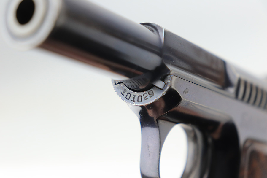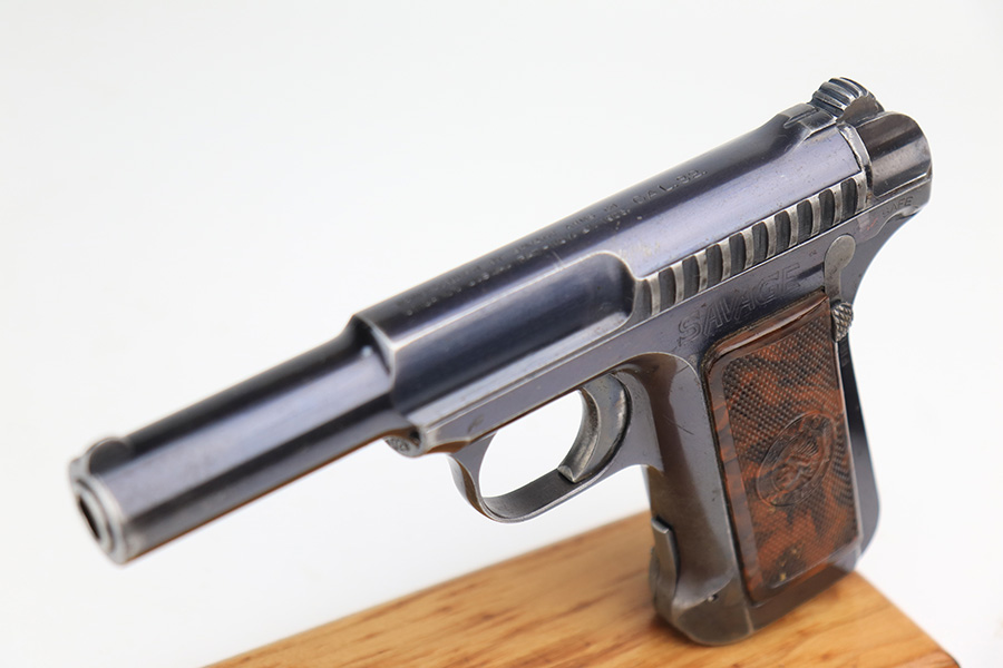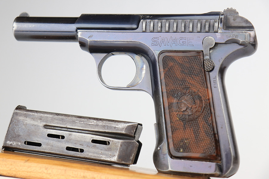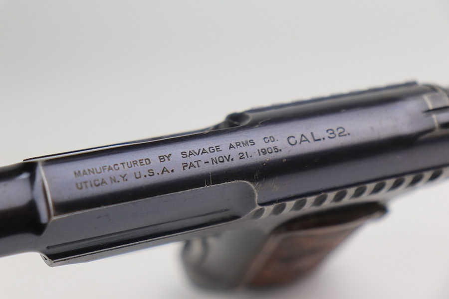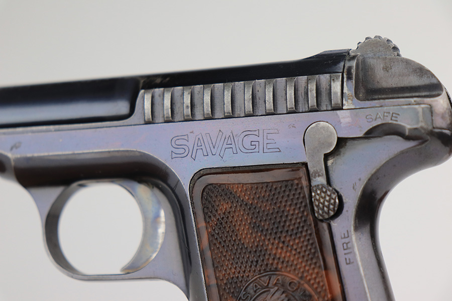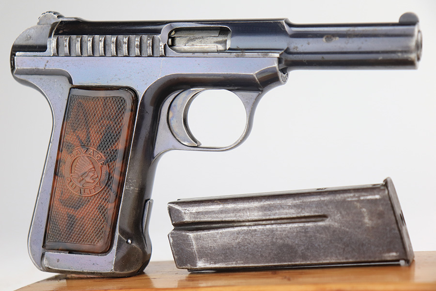 3/10/22 – This is a nice example of a Savage Model 1907 pistol chambered in 7.65mm and manufactured in 1914. The gun is all matching and has retained roughly 85% of its original high polish finish. Most of the finish loss is on the grip straps, where there is noticeable thinning. There is also minor wear around the high edges in general and around the muzzle. There is an area of spotty discoloration on the right side of the barrel. Some light surface scratches on the top of the slide and right side of the frame. Comes with excellent marbled-brown grips and one proper magazine. The bore has good rifling with very minor pin-pricking throughout.
