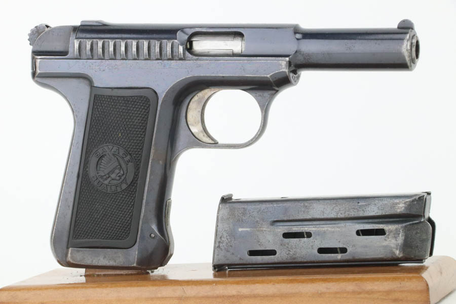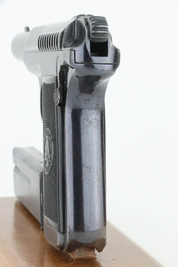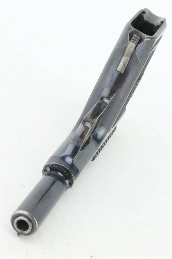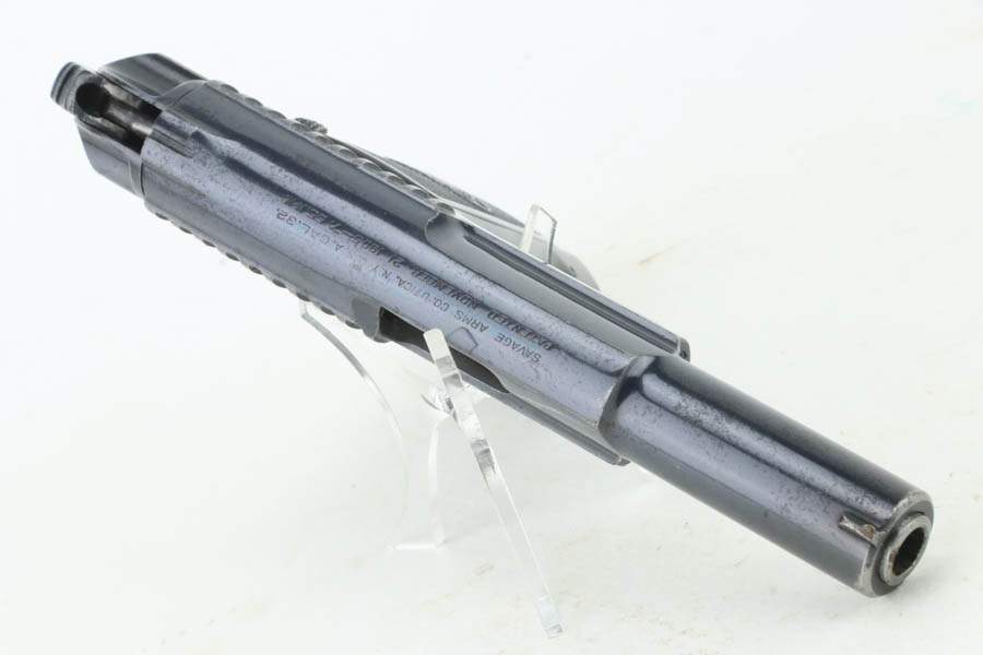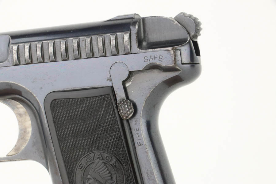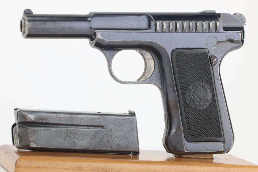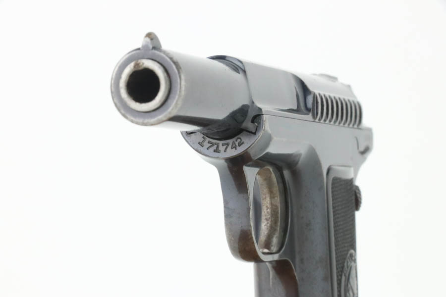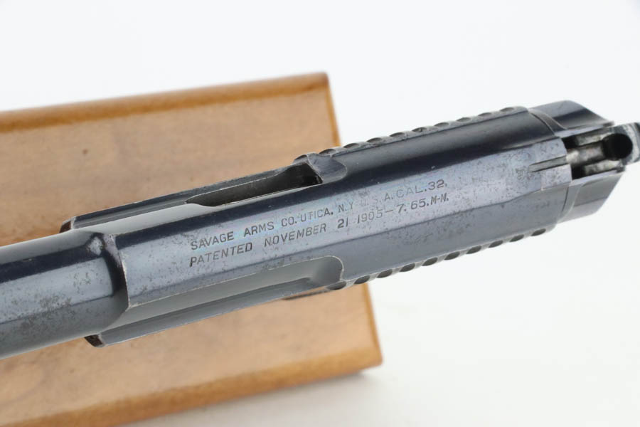 8/26/24 – This is a nice example of a Savage Model 1907, manufactured in 1917 and chambered in .32 ACP. It has retained about 92% of its original high polish finish. While there isn’t a ton of actual finish loss, there is general high edge wear, dulling on the grip straps, and areas of light freckling throughout. Fitted with period-correct black plastic grips and comes with one proper magazine. The bore has good rifling with very minor frosting in the grooves.