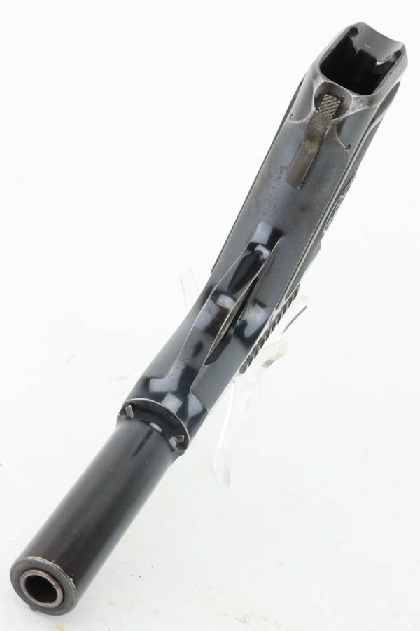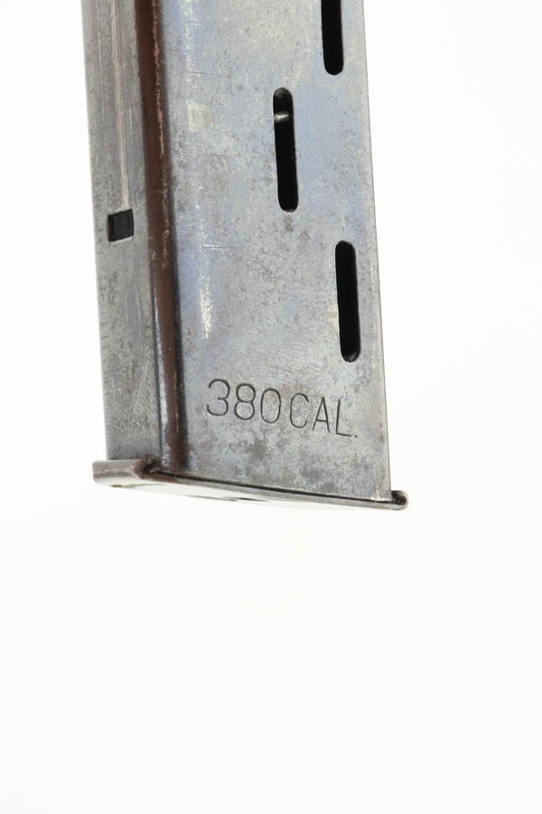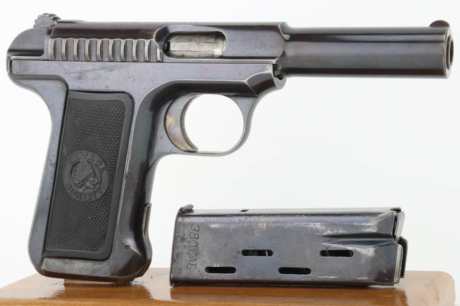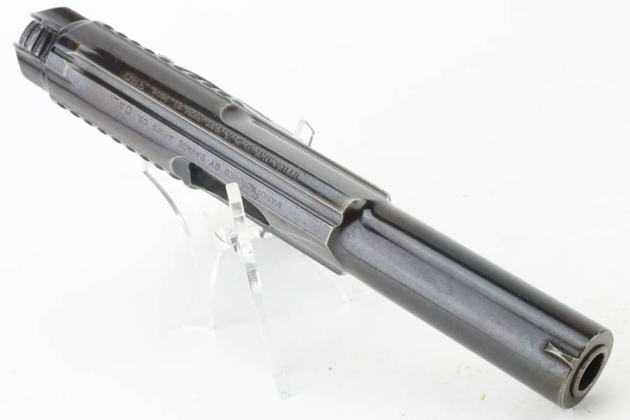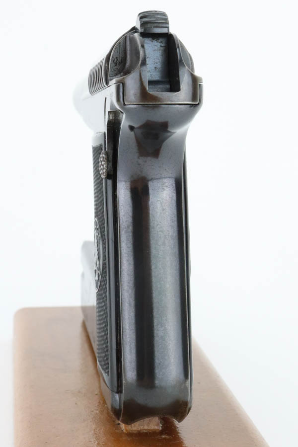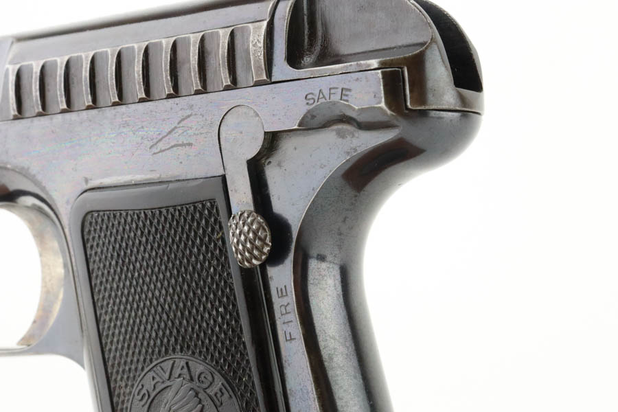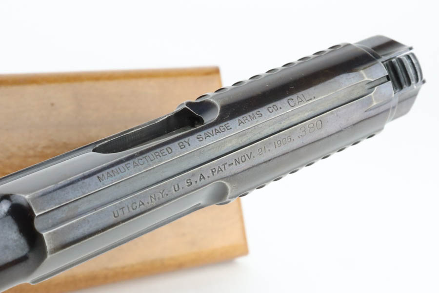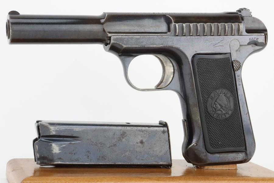 6/26/24 – This is a nice example of a Savage Model 1907, manufactured in 1913 and chambered in .380 ACP. Its original high polish finish rates about 94% with general high edge wear. While there isn’t a lot of actual finish loss, there is spotty brown patina visible under the finish throughout. A few scratches here and there. Fitted with period-correct black bakelite grips and comes with a proper .380 ACP magazine. The bore has good rifling, but there is some frosting in the grooves.
