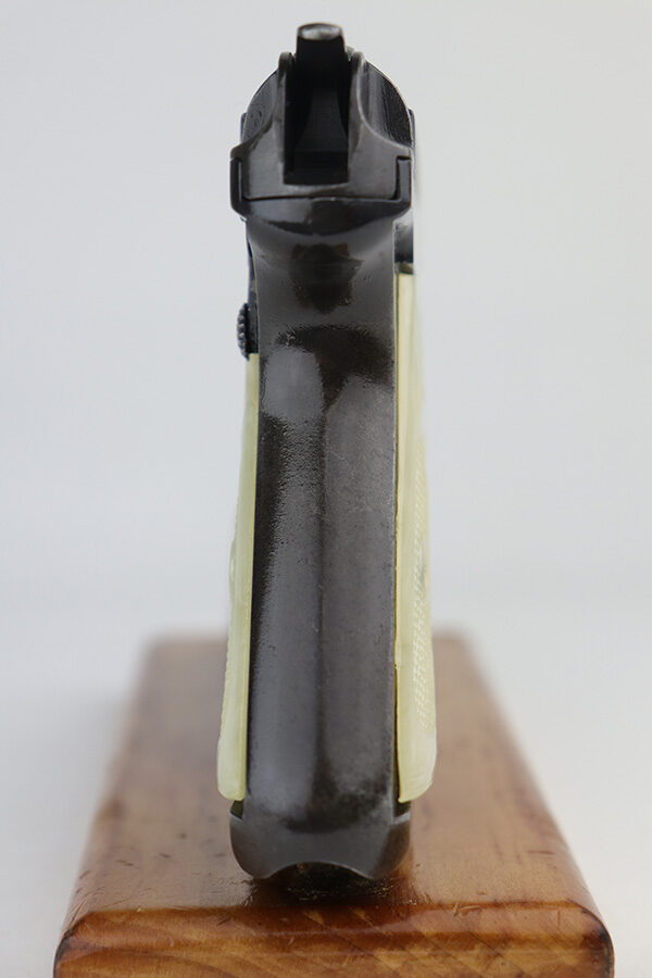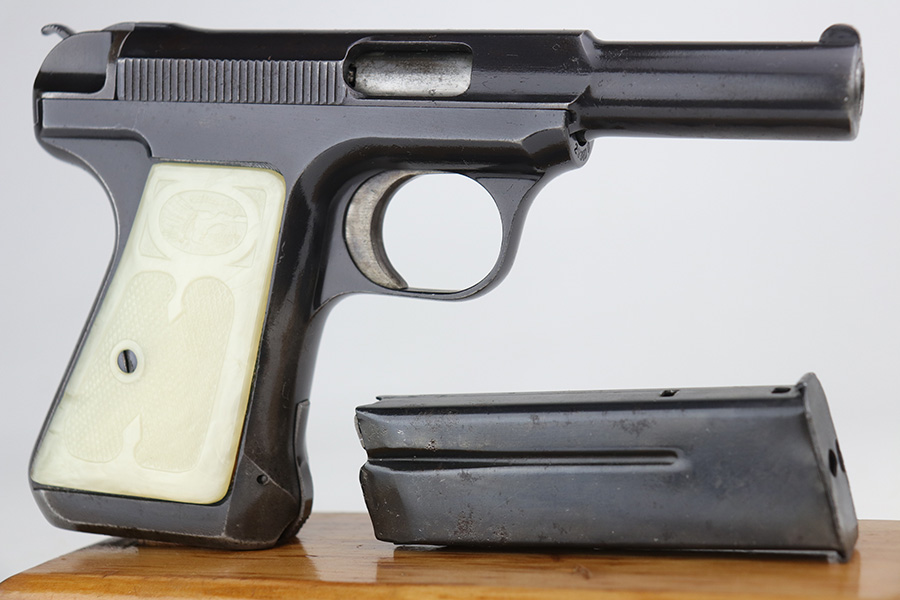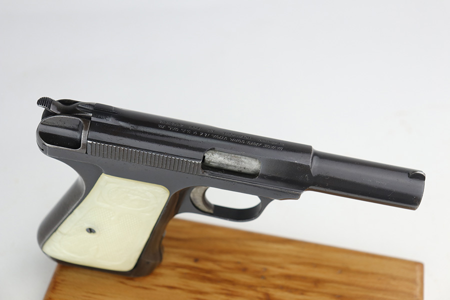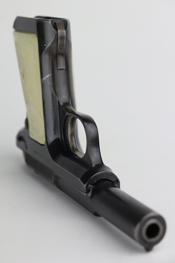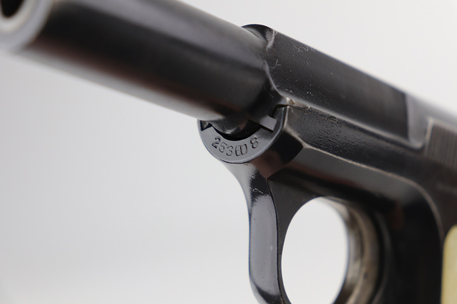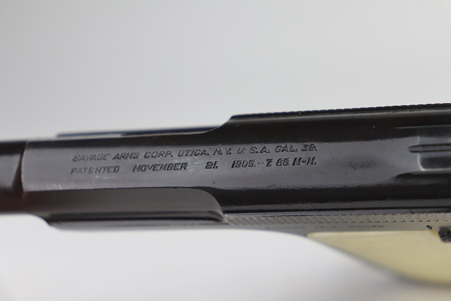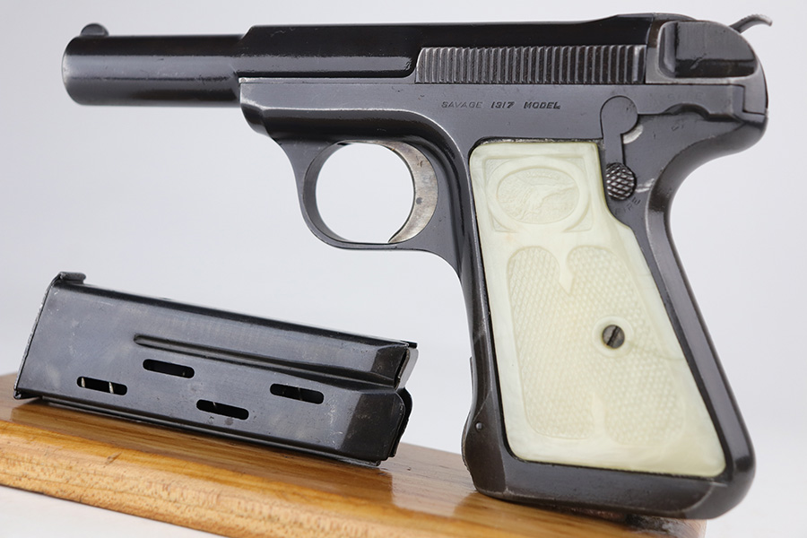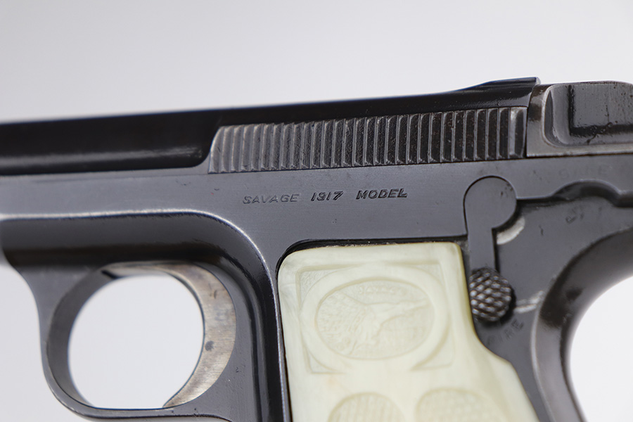10/1/21 – This is a very nice example of a Savage Model 1917, chambered in .32 caliber and manufactured in the 1920’s. The gun is all matching and has retained about 93% of its original finish. There is very minor wear on the high edges in general and around the muzzle. One small streak of wear on the front strap. Very minor thinning and spotty oxidation on both straps. The gun comes with white Franzite grips and a proper magazine. The bore has good rifling with some minor frosting in the grooves.