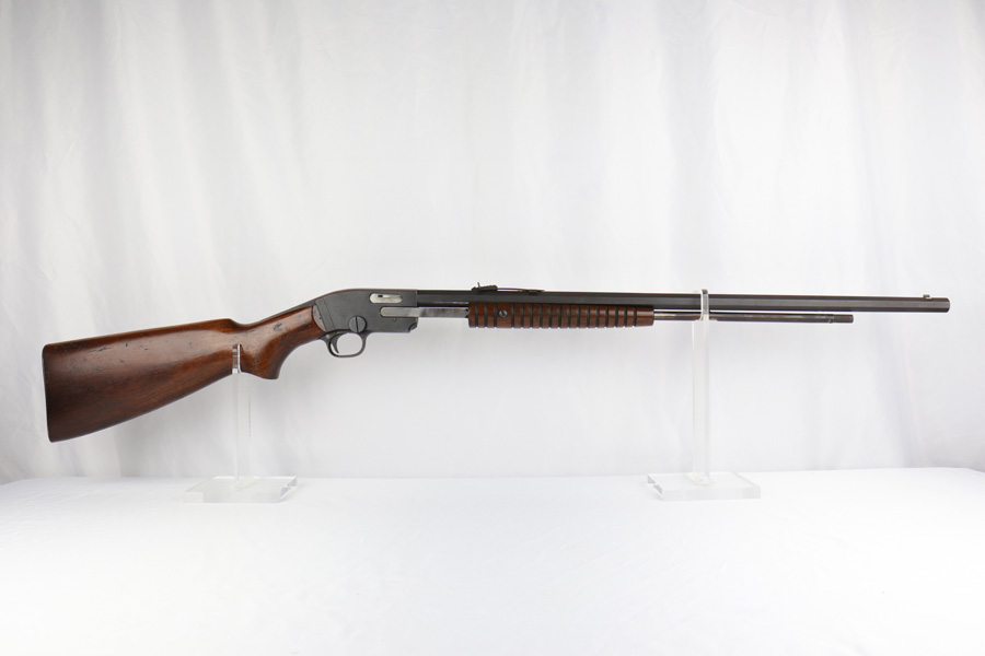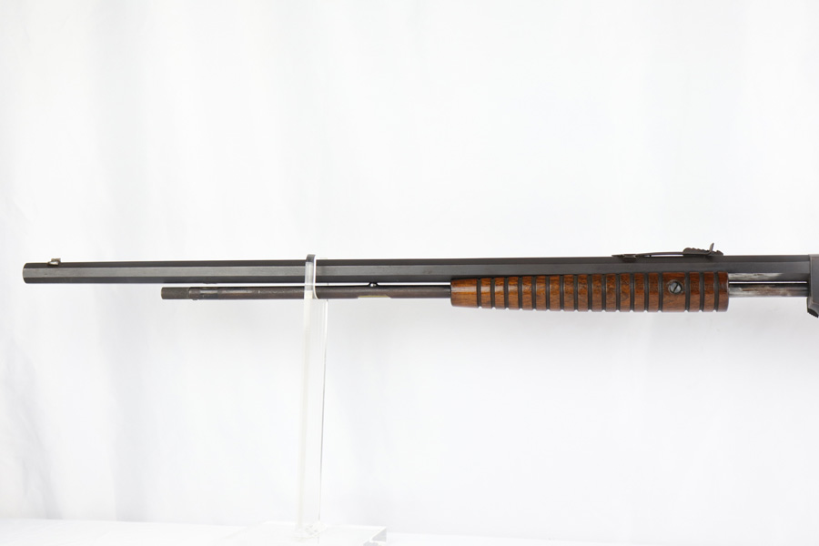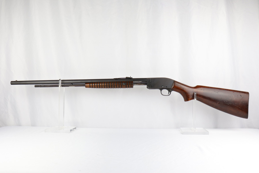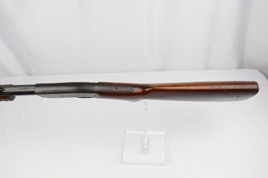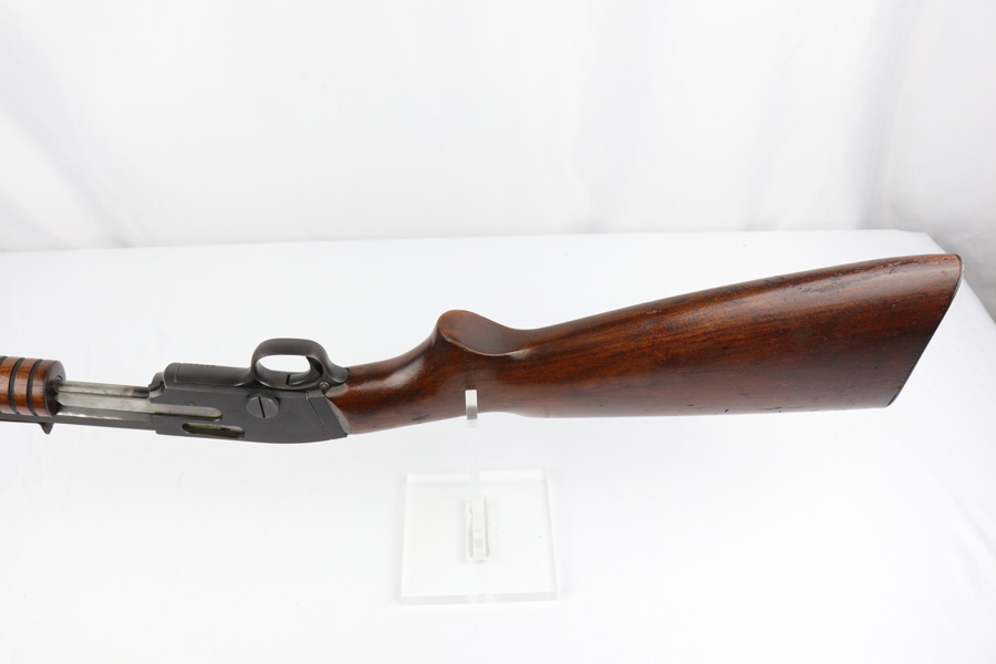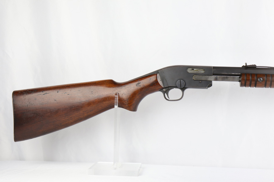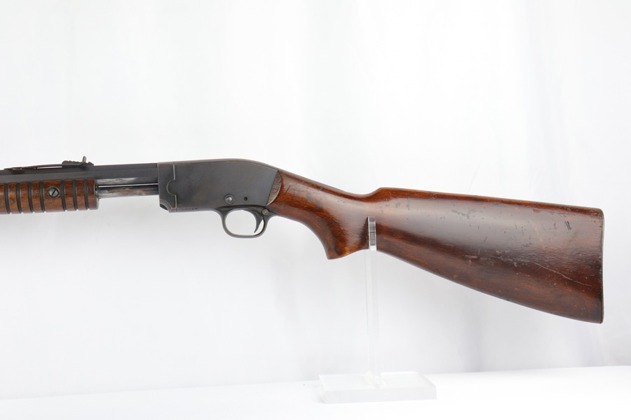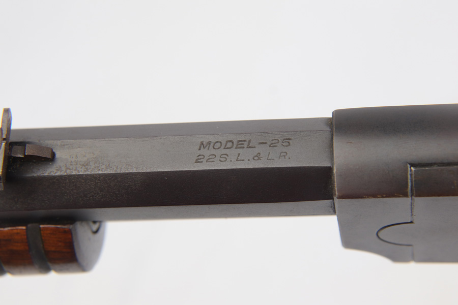 3/6/19 – This is a Savage Model 25 slide-action rifle, chambered in .22LR. All original, with 90+% blue remaining on metal parts. There is very little actual bluing loss, but some patina to the receiver and barrel. Smooth action, but bore has some frost and minor freckling throughout. Stock in great condition aside from chip on the right side, where it meets the receiver. 24 inch, octagonal barrel.