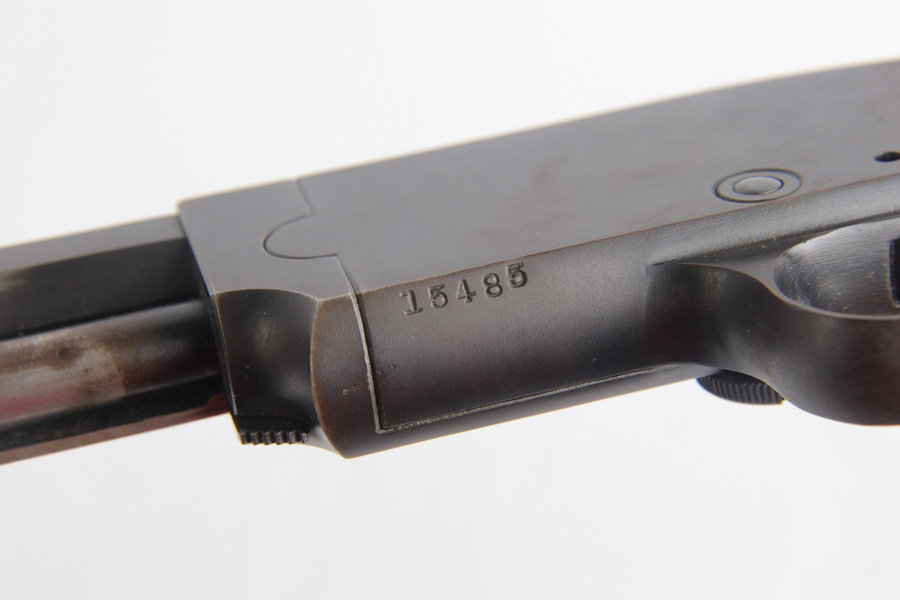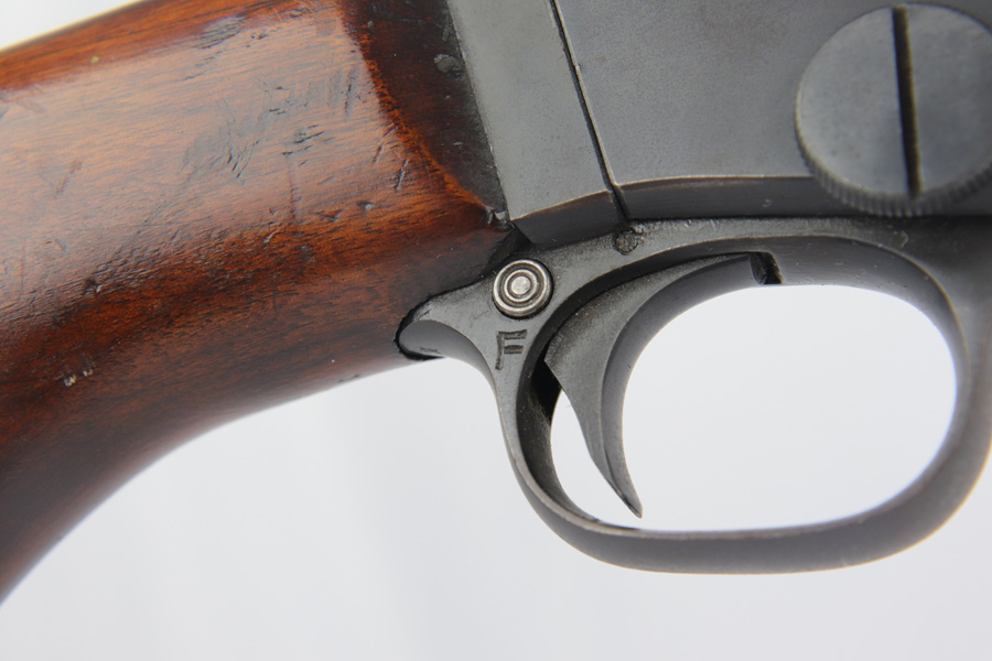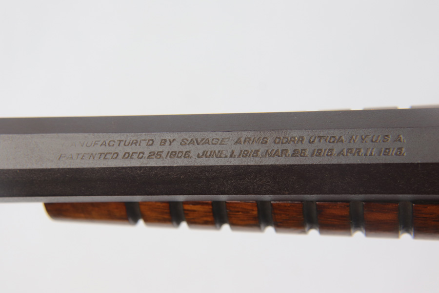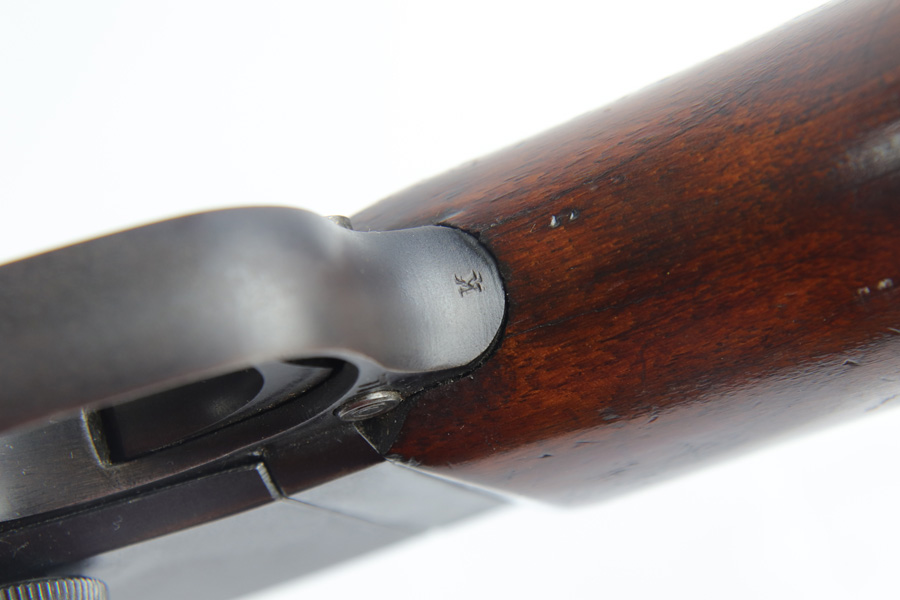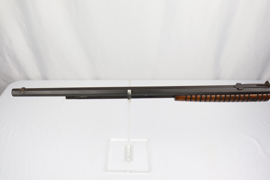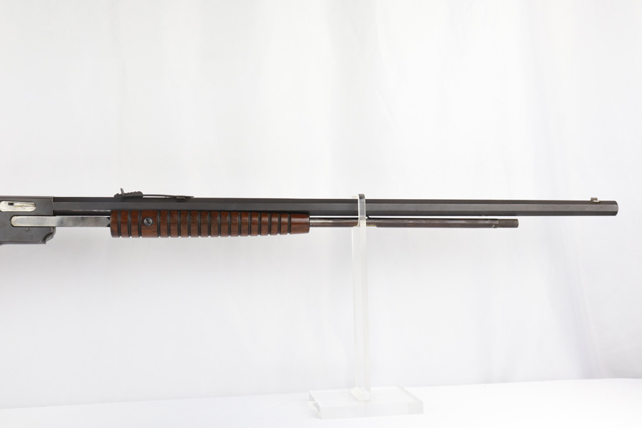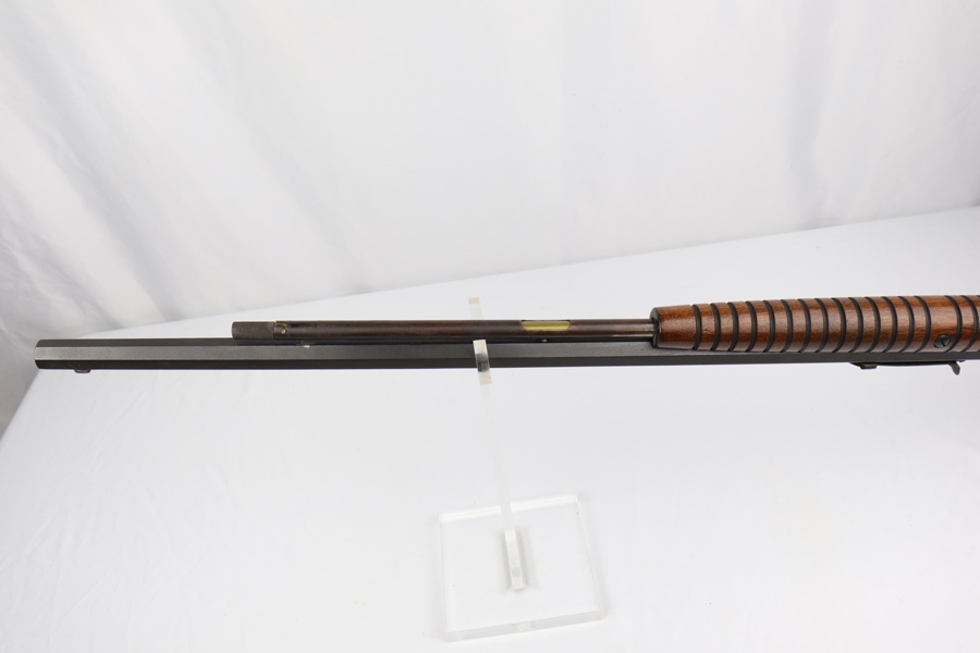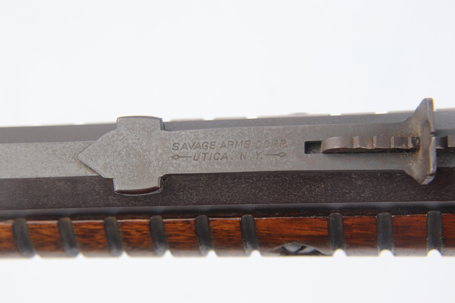 3/6/19 – This is a Savage Model 25 slide-action rifle, chambered in .22LR. All original, with 90+% blue remaining on metal parts. There is very little actual bluing loss, but some patina to the receiver and barrel. Smooth action, but bore has some frost and minor freckling throughout. Stock in great condition aside from chip on the right side, where it meets the receiver. 24 inch, octagonal barrel.