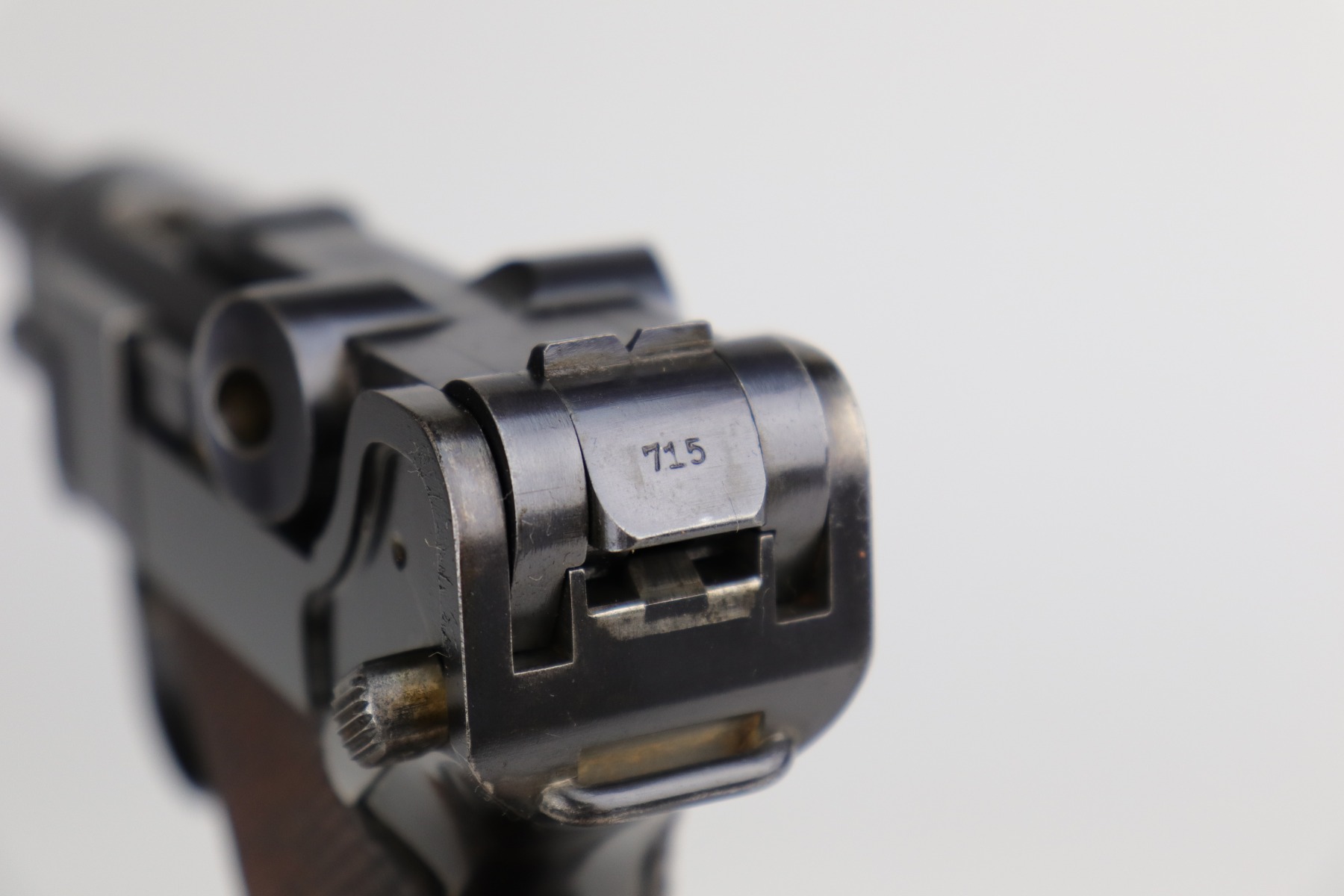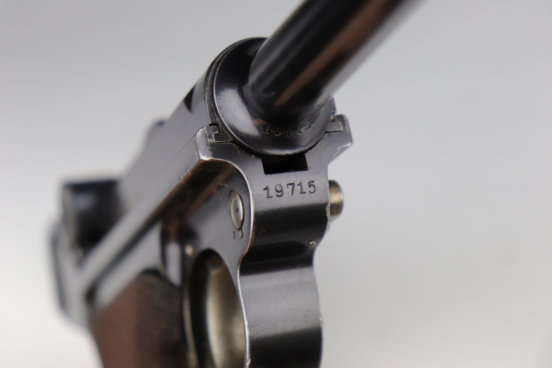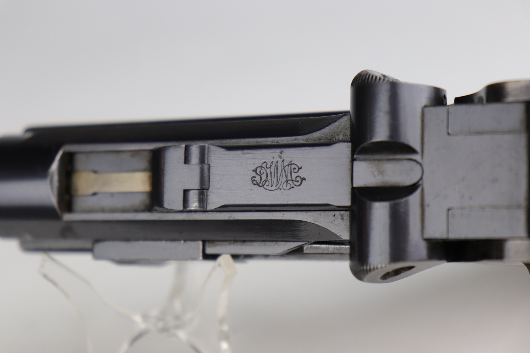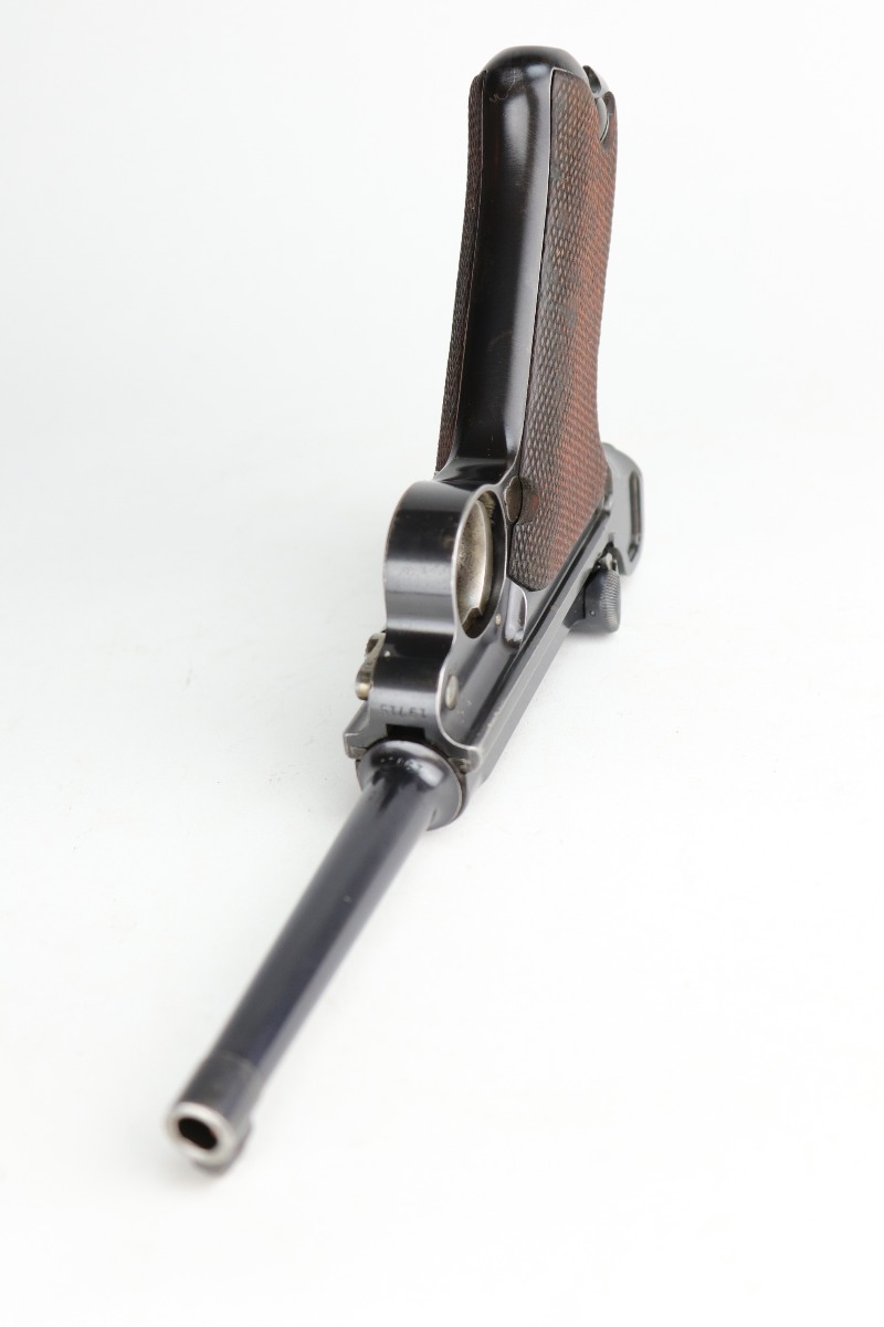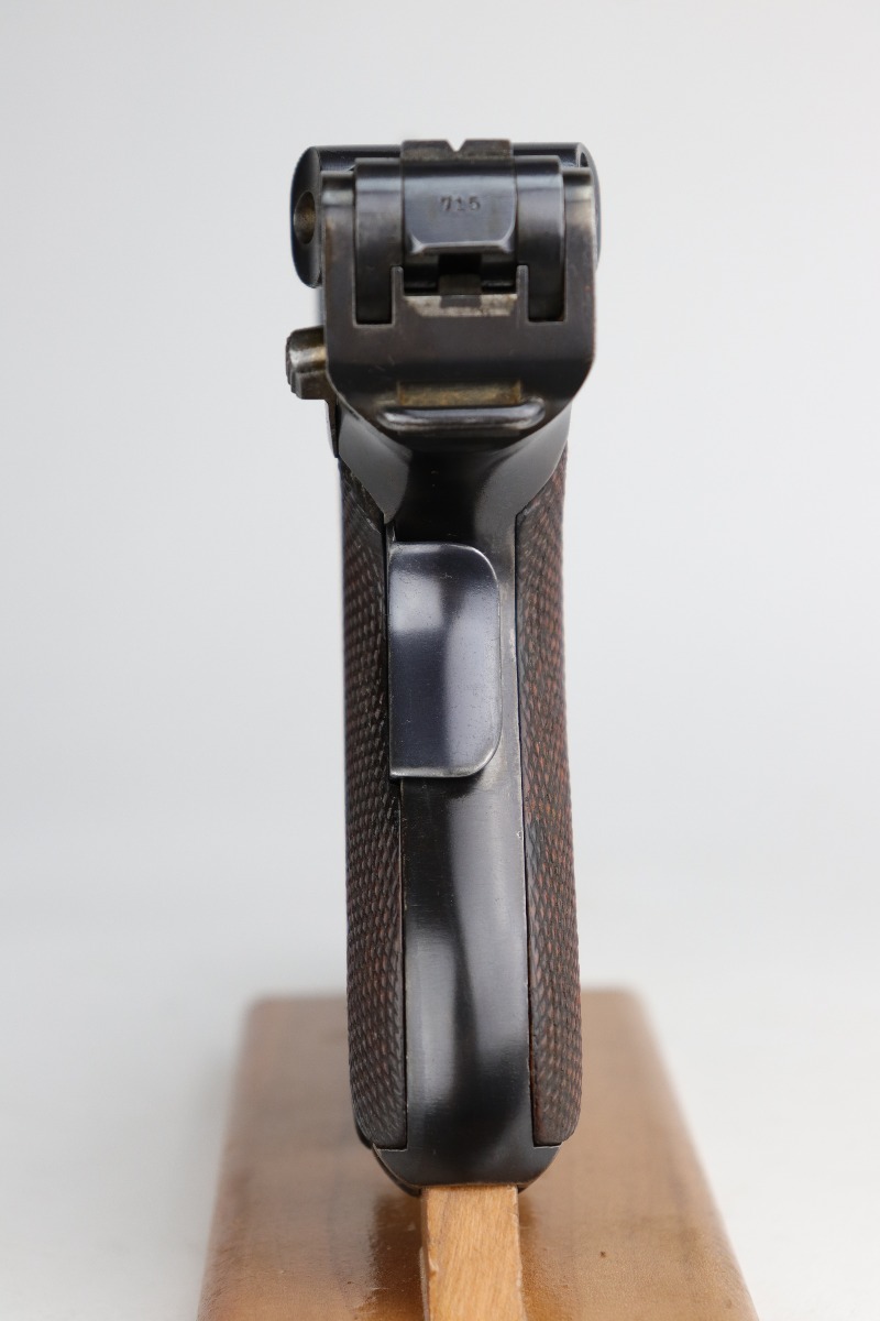 11/20/20 – This is an excellent original example of a desirable early-production DWM Model 1900 Commercial Luger pistol. These pistols were the true first commercial contract Luger pistols produced by DWM and can be found in the 2000 to about 19000 serial number range. This pistol has desirable early features such as the “Crown B U G” proofs, dished toggles with toggle lock on the right side, recessed breechblock, 4 3/4 inch fast tapered barrel, grip safety and no stock lug. It is all matching and has retained about 95% of its original bluing. There is wear around the muzzle, on the side plate, and the high edges of the frame. There is spotty wear on the front strap. There is some spotty oxidation on the barrel. The rifling is somewhat worn and there is pitting in the bore throughout. It comes with excellent grips and an un-numbered period-correct magazine.
