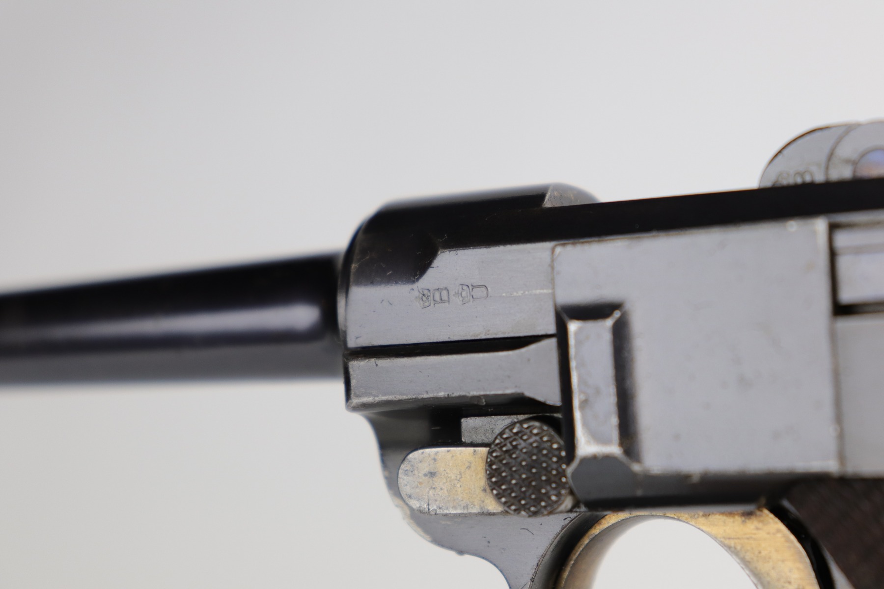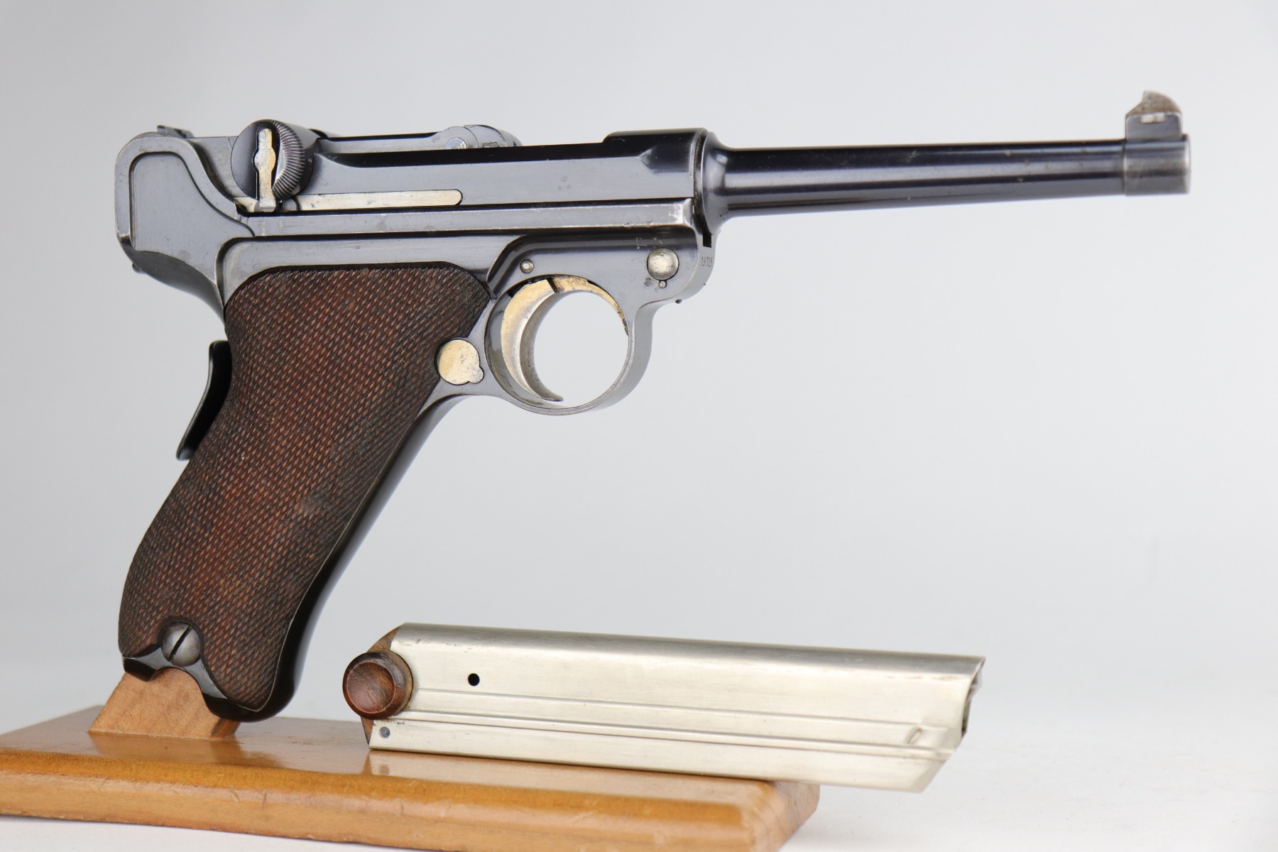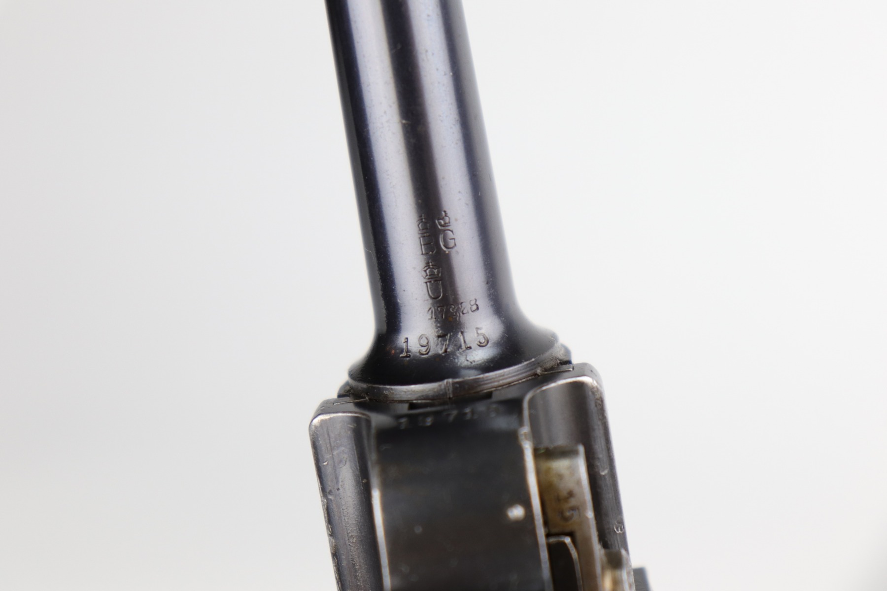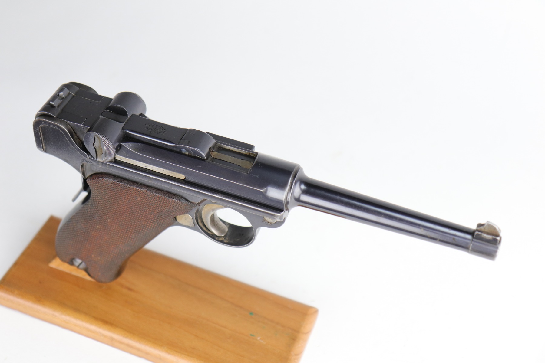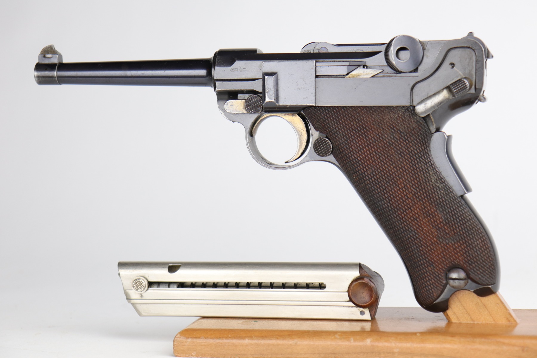 11/20/20 – This is an excellent original example of a desirable early-production DWM Model 1900 Commercial Luger pistol. These pistols were the true first commercial contract Luger pistols produced by DWM and can be found in the 2000 to about 19000 serial number range. This pistol has desirable early features such as the “Crown B U G” proofs, dished toggles with toggle lock on the right side, recessed breechblock, 4 3/4 inch fast tapered barrel, grip safety and no stock lug. It is all matching and has retained about 95% of its original bluing. There is wear around the muzzle, on the side plate, and the high edges of the frame. There is spotty wear on the front strap. There is some spotty oxidation on the barrel. The rifling is somewhat worn and there is pitting in the bore throughout. It comes with excellent grips and an un-numbered period-correct magazine.
