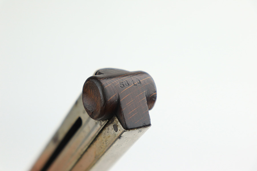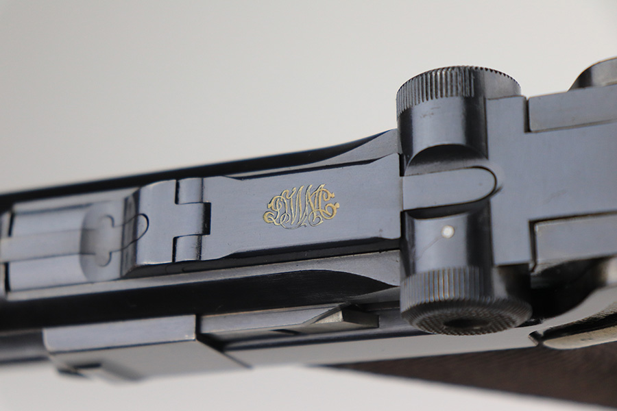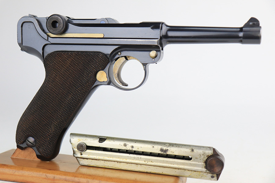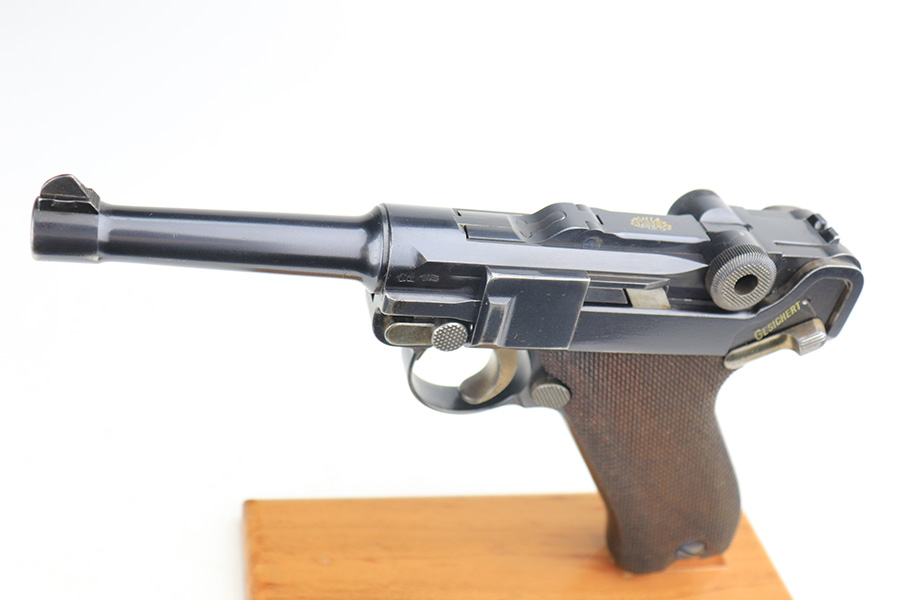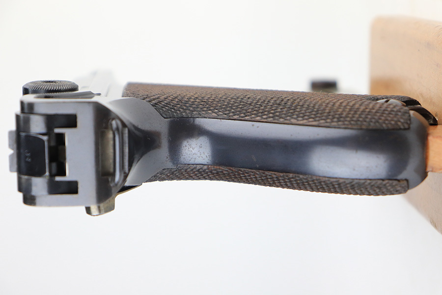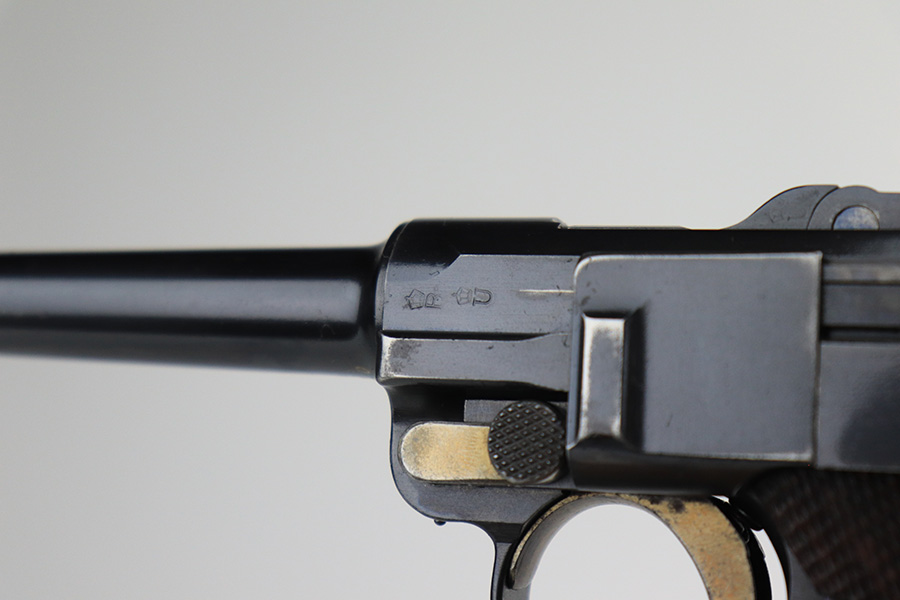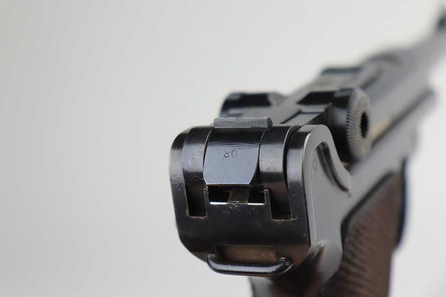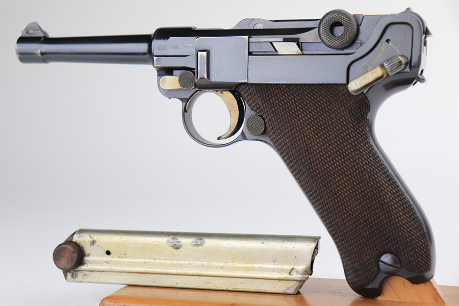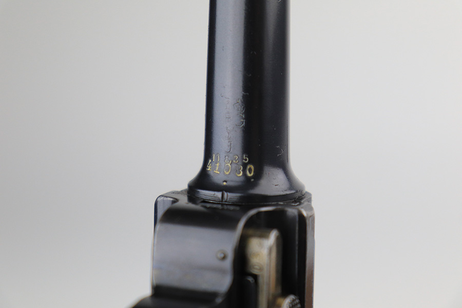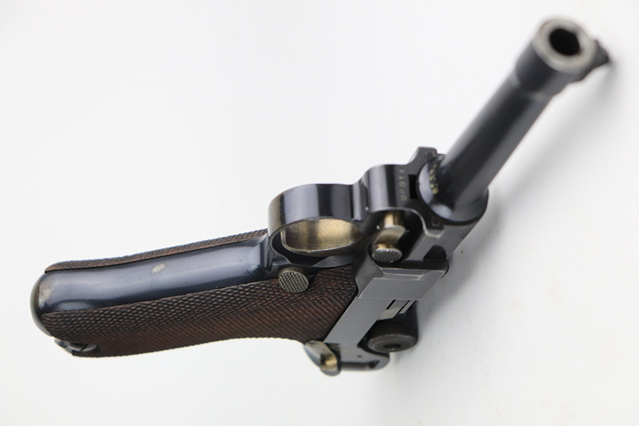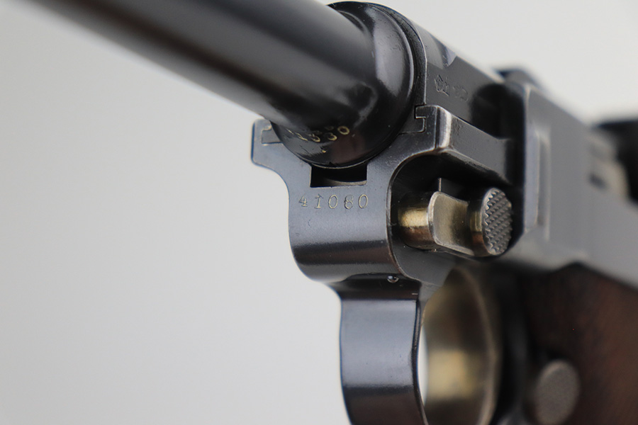 12/15/21 – This is an excellent example of a scarce DWM Model 1908 Luger sold in the commercial market in the early 1900’s. It has the P.08 configuration with no stock lug. It is all matching and has the proper “Crown N” commercial proofs. It is in beautiful condition, retaining about 95-96% of its bluing. There is minor wear on the high edges, and a spot of bluing loss on the front strap. Comes with excellent grips with sharp checkering. Comes with a WW1 magazine that is military-issued and numbered. Bore has strong rifling and is shiny but wasn’t cleaned properly at some point so does have a little freckling in the grooves.