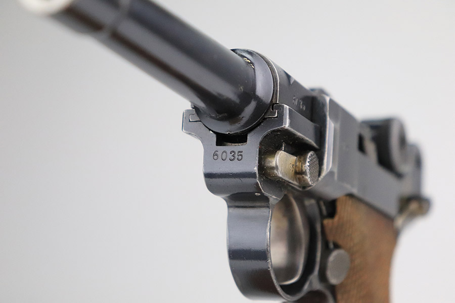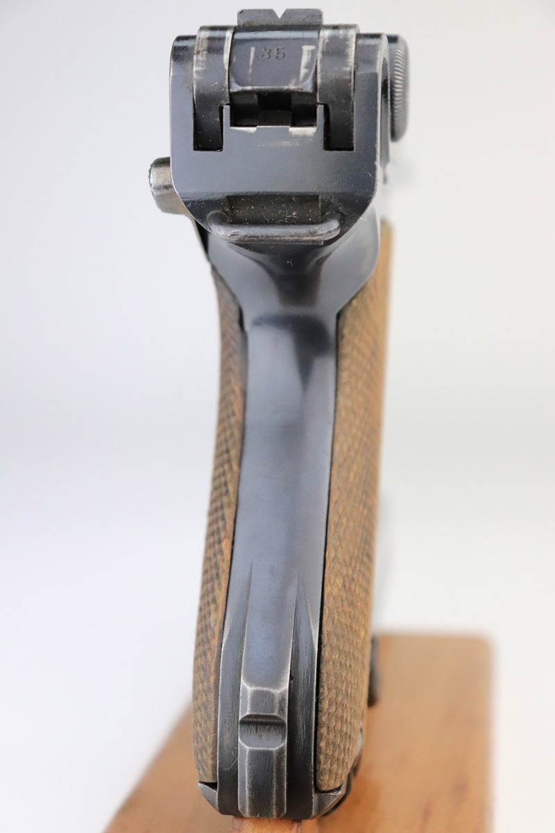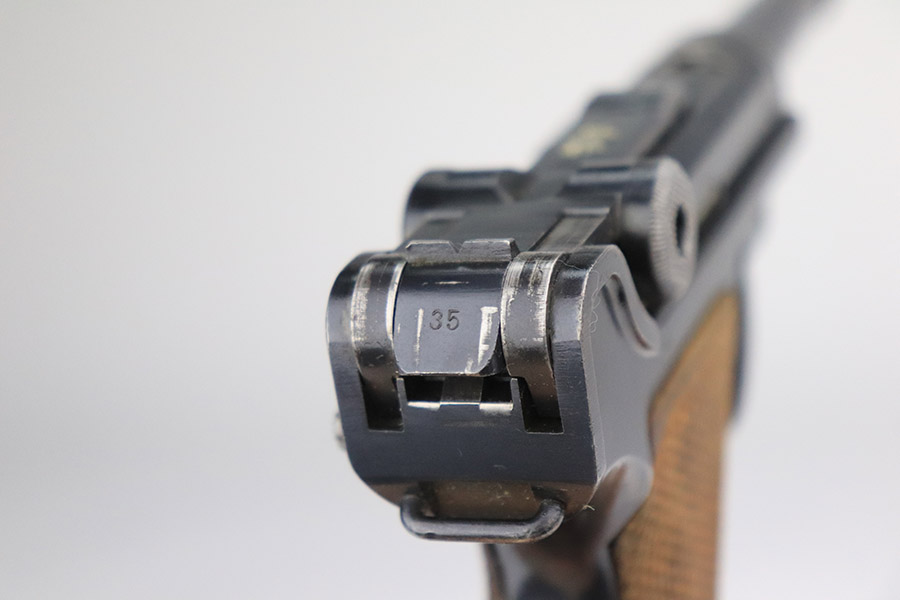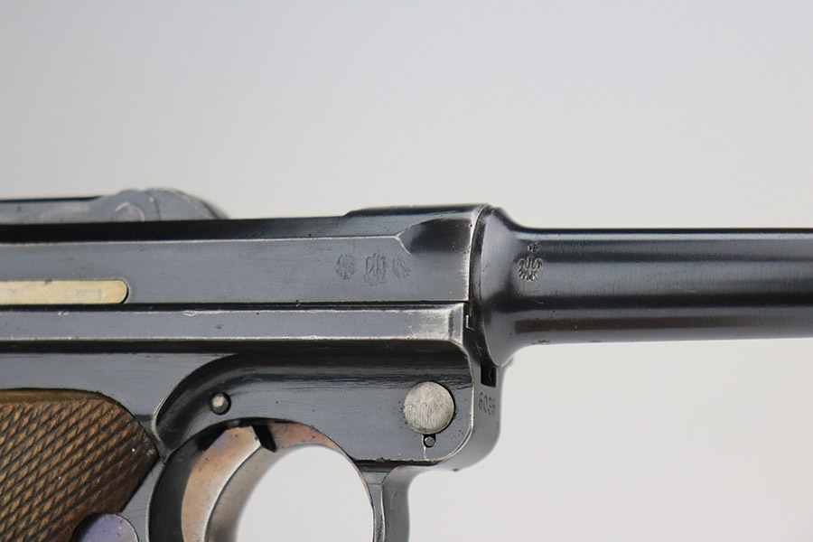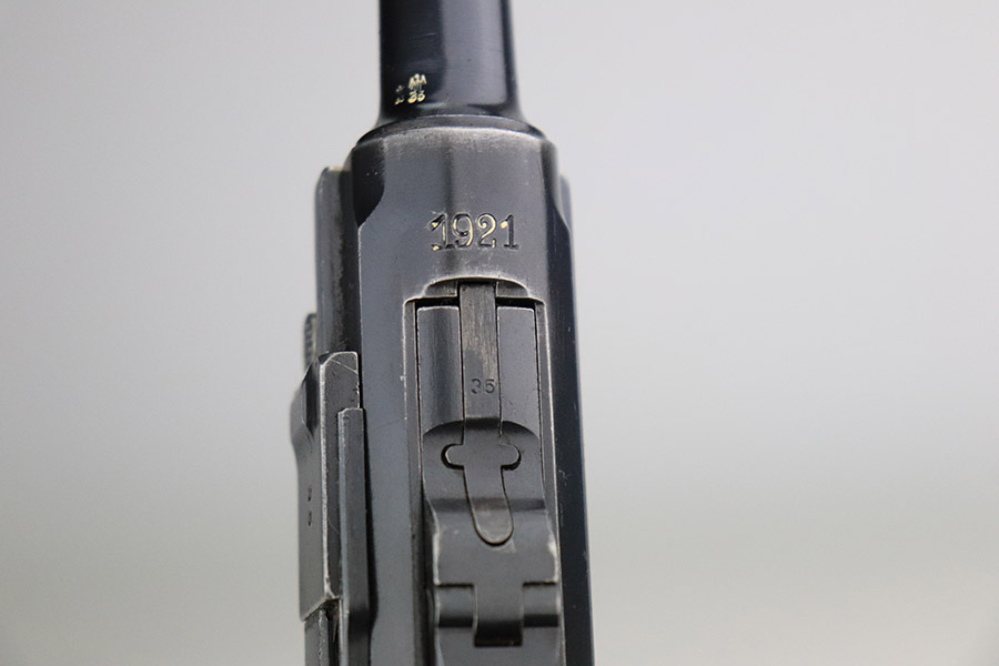 11/4/22 – This is an excellent example of a scarce 1921-dated DWM Luger issued to the German police force during the Weimar Era. It is all matching and has Weimar-era police proofs on the right side of the slide. It has an added police sear safety and magazine safety, both intact. There is a crossed-out “S.V.D. xxx” police unit marking on the front strap. From research, we understand this the represent the Schutzpolizei of Oberhausen. The gun has retained about 95% of its bluing with minor spotty wear on the front strap and areas of very minor wear on the side plate, very front edges of the side rails, and a hint of wear around the muzzle. Comes with excellent un-numbered wood grips (fit the gun perfectly) and a matching police arsenal-numbered magazine. The bore is like-new.