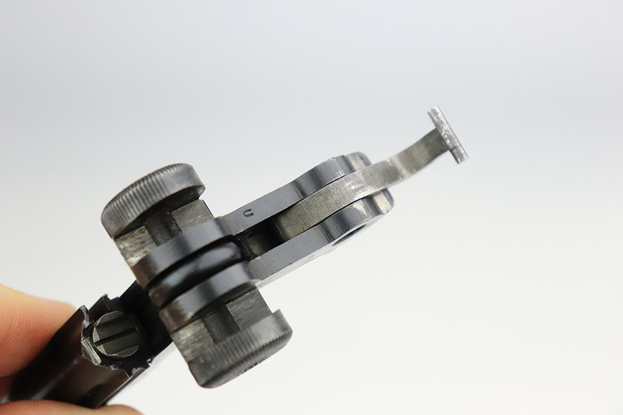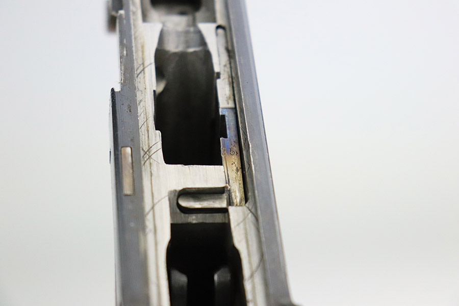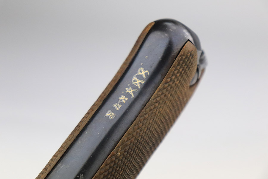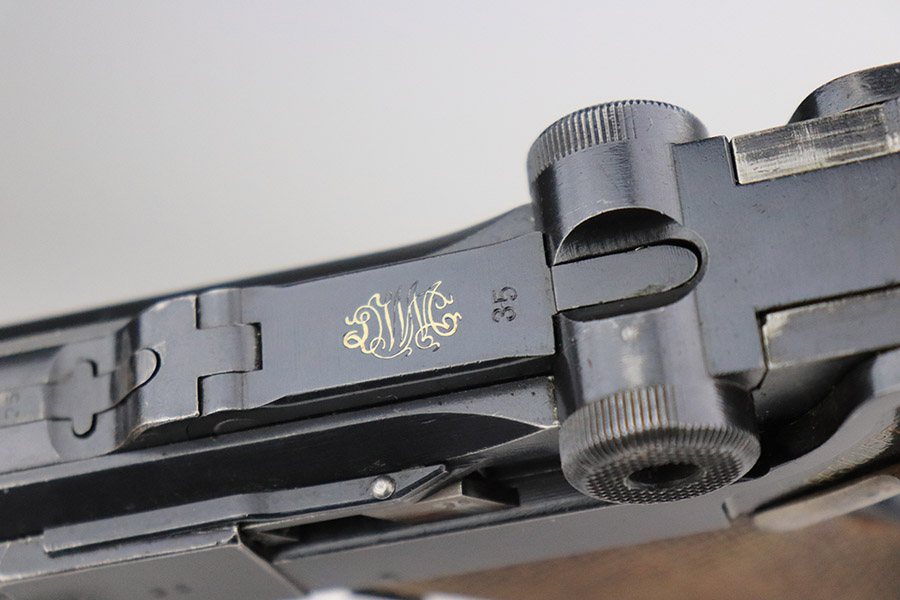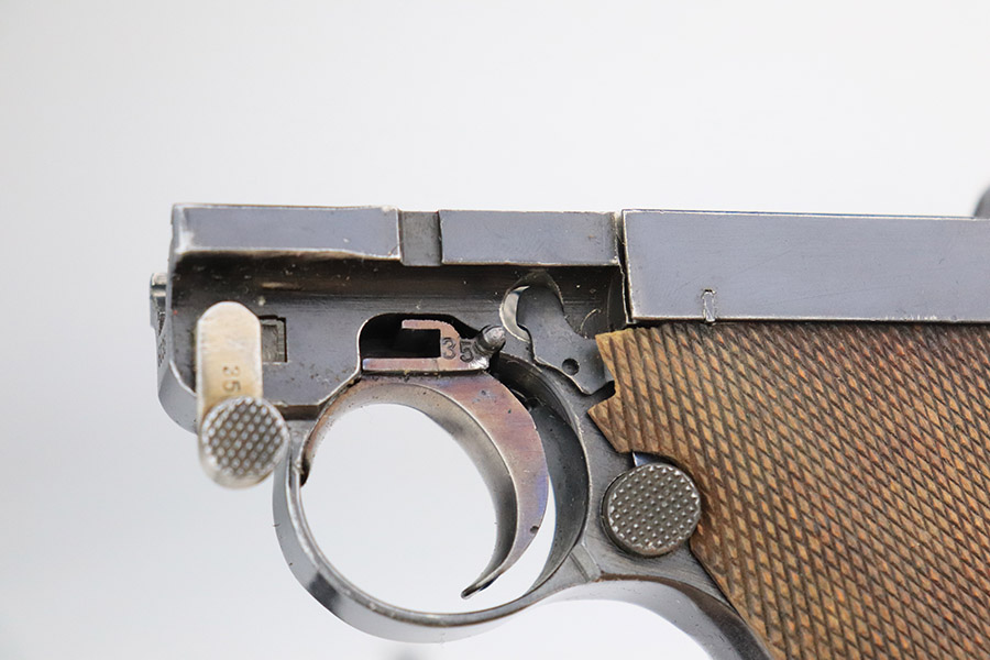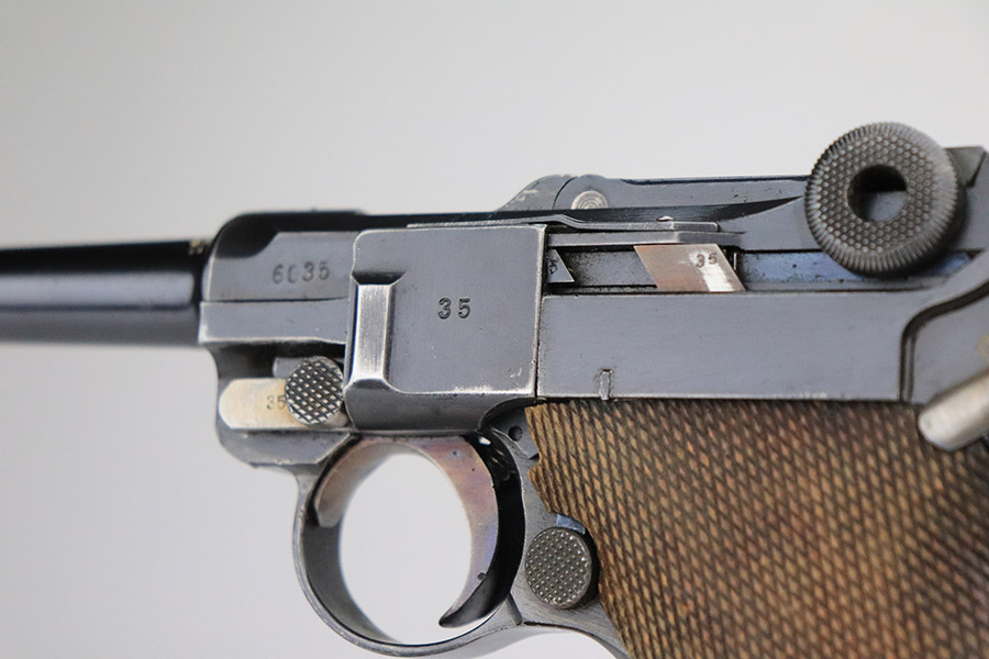 11/4/22 – This is an excellent example of a scarce 1921-dated DWM Luger issued to the German police force during the Weimar Era. It is all matching and has Weimar-era police proofs on the right side of the slide. It has an added police sear safety and magazine safety, both intact. There is a crossed-out “S.V.D. xxx” police unit marking on the front strap. From research, we understand this the represent the Schutzpolizei of Oberhausen. The gun has retained about 95% of its bluing with minor spotty wear on the front strap and areas of very minor wear on the side plate, very front edges of the side rails, and a hint of wear around the muzzle. Comes with excellent un-numbered wood grips (fit the gun perfectly) and a matching police arsenal-numbered magazine. The bore is like-new.