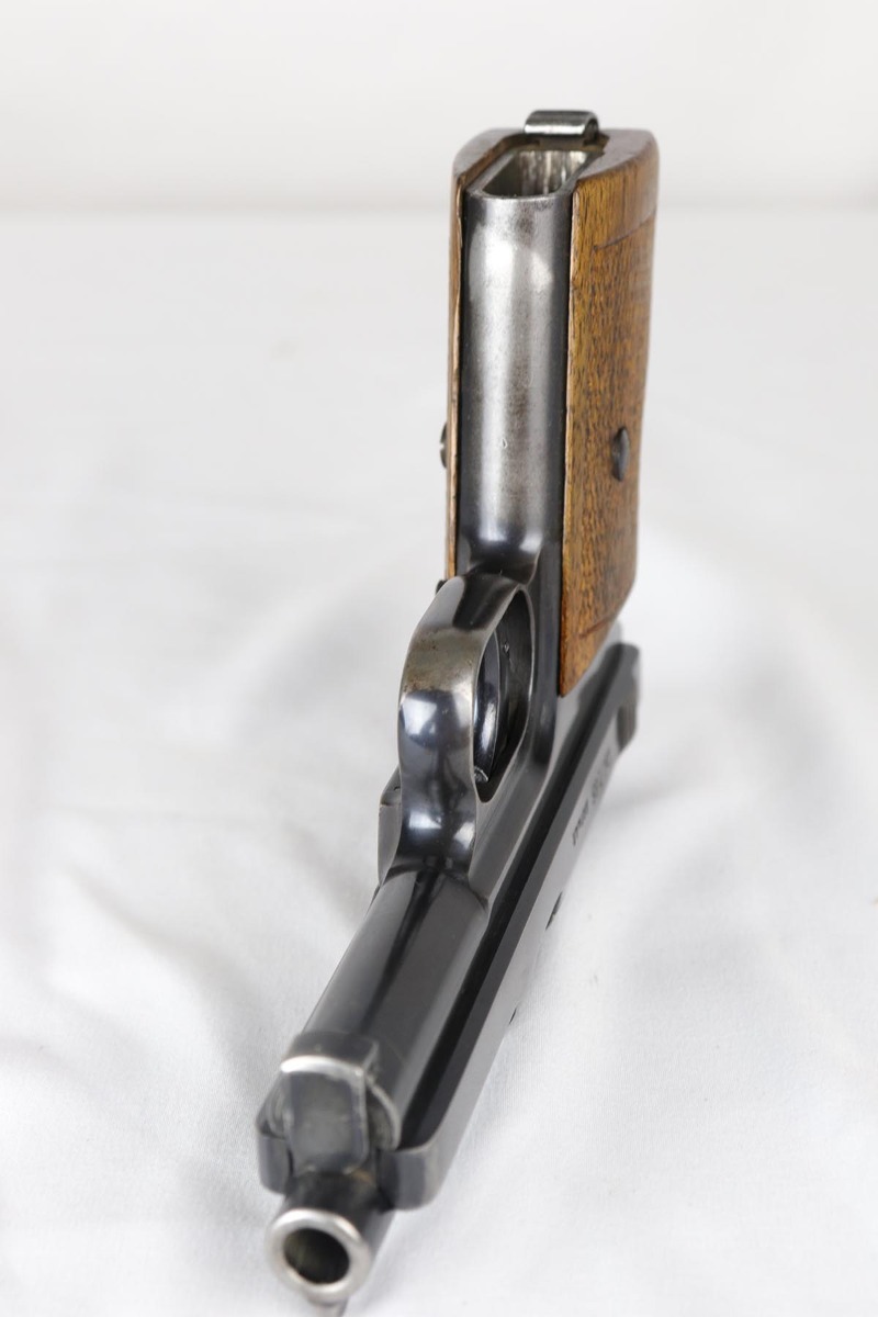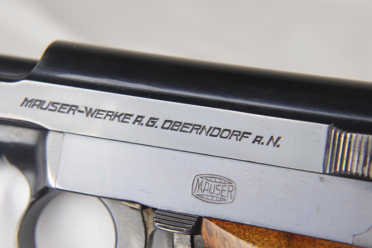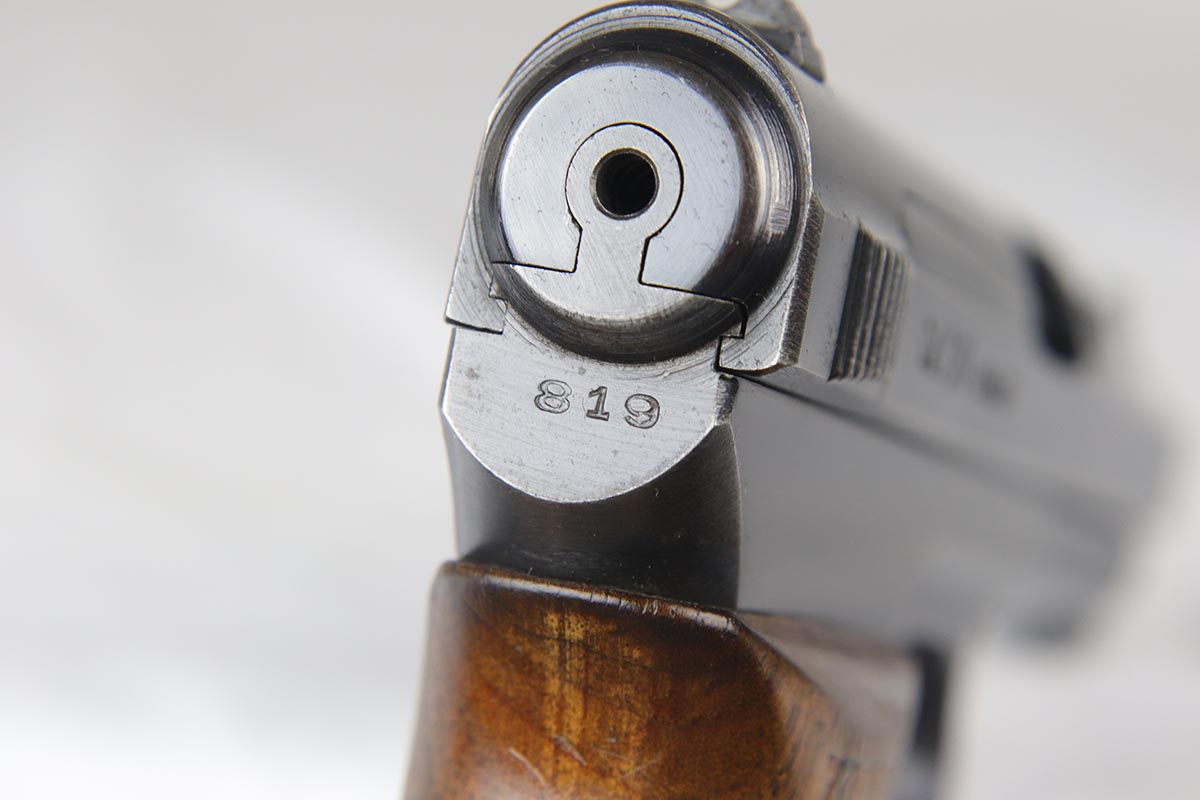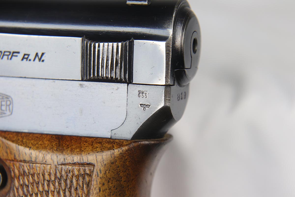 4/17/18 – This is a scarce 1934 Mauser made in late 1939 or early 1940.  This gun would have been produced just before the factory switched over to HSC production.  It is Eagle/N proofed which helps to determine the date.  It is also Nazi test proofed on the back left side of the frame and Eagle/655 proofed, indicating it was issued to the German Army.  These guns are fairly rare with an estimate of only ~8,000 procured by the army.  The original finish covers about 85% of the gun in a nice high-polish finish.  The slide shows standard edge wear but the front strap is thinned throughout. It has the correct one piece wood grips and correct 1934 magazine.   The bore is shiny and strong.