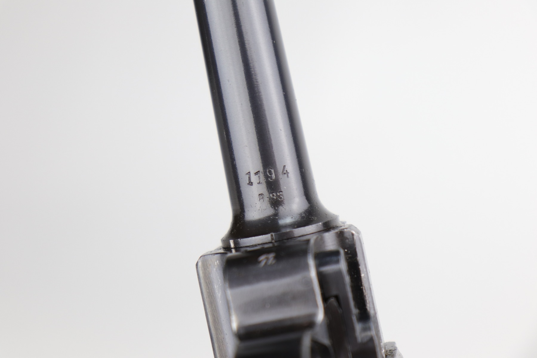 10/14/20 – This is a scarce Mauser Navy Luger issued to the Nazi Kriegsmarine in 1938. It is all matching and has an Ostsee Nazi Navy property mark on the front strap. The rig also comes with a 1939-dated, Navy-marked Luger holster, and a mismatched Kriegsmarine magazine that is marked with a Nordsee property mark. The two largest Nazi Navy bases were on the Ostee and Nordsee, hence the property markings. The gun is in minty condition, having retained more than 98% of its bluing. There is very minor wear around the muzzle, side plate, and on the front edges of the frame. There are a few very small dots of discoloration and very light handling marks on the front strap. The grips are minty and match the gun. The bore is minty – shiny with strong rifling.