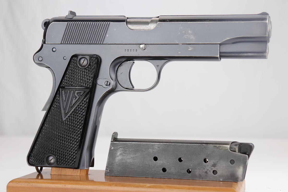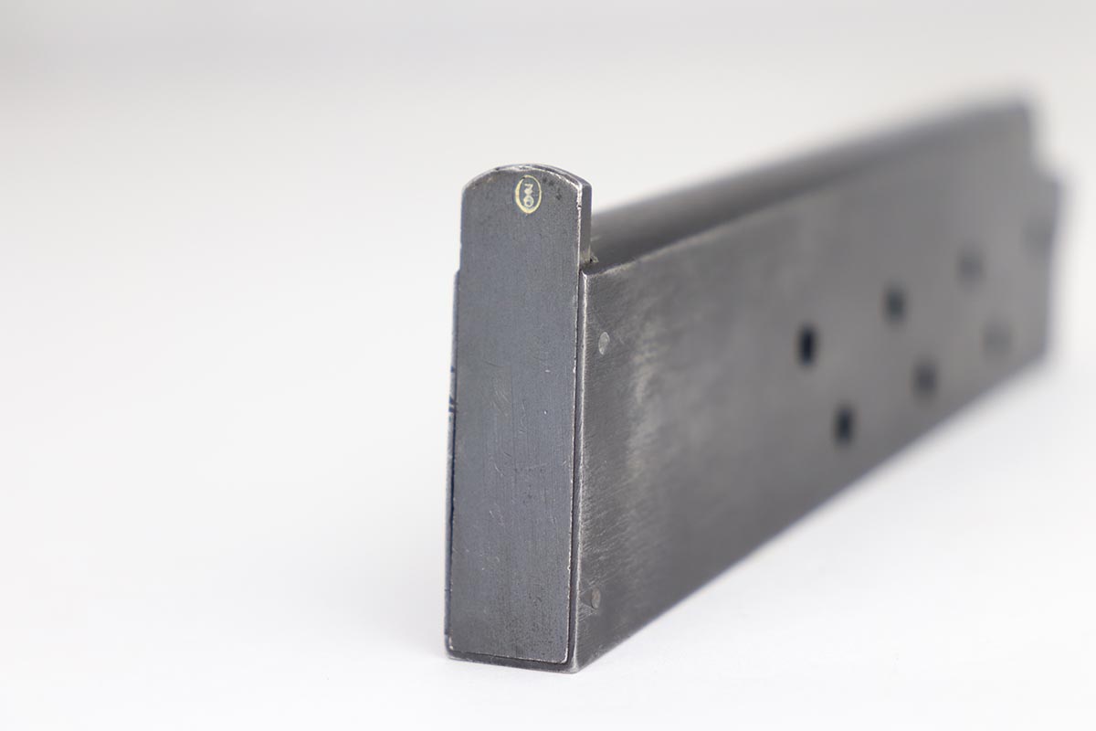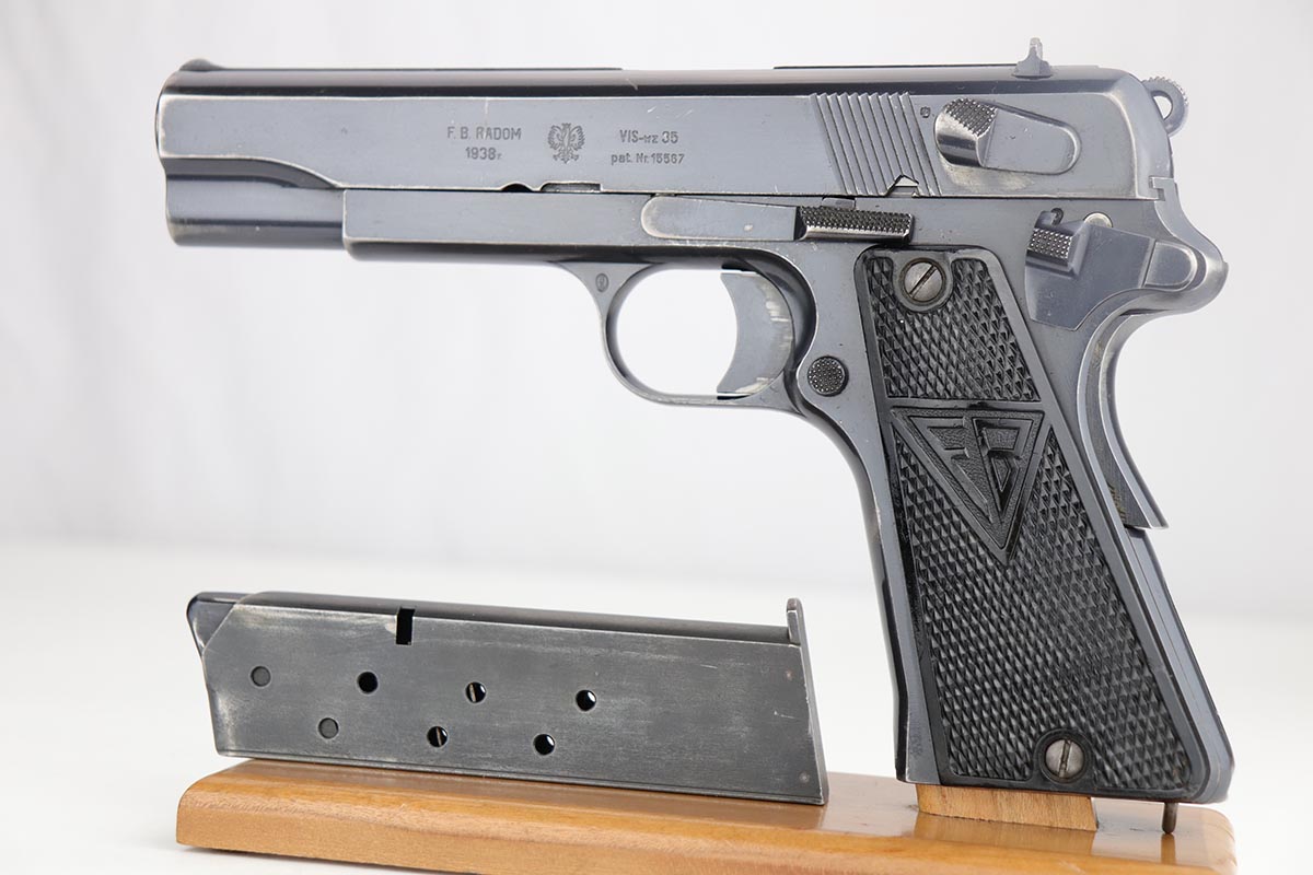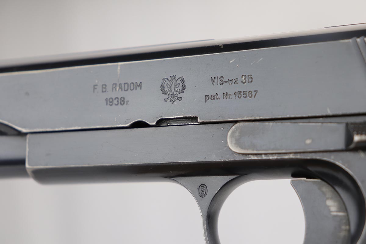 10/11/19 – This is a scarce and desirable Polish Eagle Radom from 1938. It’s all matching and correct, with proper G2 proofed magazine. The bluing on the pistol rates at about 95-96% with a notable spot of finish loss on the front strap, and another on the right side of the slide/frame, as well as the high edges. Nice original grips with a few dings and nicks, but no major defect. Bore has strong rifling and only minor frost. Note that the takedown lever spring is a little bit weak, so you have to hold it up when taking apart the pistol. Made for Polish officers before “all hell broke loose” with the invasion of both the Russians and the Nazi’s. Great piece of history. !
