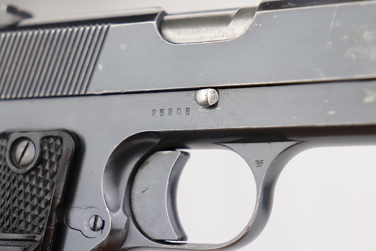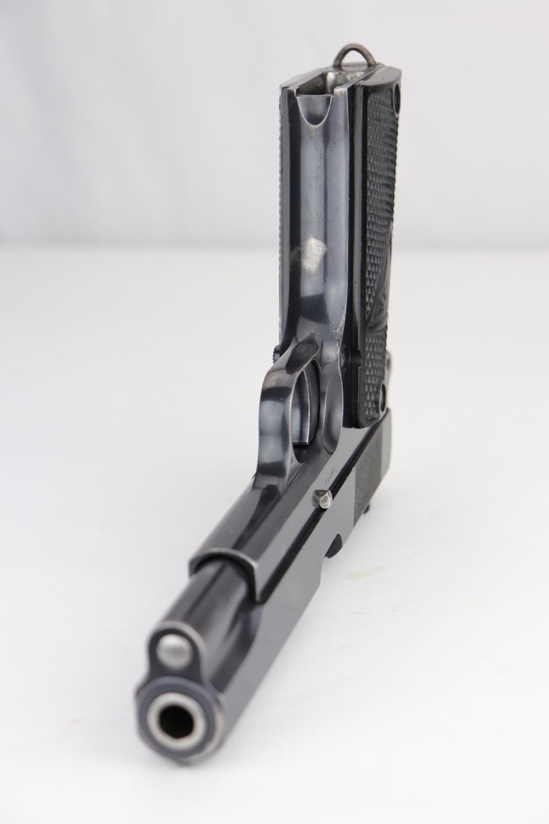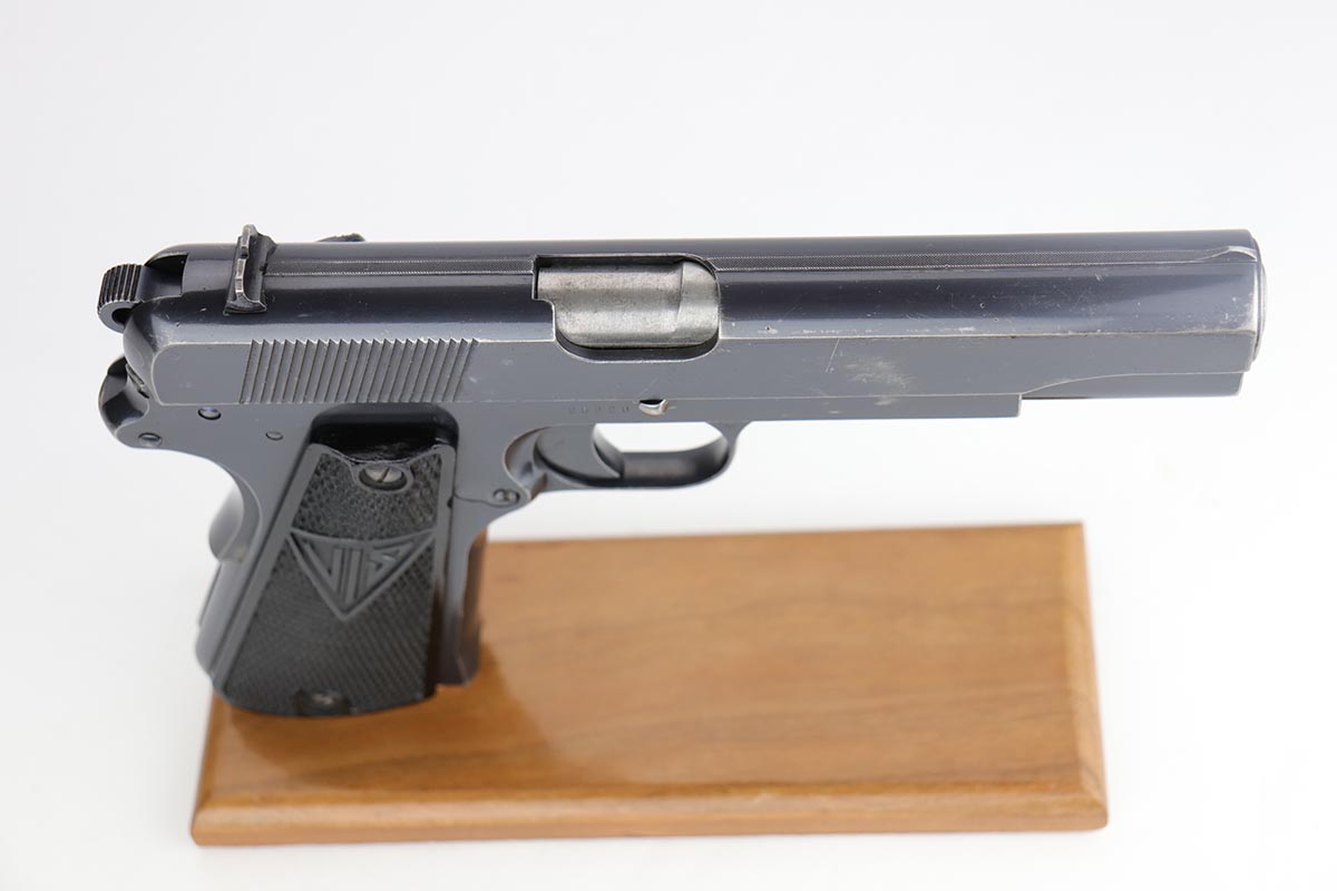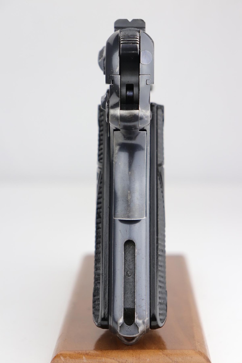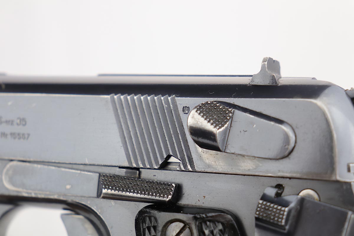 10/11/19 – This is a scarce and desirable Polish Eagle Radom from 1938. It’s all matching and correct, with proper G2 proofed magazine. The bluing on the pistol rates at about 95-96% with a notable spot of finish loss on the front strap, and another on the right side of the slide/frame, as well as the high edges. Nice original grips with a few dings and nicks, but no major defect. Bore has strong rifling and only minor frost. Note that the takedown lever spring is a little bit weak, so you have to hold it up when taking apart the pistol. Made for Polish officers before “all hell broke loose” with the invasion of both the Russians and the Nazi’s. Great piece of history. !