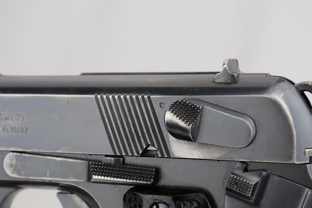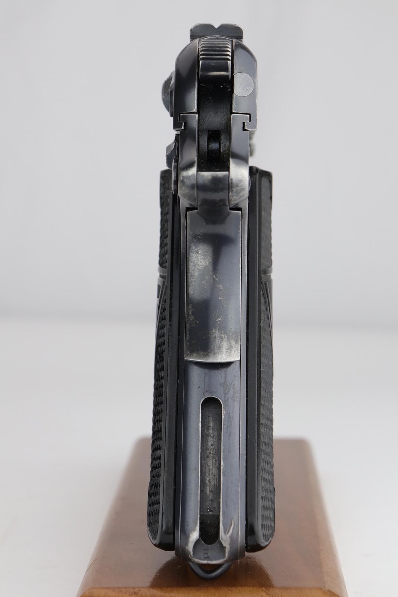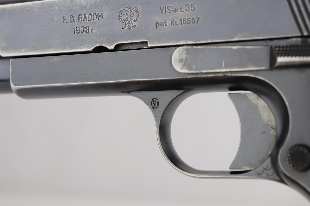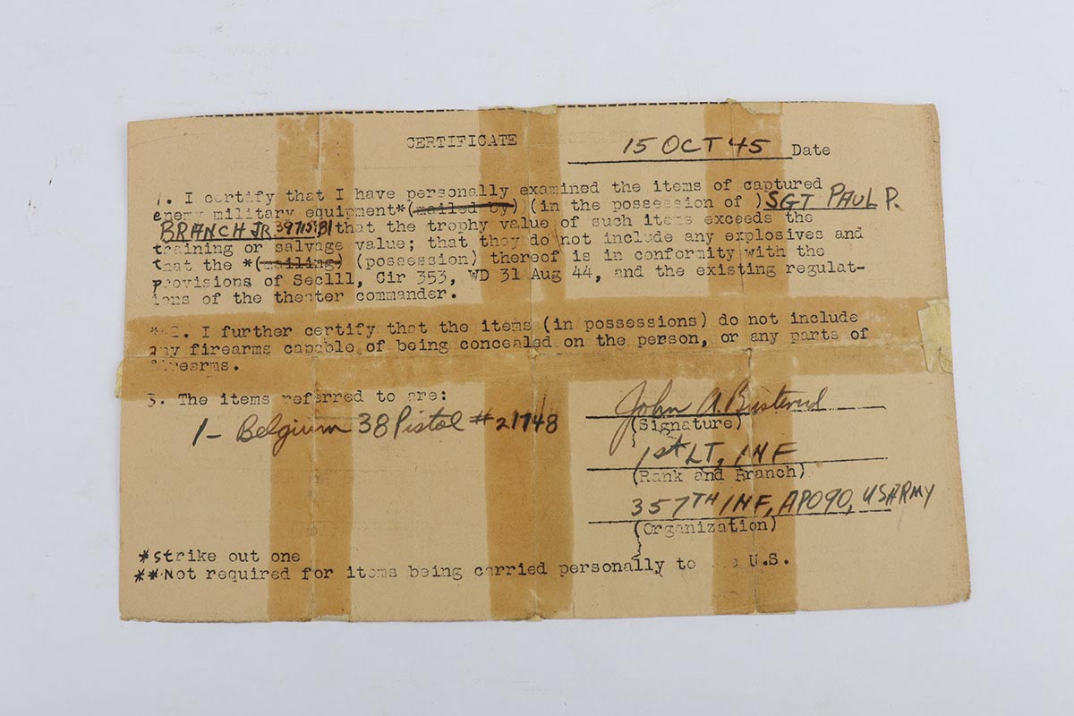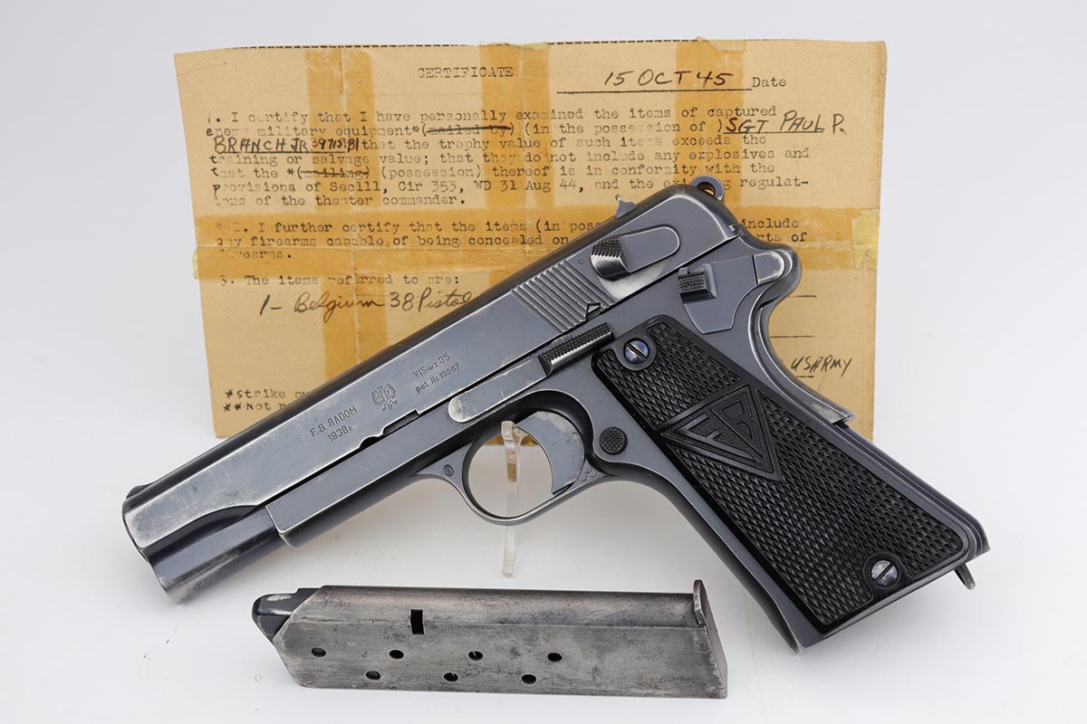 8/20/19 – This is a scarce and desirable Polish Eagle Radom from 1938, with the original capture document. The document is serialized to the pistol and states it was brought back by Sgt. Paul Branch in October of 1945. The pistol is all matching and original with about 85% blue remaining, showing wear on all surfaces but mostly the slide. Bore has strong rifling but some freckling throughout. Excellent grips with just a minor chip on the right panel.