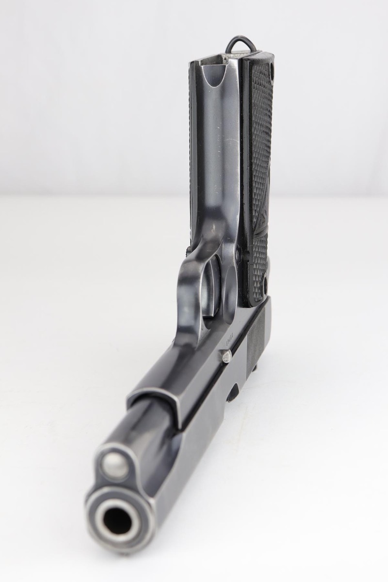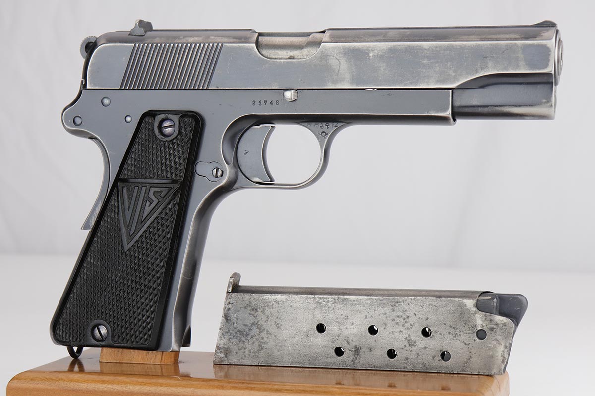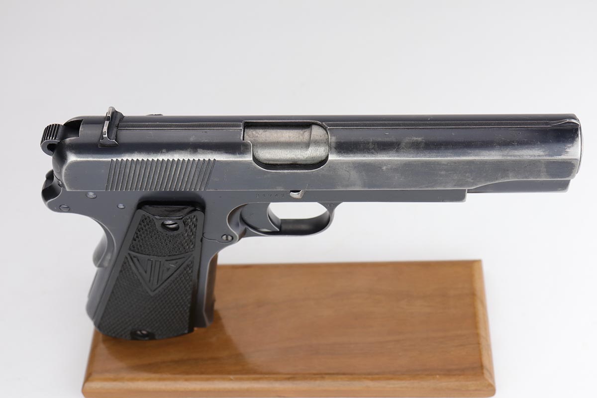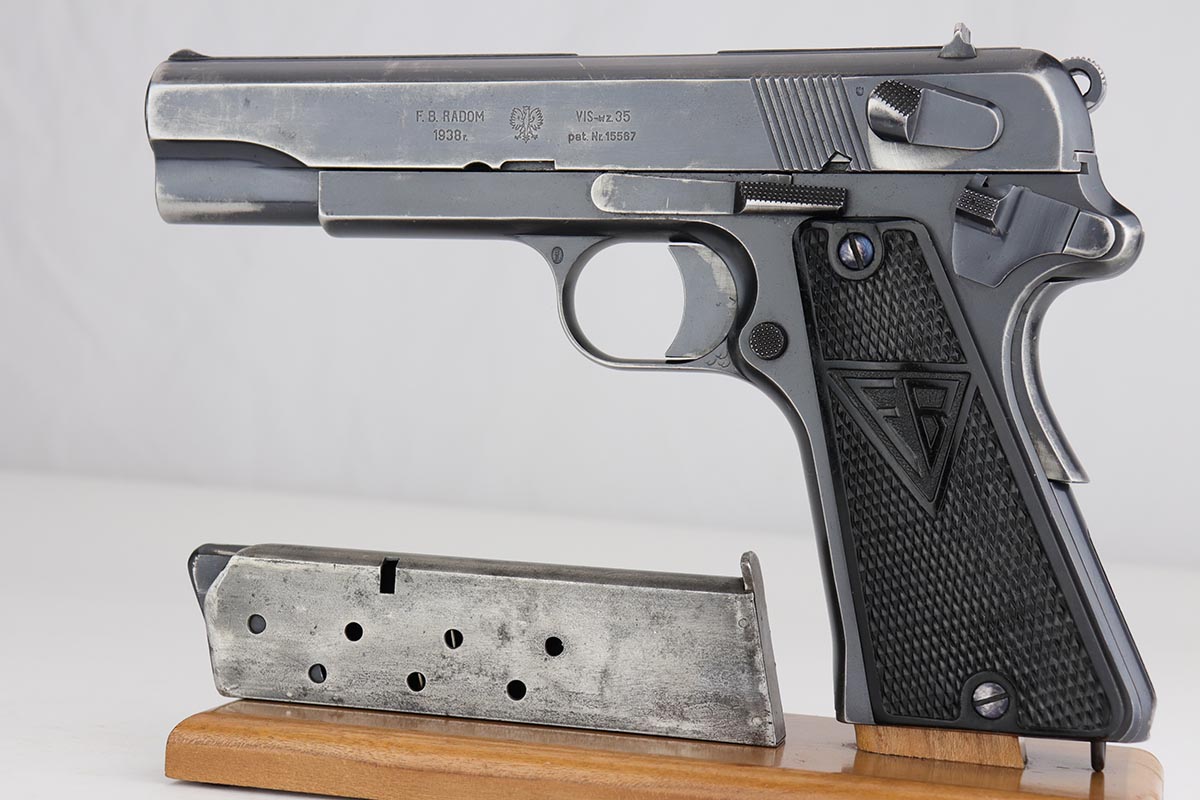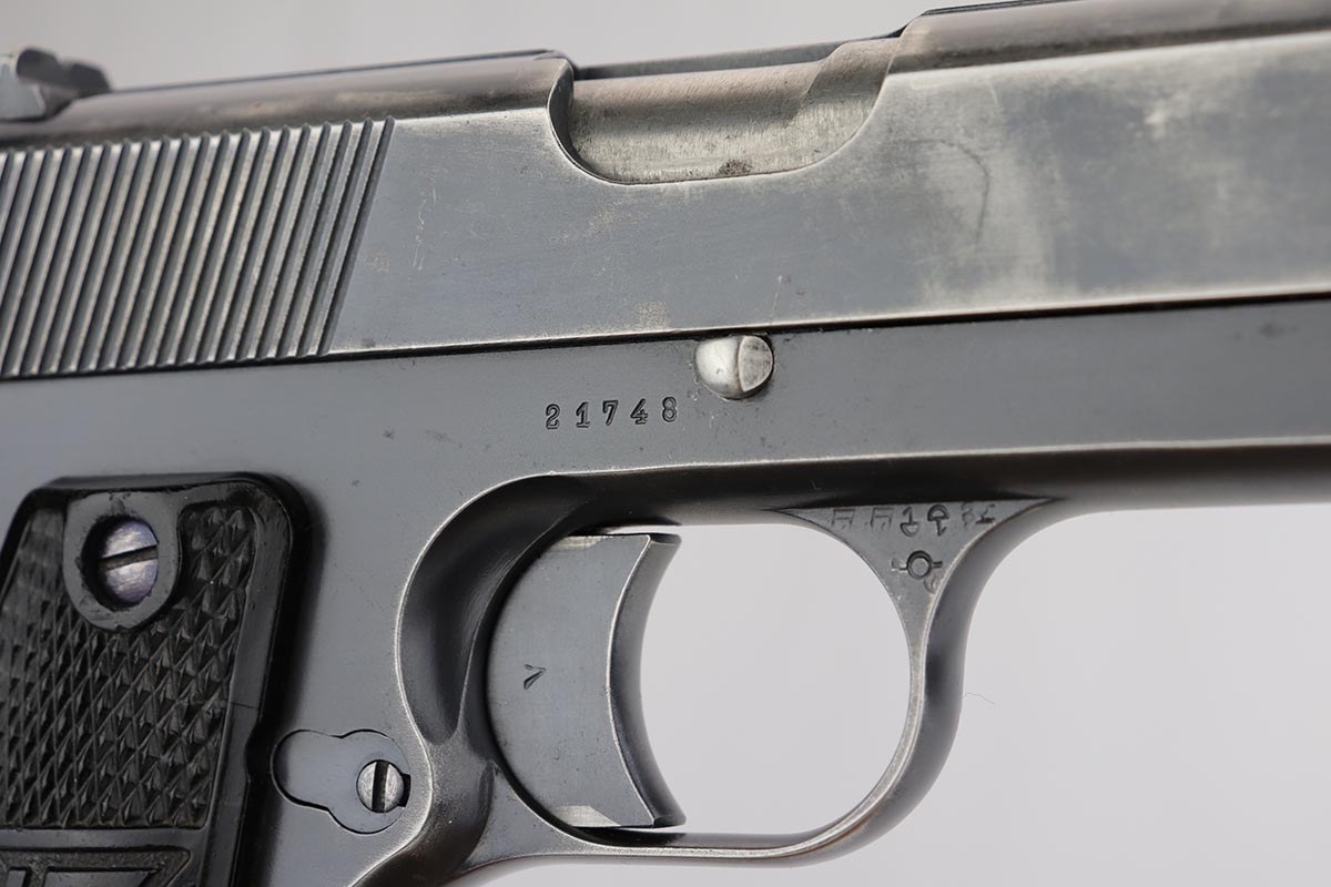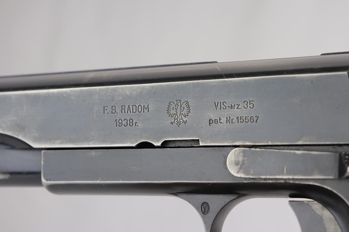 8/20/19 – This is a scarce and desirable Polish Eagle Radom from 1938, with the original capture document. The document is serialized to the pistol and states it was brought back by Sgt. Paul Branch in October of 1945. The pistol is all matching and original with about 85% blue remaining, showing wear on all surfaces but mostly the slide. Bore has strong rifling but some freckling throughout. Excellent grips with just a minor chip on the right panel.