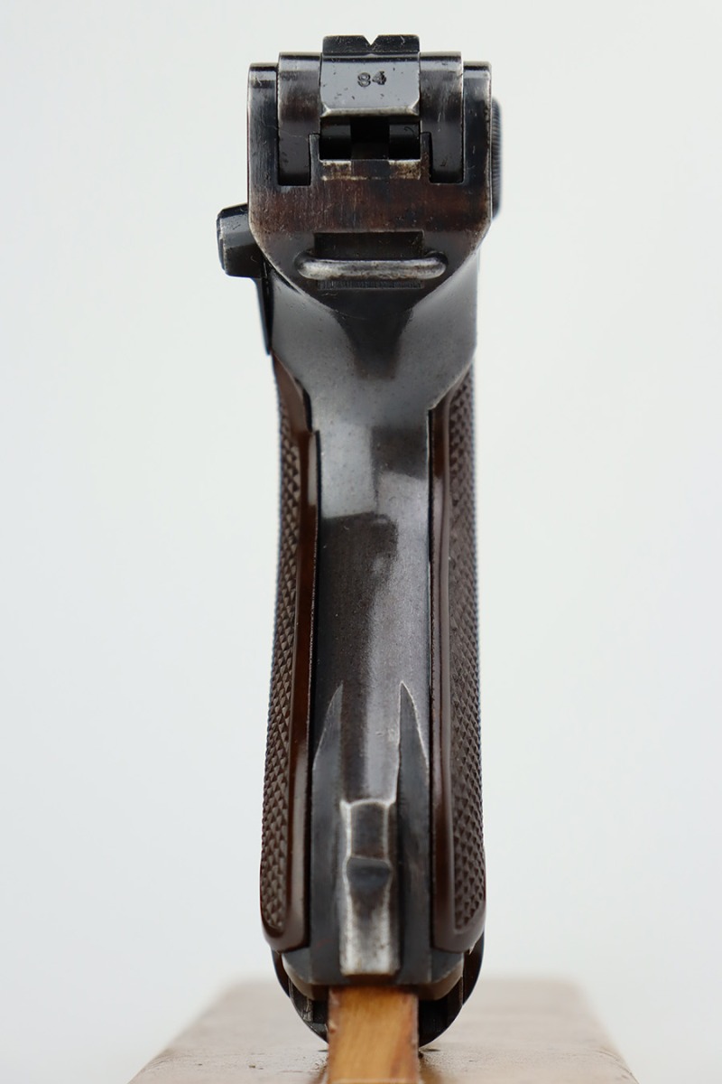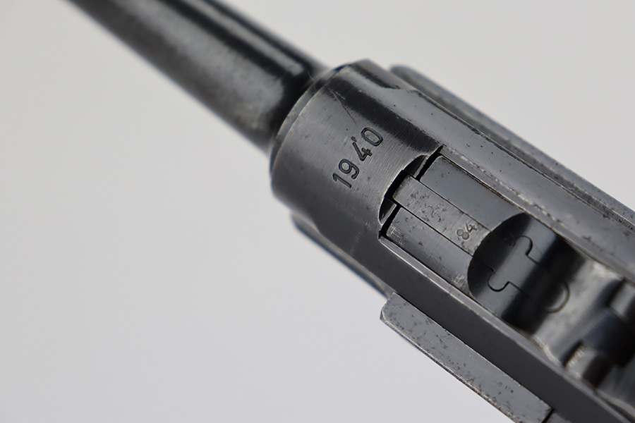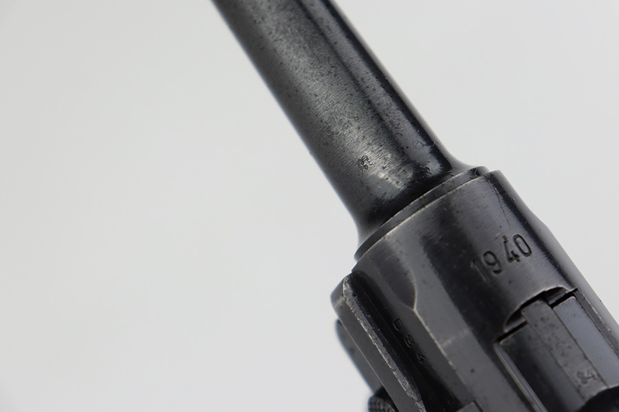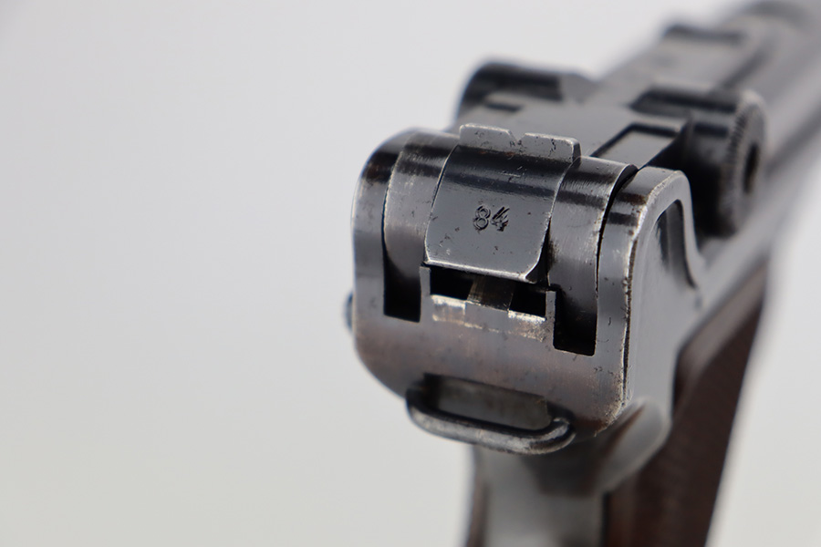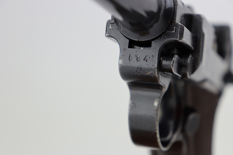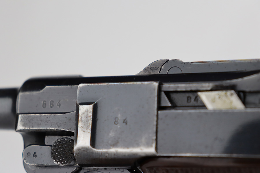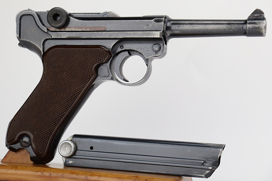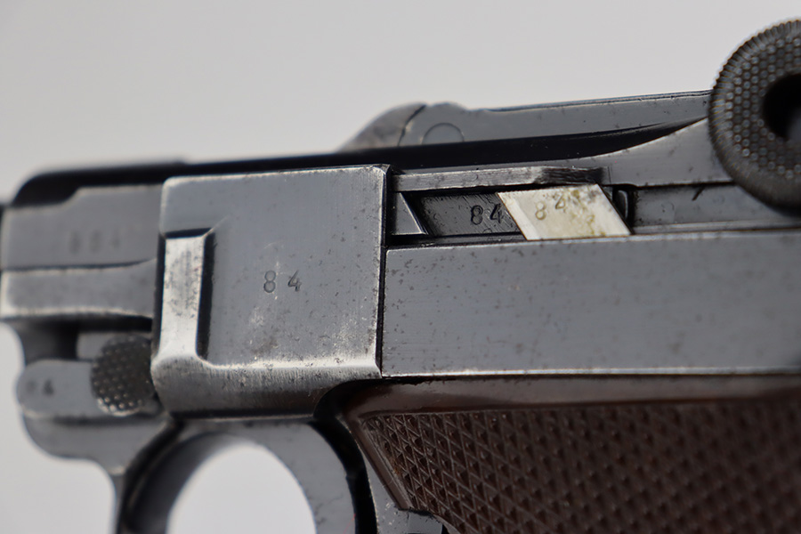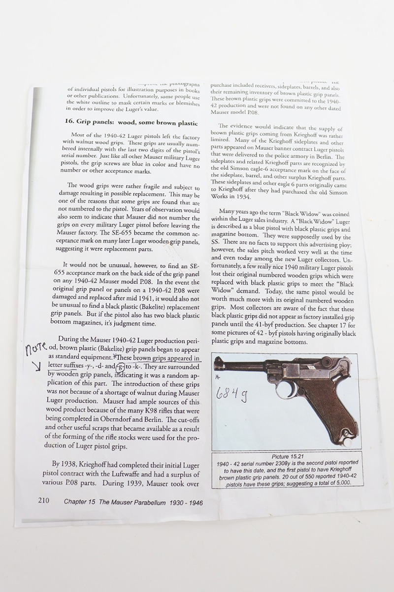 7/7/23 – This is a scarce Mauser Luger from 1940 with the brown Krieghoff grips. Certain letter blocks, including the G-block, had intermixed examples issued with the Krieghoff grips and this is is one of those pistols. All matching and original with 80-85% of the blue remaining. Wear along both sides of the barrel, as well as the sideplate, lower straps and right side rail. Bore is shiny with minor wear to the rifling. Excellent grips with no cracks or chips. Mismatched Mauser mag.