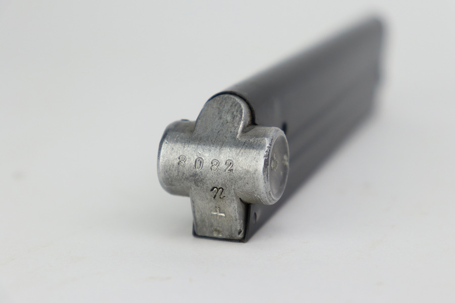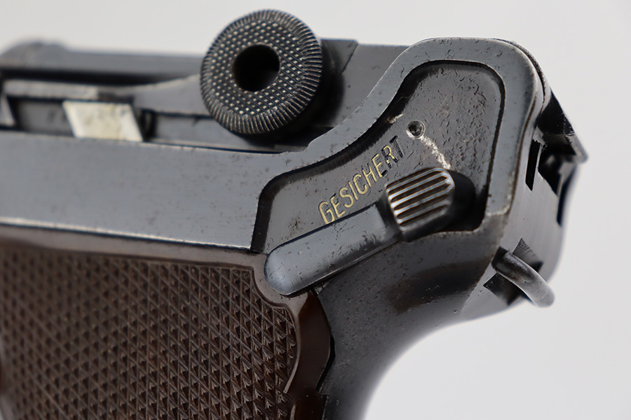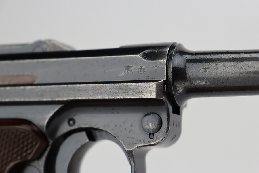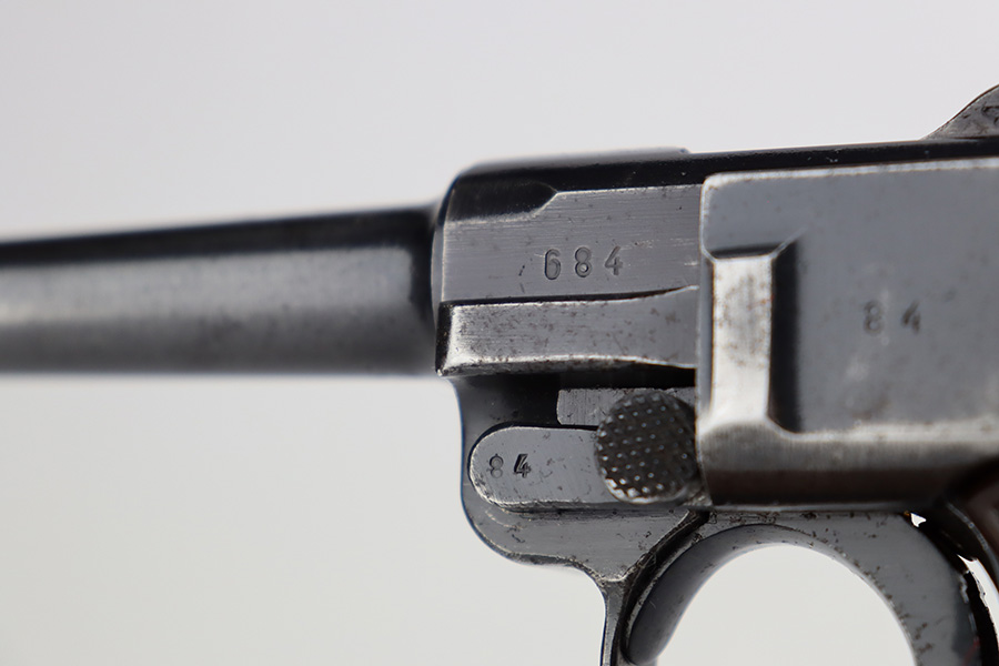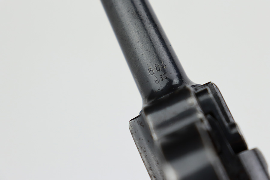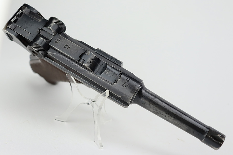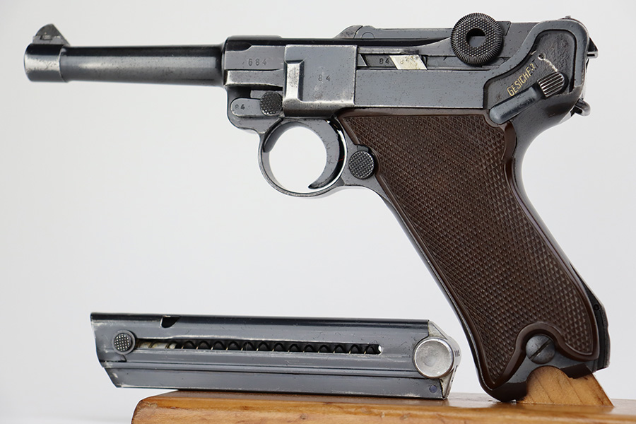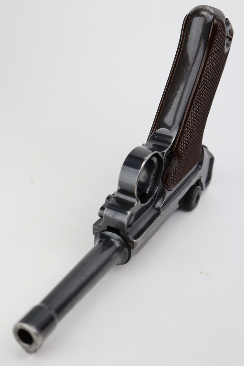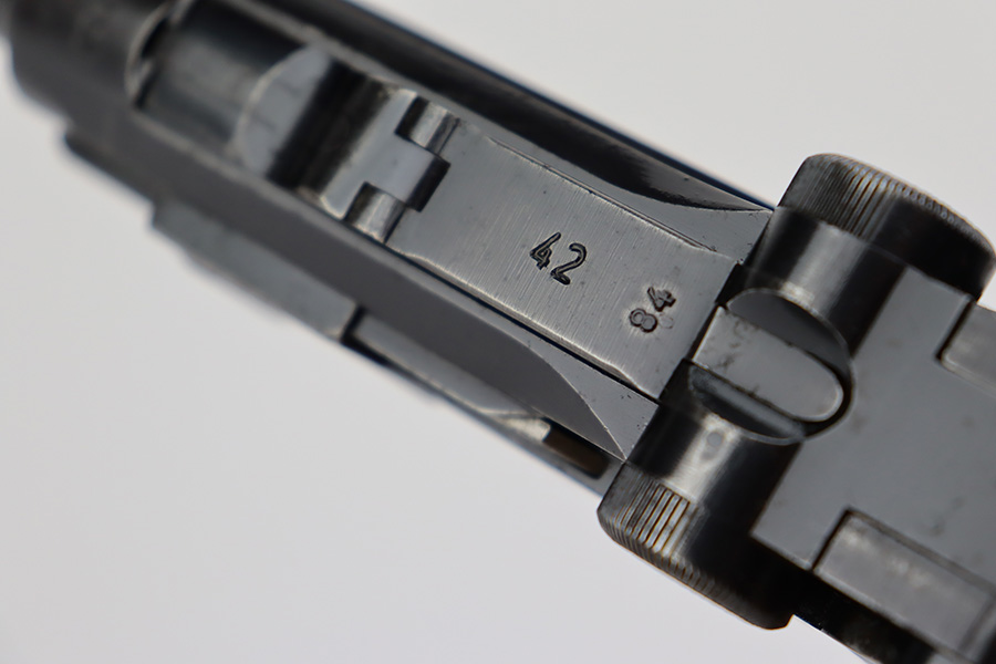 7/7/23 – This is a scarce Mauser Luger from 1940 with the brown Krieghoff grips. Certain letter blocks, including the G-block, had intermixed examples issued with the Krieghoff grips and this is is one of those pistols. All matching and original with 80-85% of the blue remaining. Wear along both sides of the barrel, as well as the sideplate, lower straps and right side rail. Bore is shiny with minor wear to the rifling. Excellent grips with no cracks or chips. Mismatched Mauser mag.
