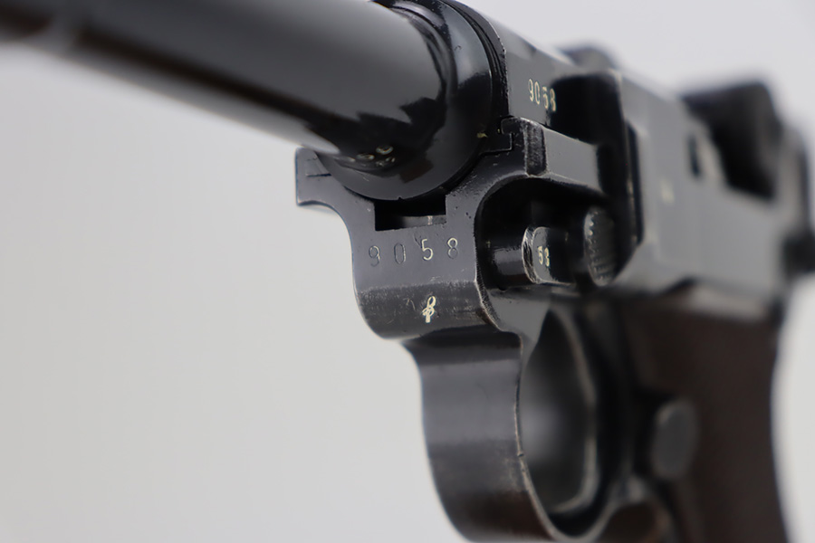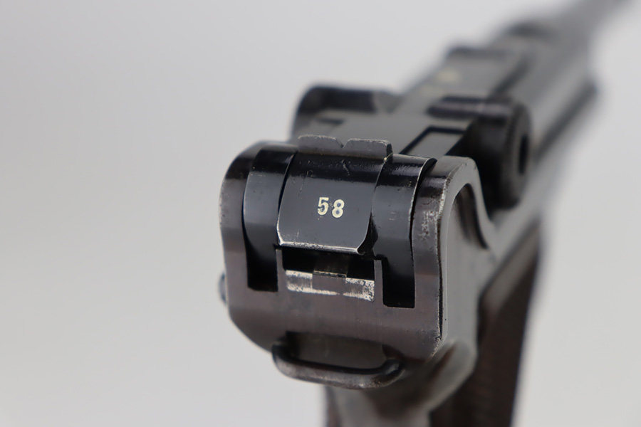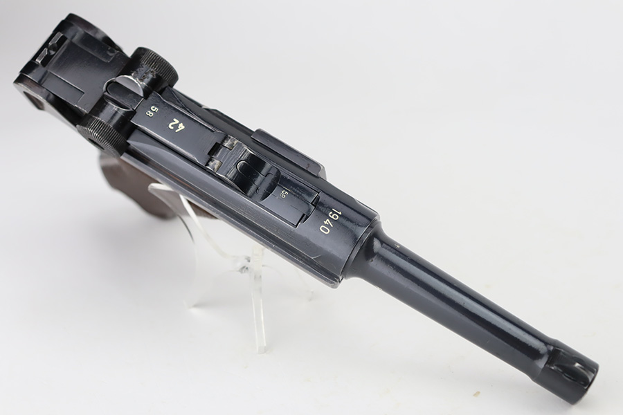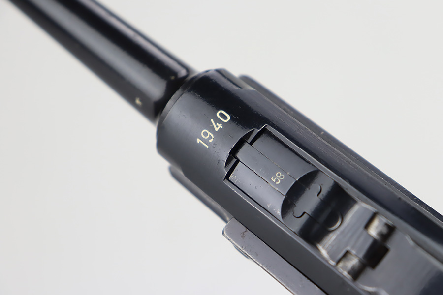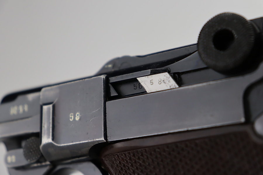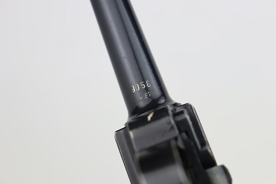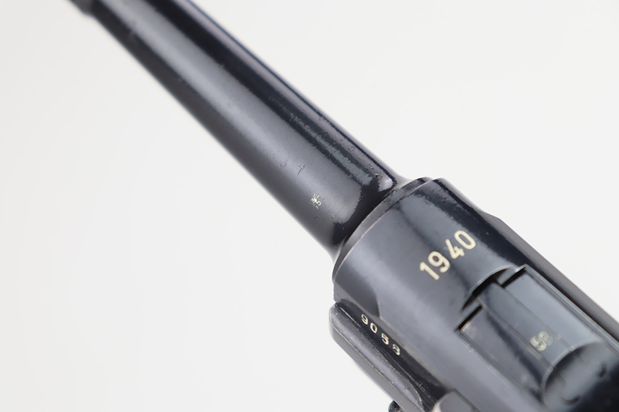 9/25/23 – This 1940 dated Mauser Luger is all original and has the rare, reddish Krieghoff grips on it. A very small set of 1940 lugers have these grips on them from the factory. It is assumed that they experimented with the HK grips as an option before they started making their own black plastic grips. These grips are found in the G to K blocks, so the F block is right in the middle of this group of 1940 Lugers. This one is all matching and comes with one original matching magazine. The majority of the wear is on the grip straps, where there is also some pin-pricking. The grips are excellent. The bore has decent rifling, but there is pin-pricking throughout.