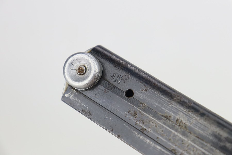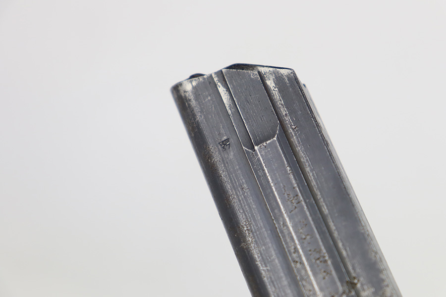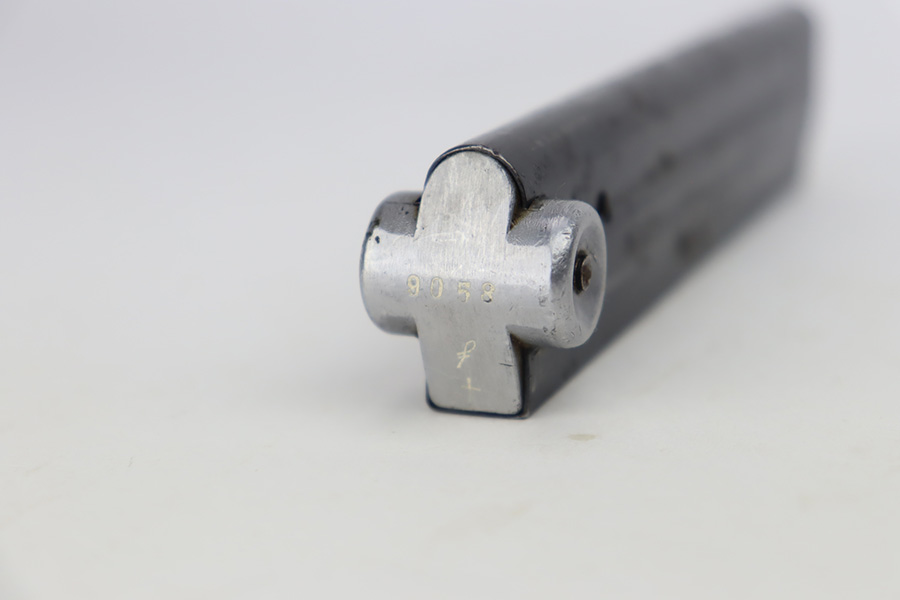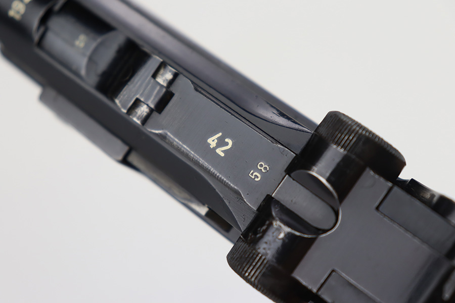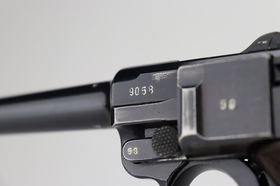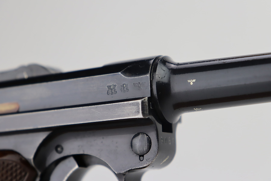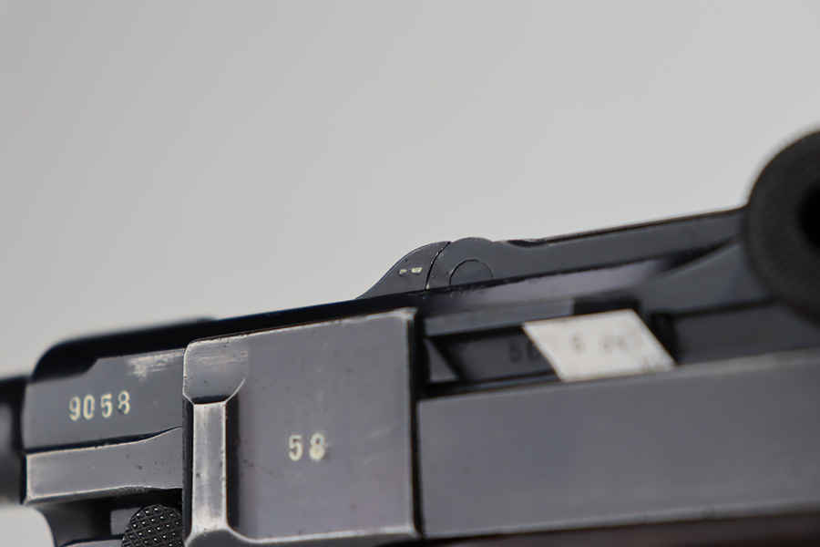 9/25/23 – This 1940 dated Mauser Luger is all original and has the rare, reddish Krieghoff grips on it. A very small set of 1940 lugers have these grips on them from the factory. It is assumed that they experimented with the HK grips as an option before they started making their own black plastic grips. These grips are found in the G to K blocks, so the F block is right in the middle of this group of 1940 Lugers. This one is all matching and comes with one original matching magazine. The majority of the wear is on the grip straps, where there is also some pin-pricking. The grips are excellent. The bore has decent rifling, but there is pin-pricking throughout.