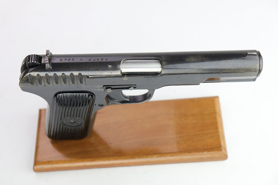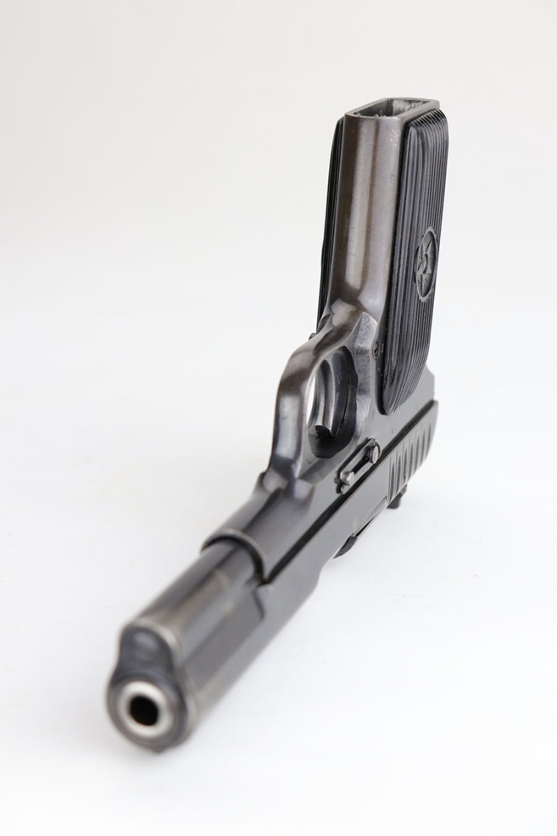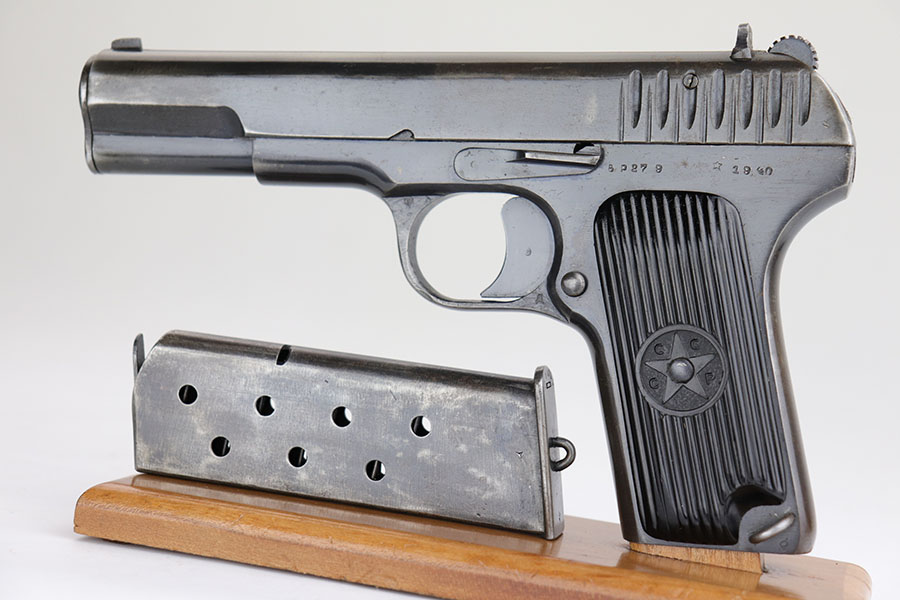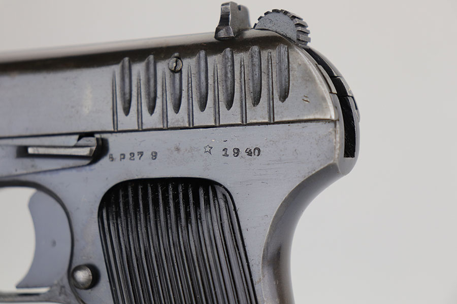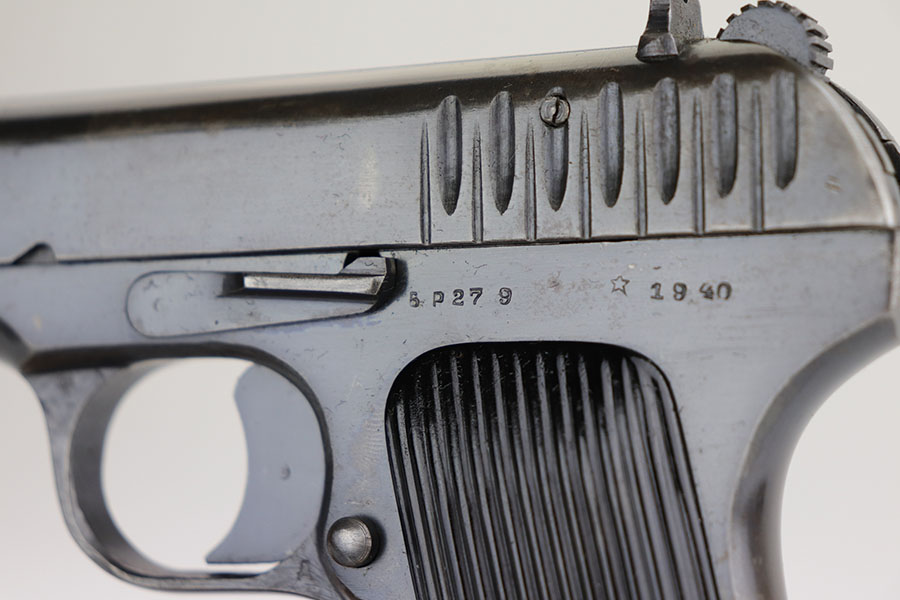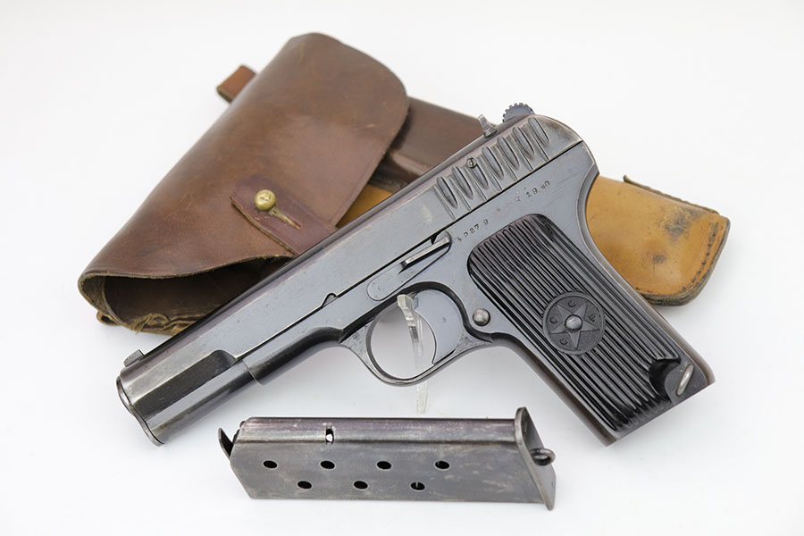 3/31/20 – This is an all matching and original example of a hard-to-find Tokarev TT-33, as produced in 1940 at the Tula factory. We don’t come across these often, and when we do, they are usually quite worn. This one has some high edge thinning on the slide and some patina of the straps, but no pitting and no areas that are eyesores. Magazine is original but mismatched to the gun. Excellent grips and comes with an original holster. Bore has strong rifling but some frost and minor freckling in the grooves.