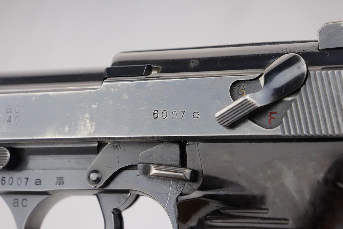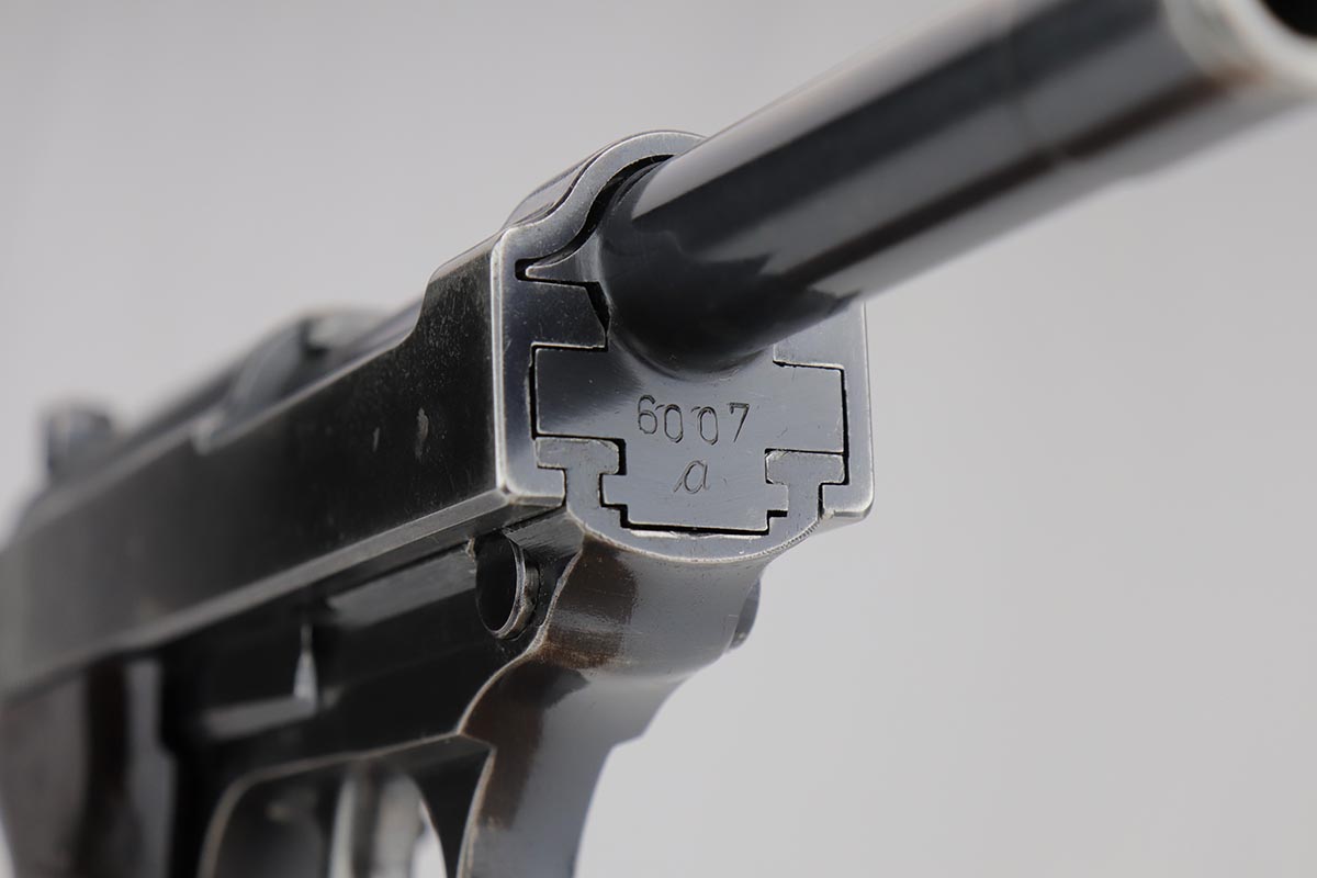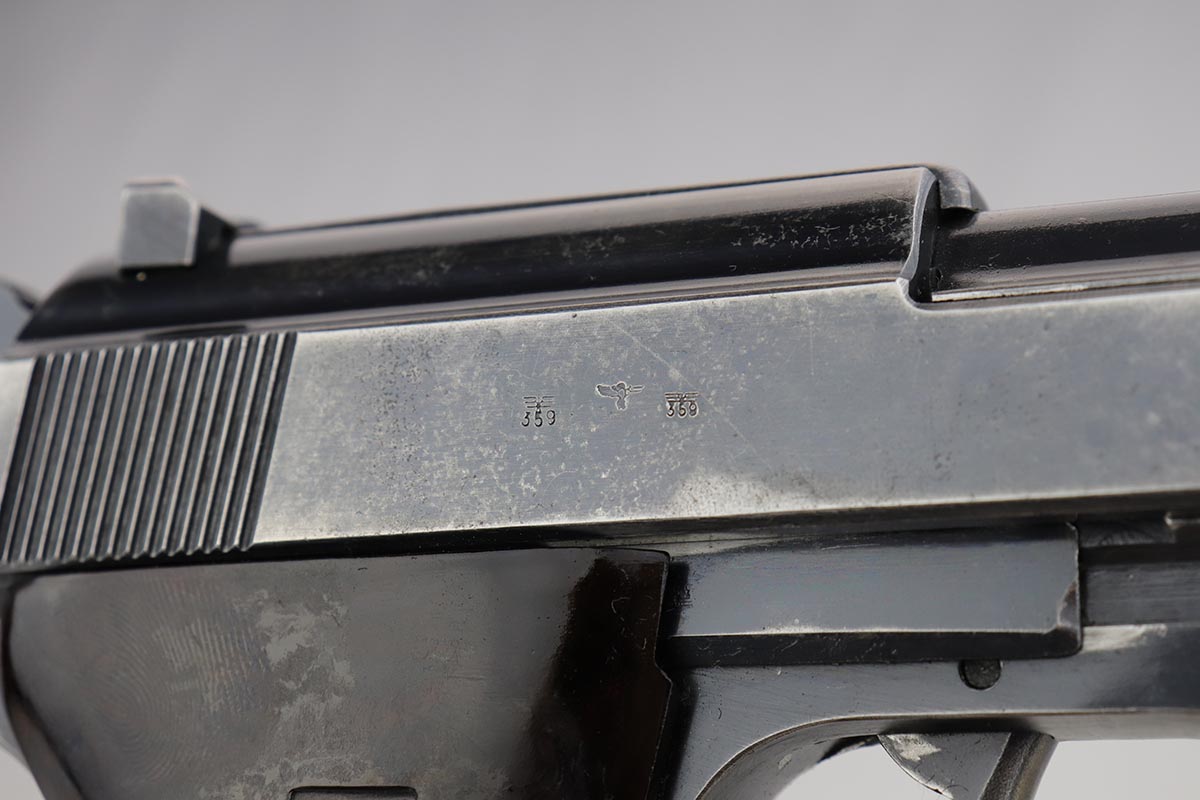 8/20/19 – This is a 1940 Walther P.38 with original capture papers from World War II. The original finish is about 85% with wear on all surfaces, but most notably the top and right sides of the slide. All parts are matching, including the girps! The slide, frame, grips and smalls parts are all E/359 proofed. Excellent bore. There were fewer than 14,000 of these pistols produced! The capture document is numbered to the pistol. This pistol is in the “a” block and comes with an “ac” marked magazine.