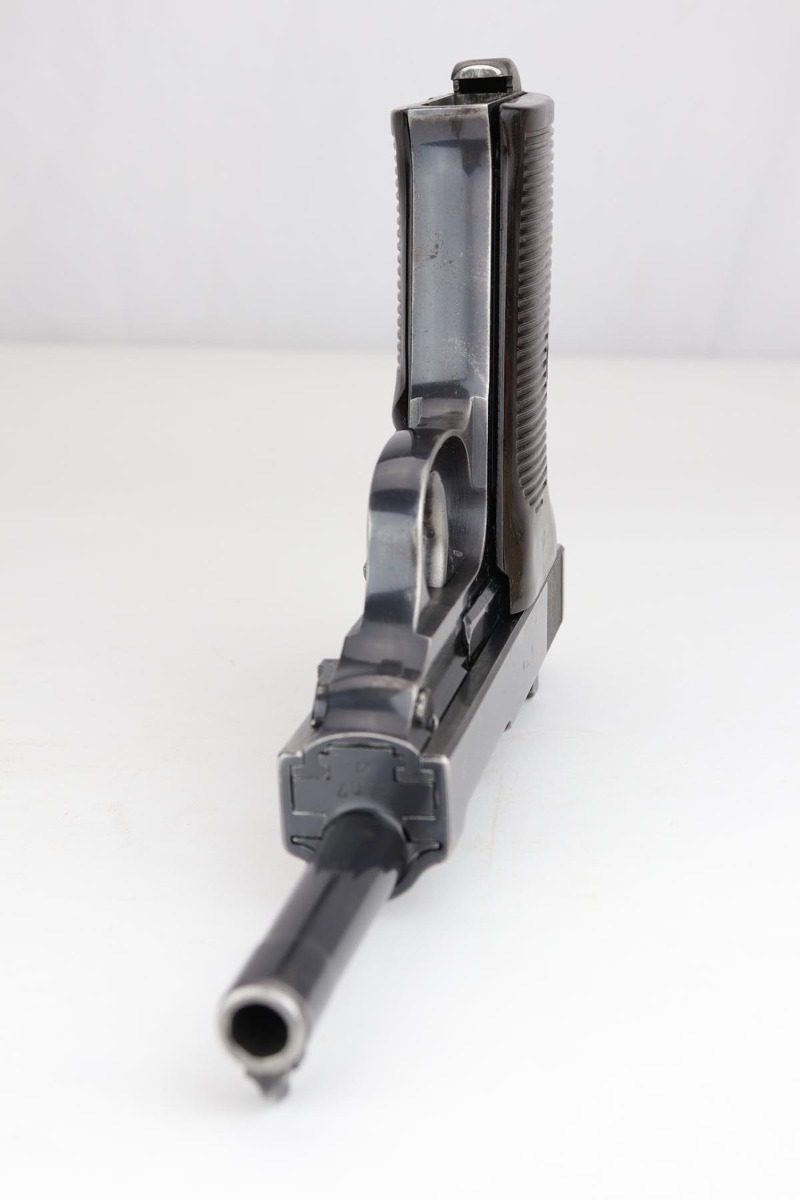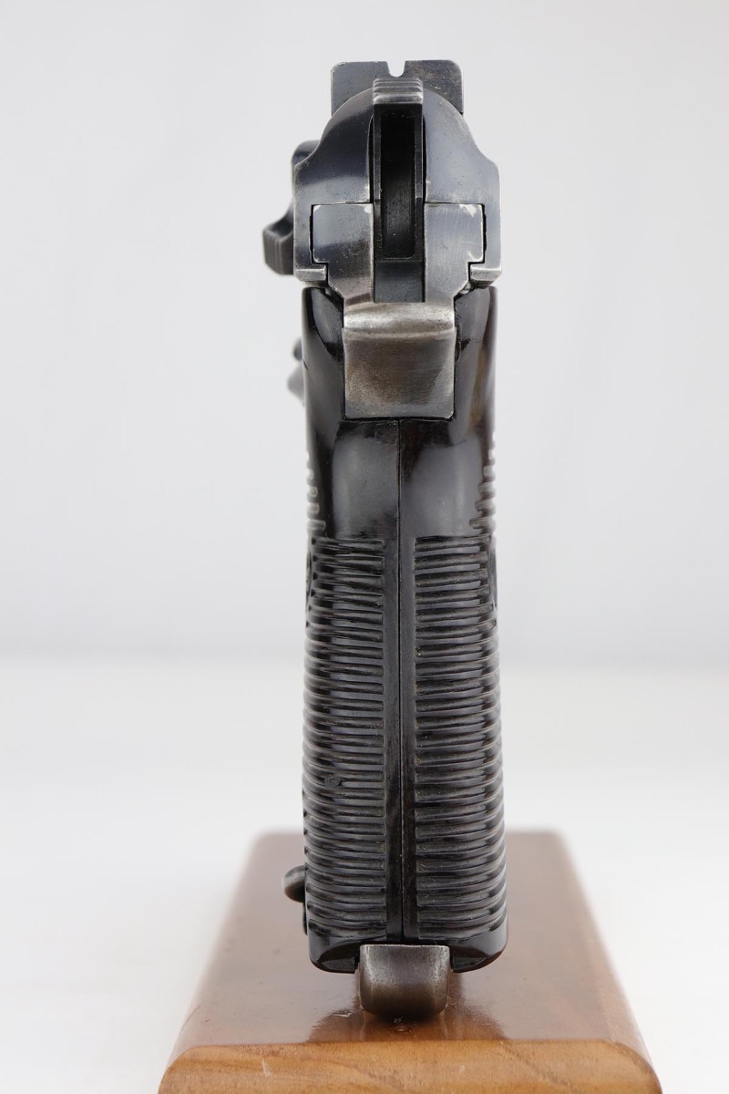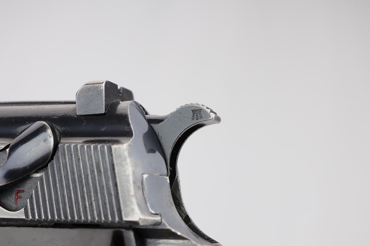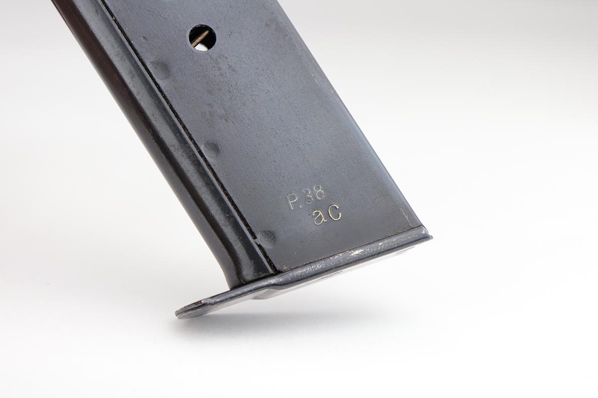 8/20/19 – This is a 1940 Walther P.38 with original capture papers from World War II. The original finish is about 85% with wear on all surfaces, but most notably the top and right sides of the slide. All parts are matching, including the girps! The slide, frame, grips and smalls parts are all E/359 proofed. Excellent bore. There were fewer than 14,000 of these pistols produced! The capture document is numbered to the pistol. This pistol is in the “a” block and comes with an “ac” marked magazine.