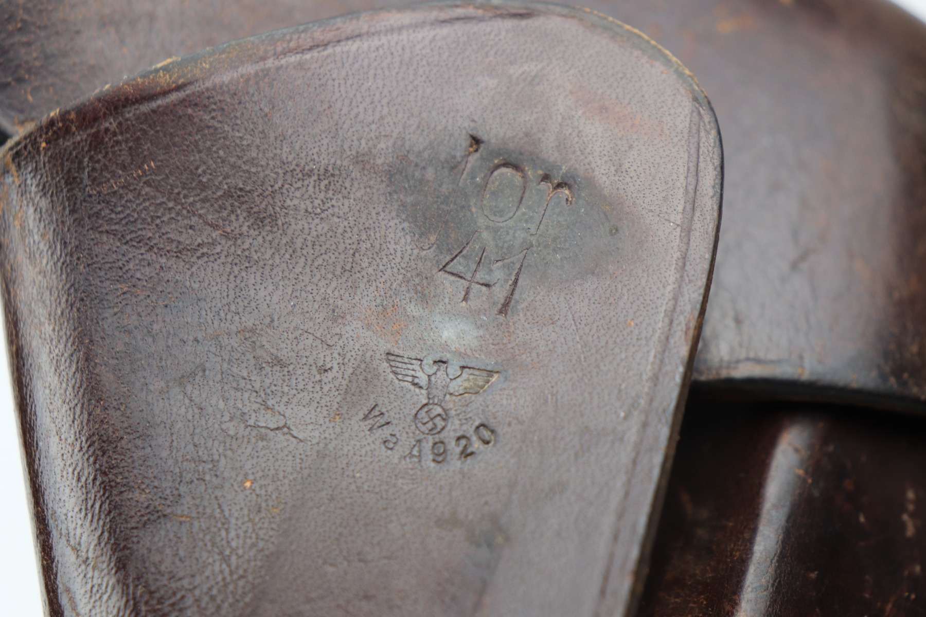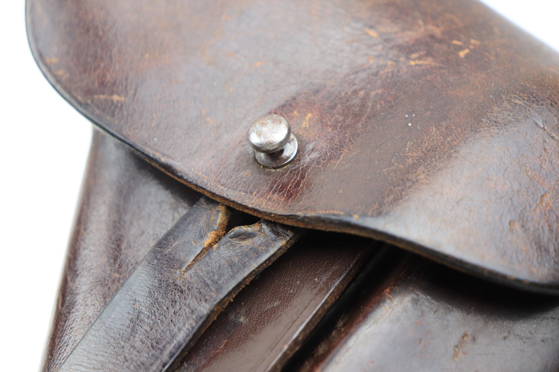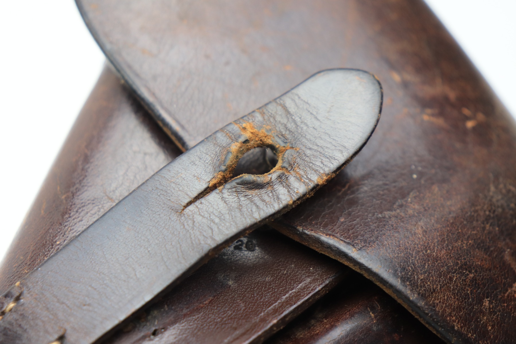 1/29/22 – This is a fairly scarce, early variation High Power holster. The holster is maker stamped “JOR” under the closure strap. Below the maker stamp is a ’41 date and waffen proof stamp. The leather has normal pliability and typical use wear throughout. There’s some mild surface scuffs but no major issues. The stitching is loose and partially missing at the toe, and there’s evidence of re-stitching on the closure strap. However, this is likely a field repair as the stitching looks aged.
