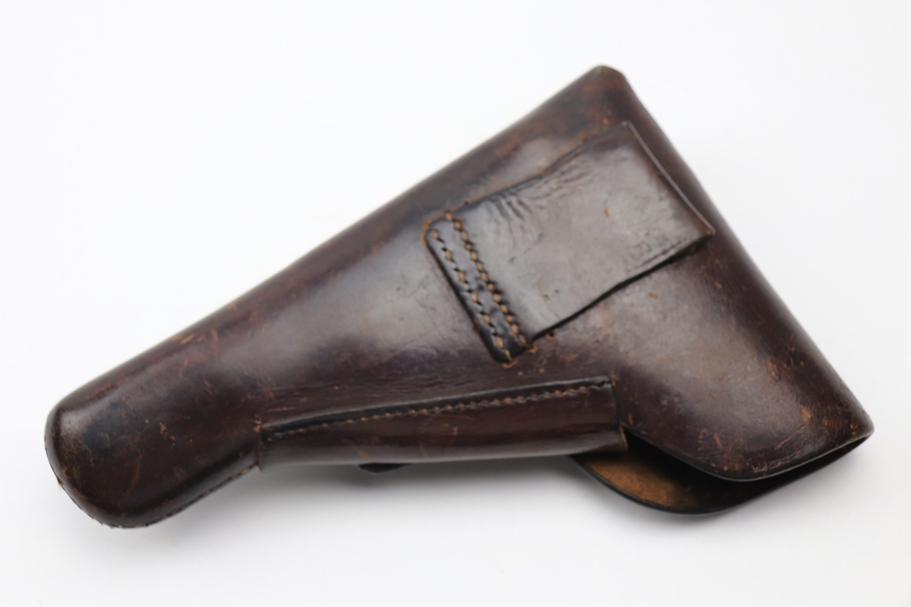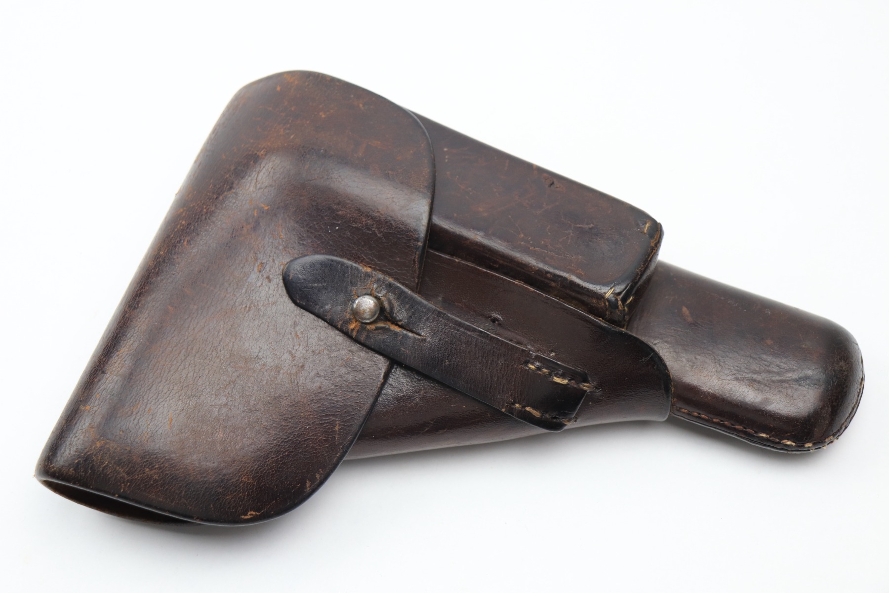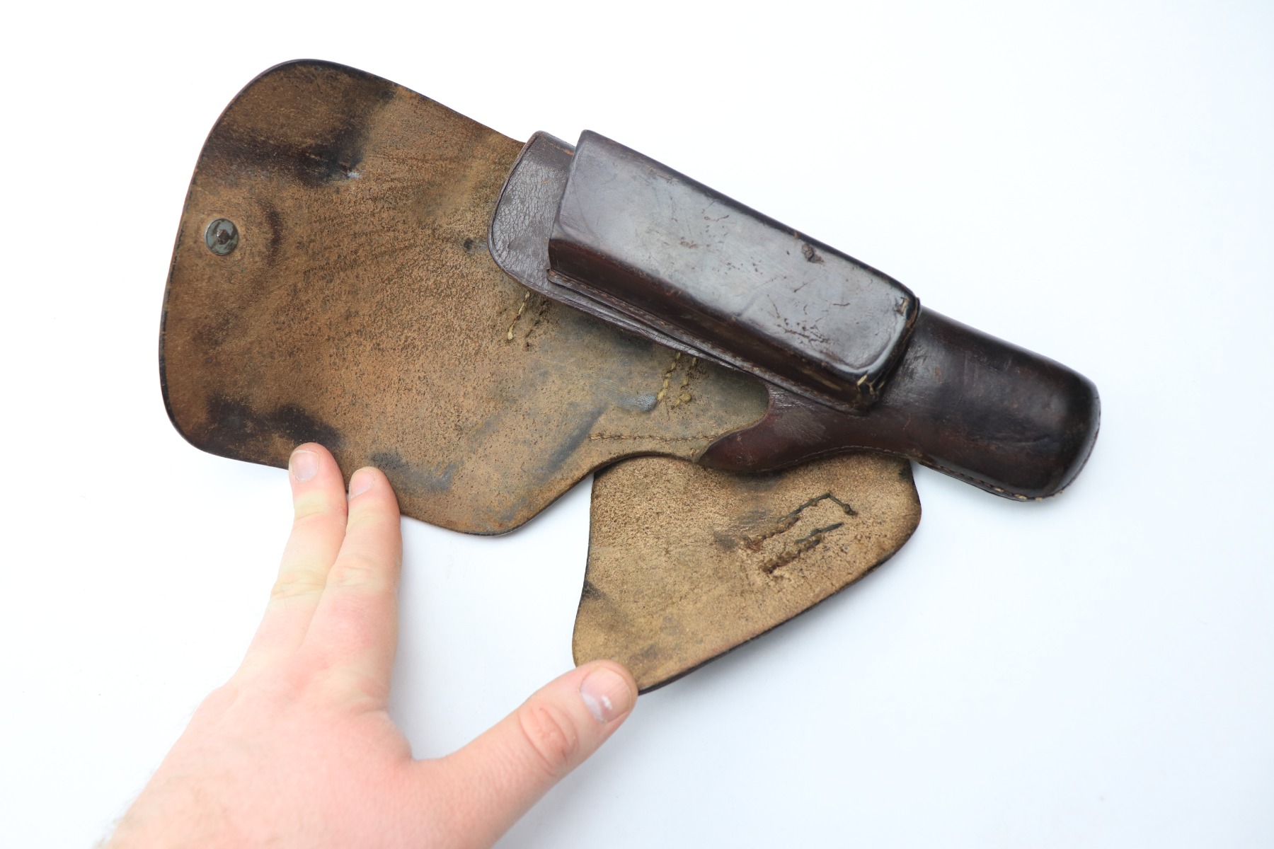 1/29/22 – This is a fairly scarce, early variation High Power holster. The holster is maker stamped “JOR” under the closure strap. Below the maker stamp is a ’41 date and waffen proof stamp. The leather has normal pliability and typical use wear throughout. There’s some mild surface scuffs but no major issues. The stitching is loose and partially missing at the toe, and there’s evidence of re-stitching on the closure strap. However, this is likely a field repair as the stitching looks aged.