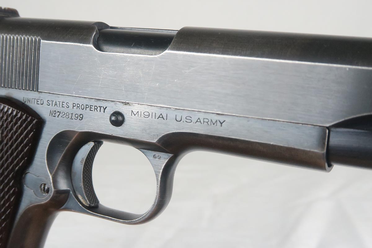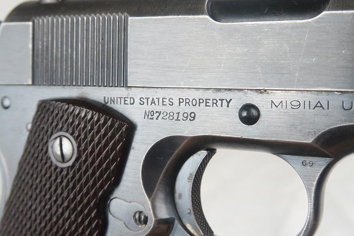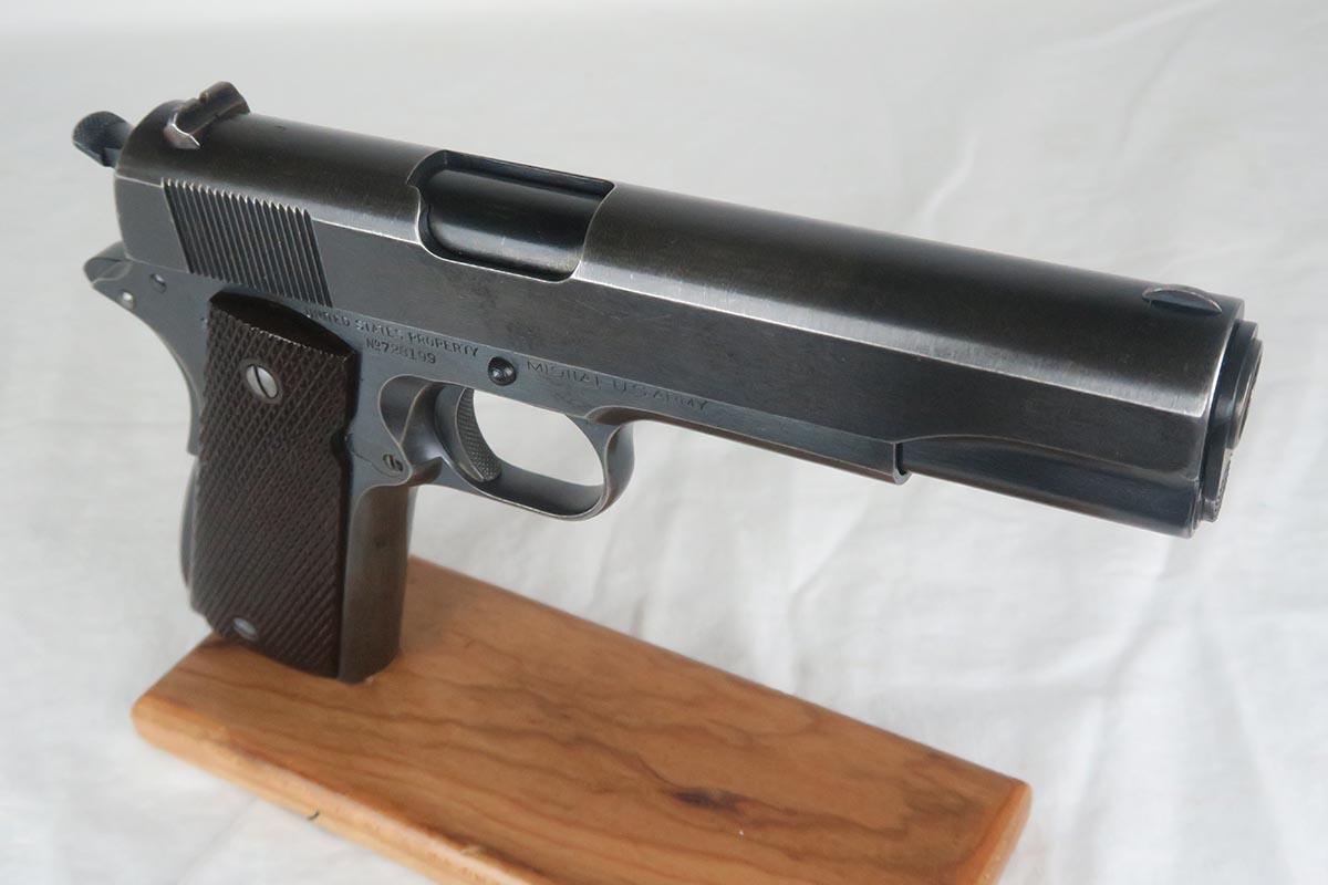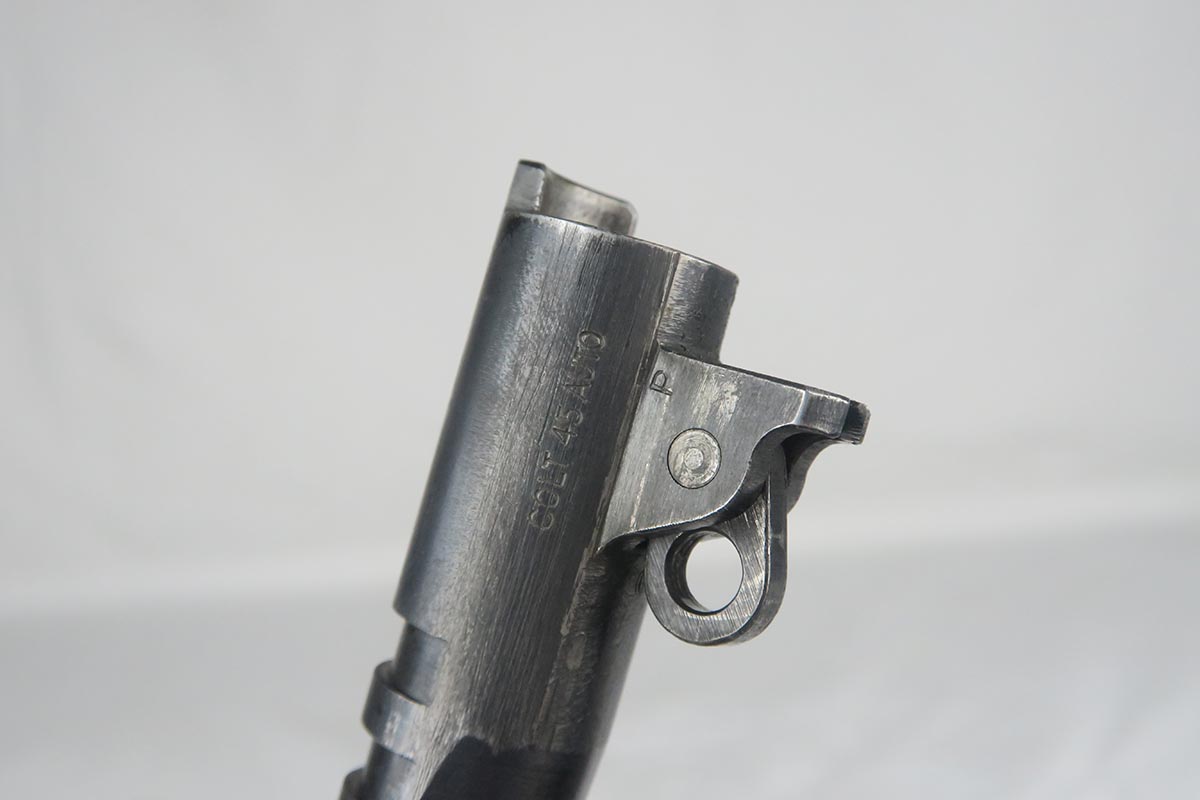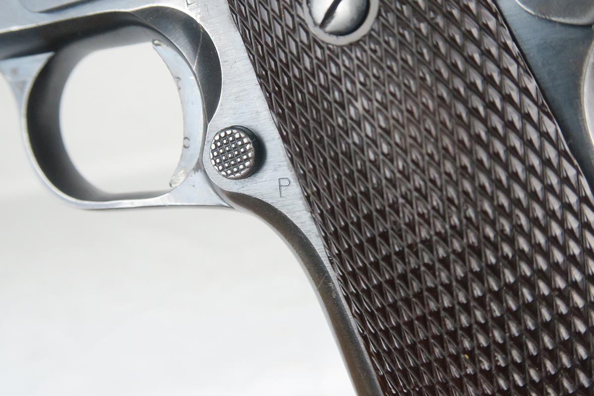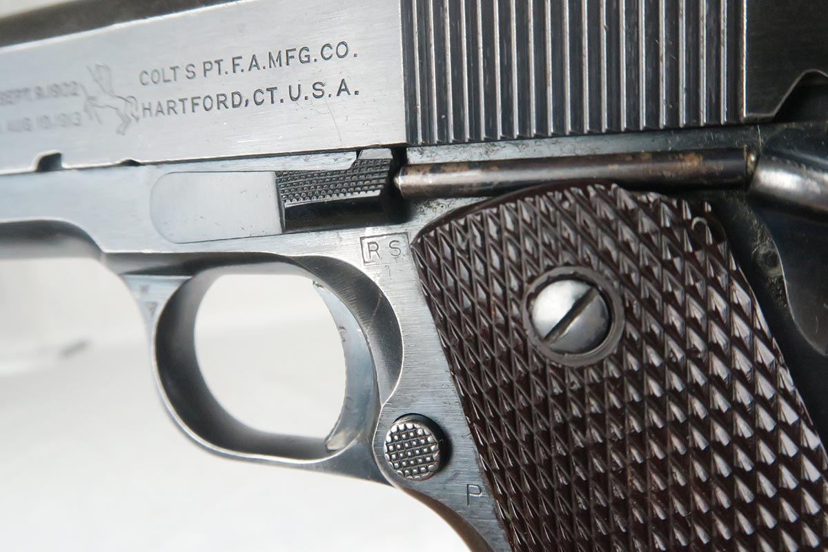 12/8/17 – This is a desirable RS marked 1941 Colt 1911A1.  It has the early WW2 brush blue finish, before it switched to parkerizing.  The gun is all original and correct with matching numbered slide, RS proof on frame (external and internal), Colt barrel with early G proof, and P proofs on frame and slide.  Comes with hollowed back grips, which were unique for the 1941/42 Colts.  Original finish rates about 92% with general thinning throughout.  Bore shows minor use but is still shiny with strong rifling.  S marked magazine.