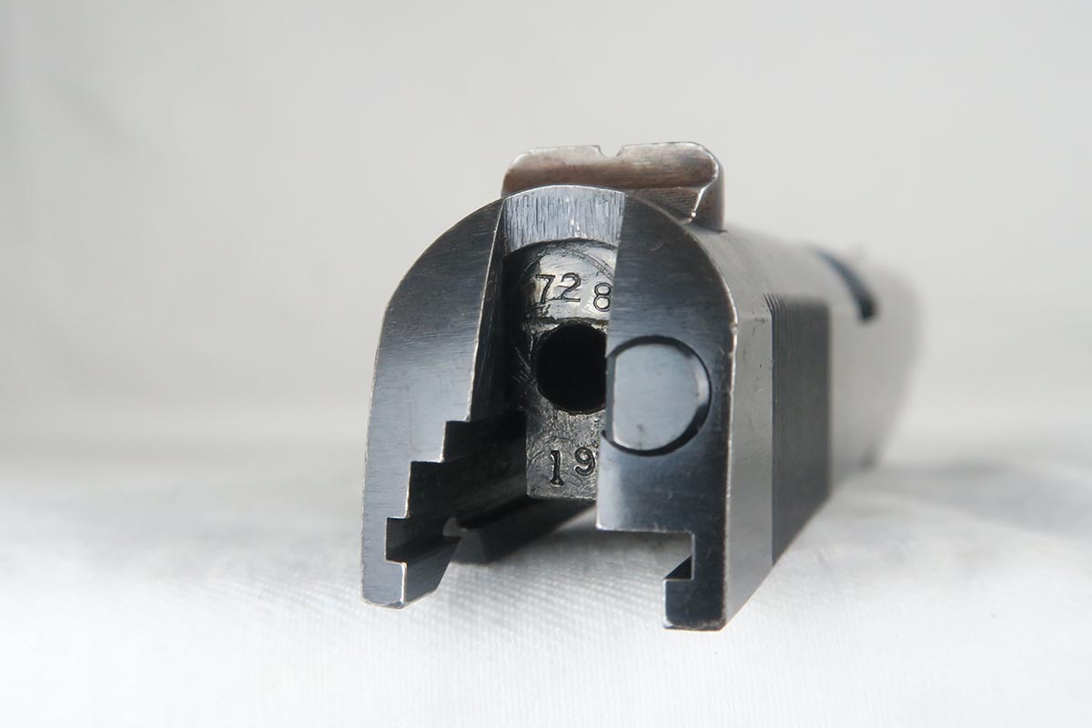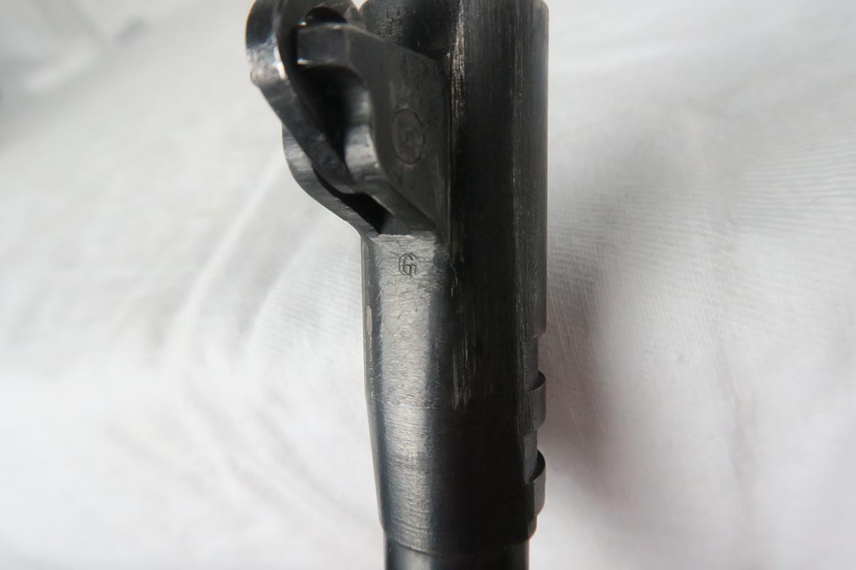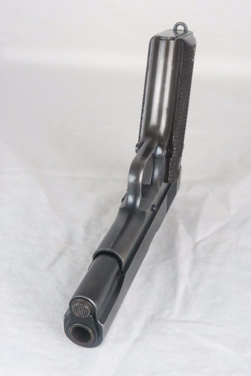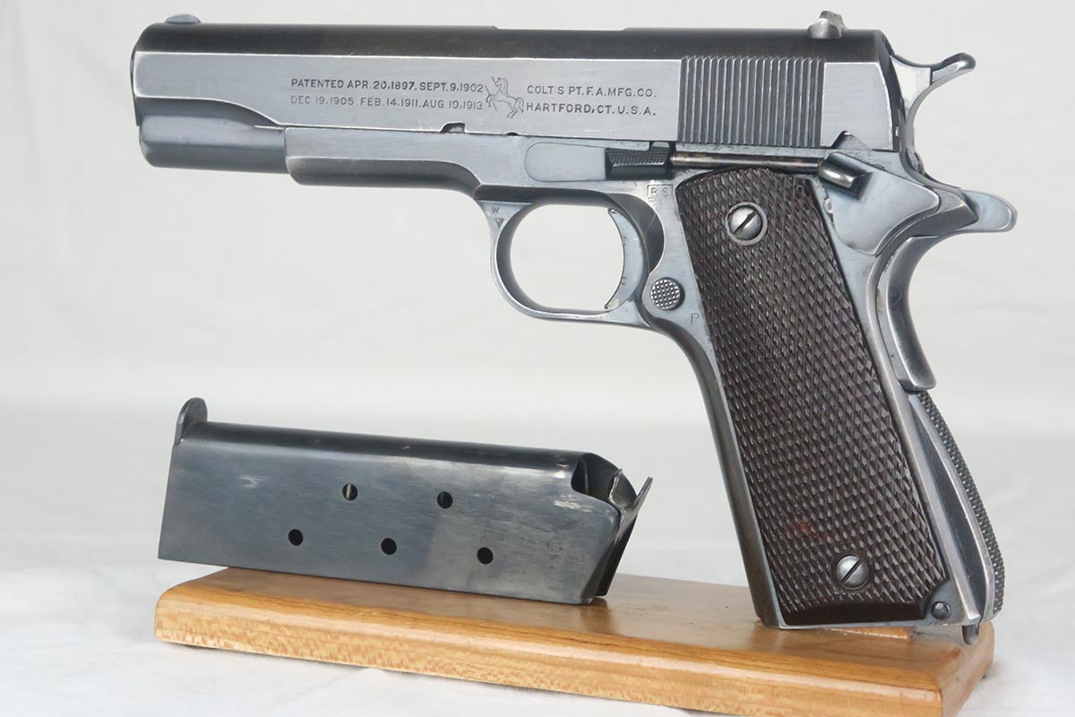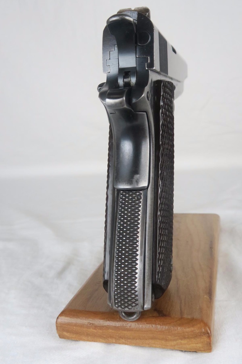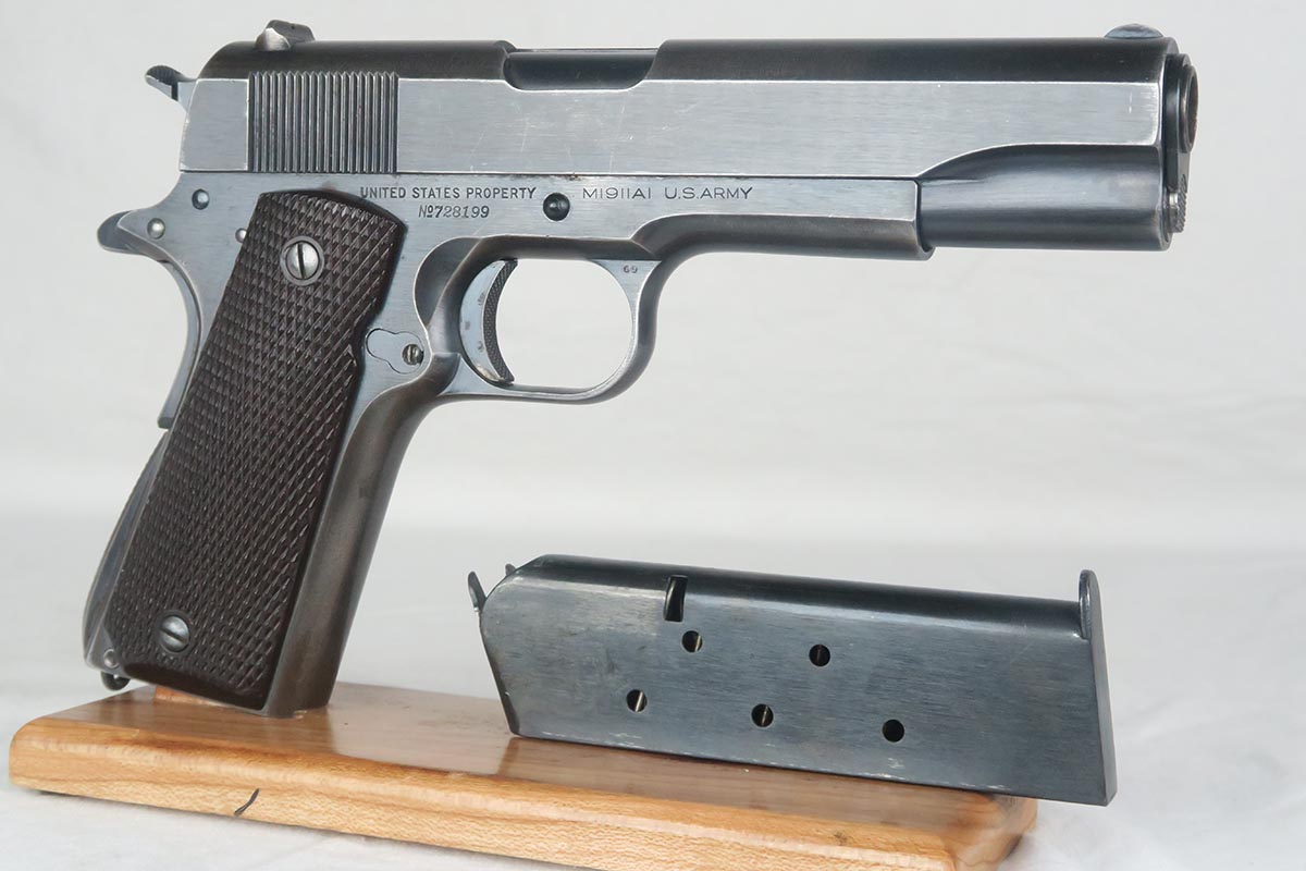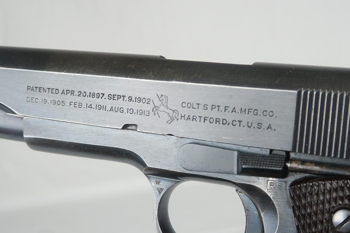 12/8/17 – This is a desirable RS marked 1941 Colt 1911A1.  It has the early WW2 brush blue finish, before it switched to parkerizing.  The gun is all original and correct with matching numbered slide, RS proof on frame (external and internal), Colt barrel with early G proof, and P proofs on frame and slide.  Comes with hollowed back grips, which were unique for the 1941/42 Colts.  Original finish rates about 92% with general thinning throughout.  Bore shows minor use but is still shiny with strong rifling.  S marked magazine.