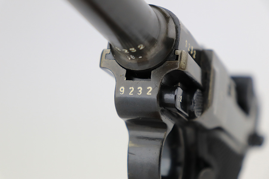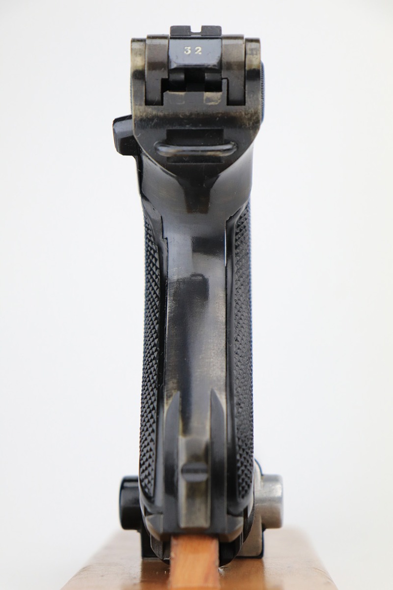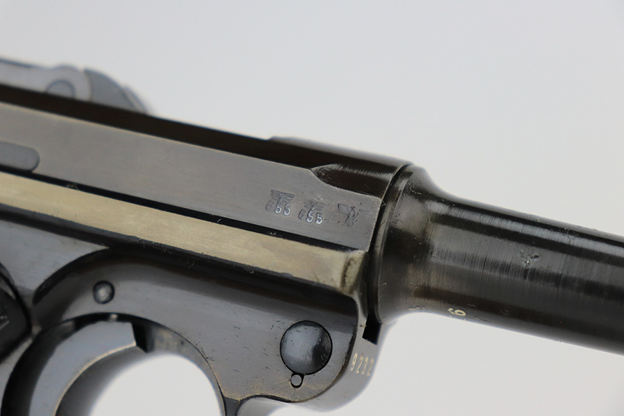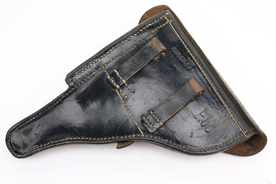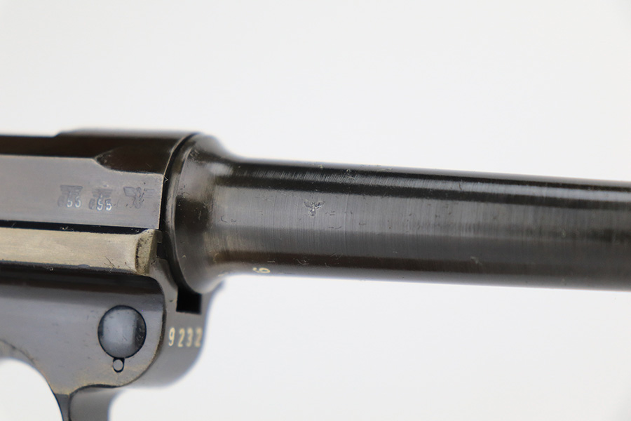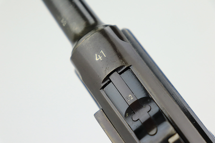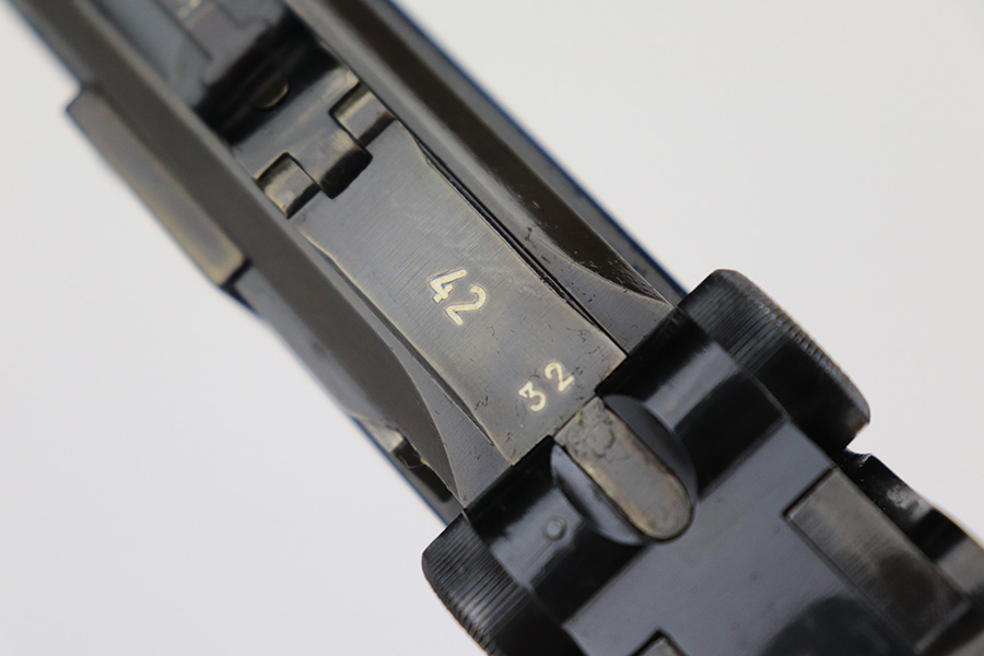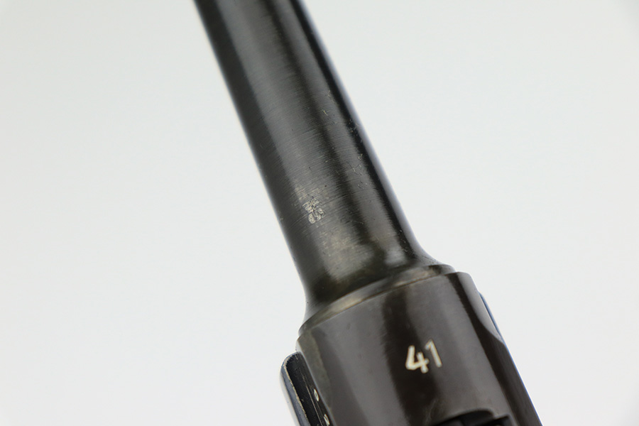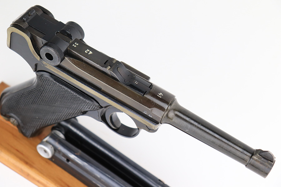 5/26/23 – This is a desirable Luger variation – the 1941/42 Mauser Luger. Only about 7,000 made, making them even rarer than the K date Luger. This one is all matching, has the proper “Eagle 655” Nazi military proofs. It is fitted with a set of high quality reproduction “Black Widow” grips and comes as a rig with a very nice 1941-dated holster, an “Eagle 655” tool, one original “Black Widow” magazine, and one un-numbered aluminum bottom magazine. The gun itself has retained roughly 60% of its finish. Much of the gun appears to have been touched up with cold blue. In any case, there is obvious finish loss and discoloration along both sides of the slide and frame. Minty bore. The hold-open does not work properly when the black widow mag is inside the gun – works fine with the other magazine.