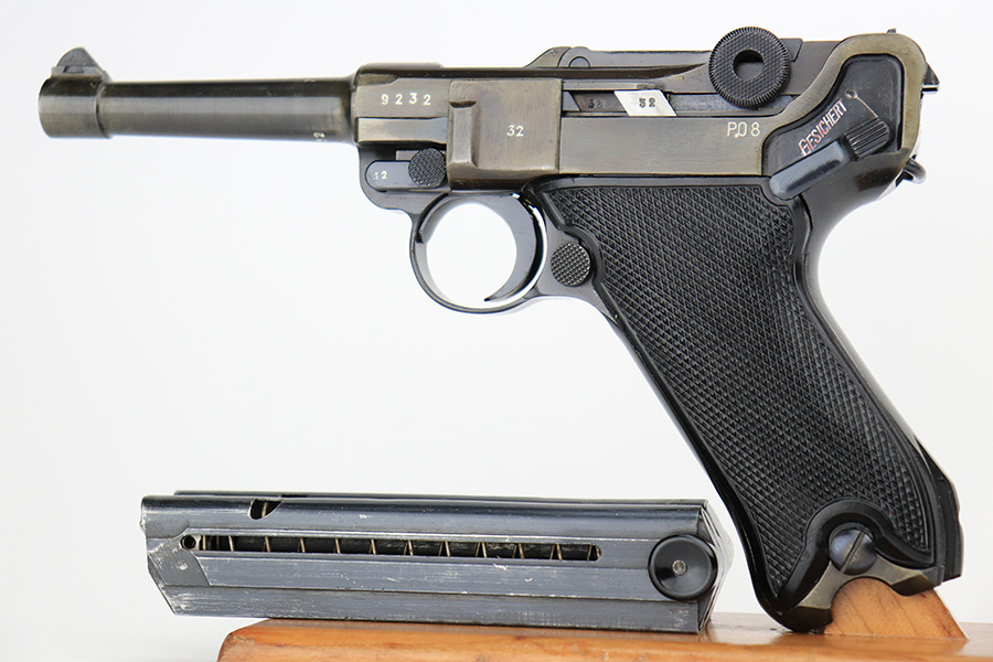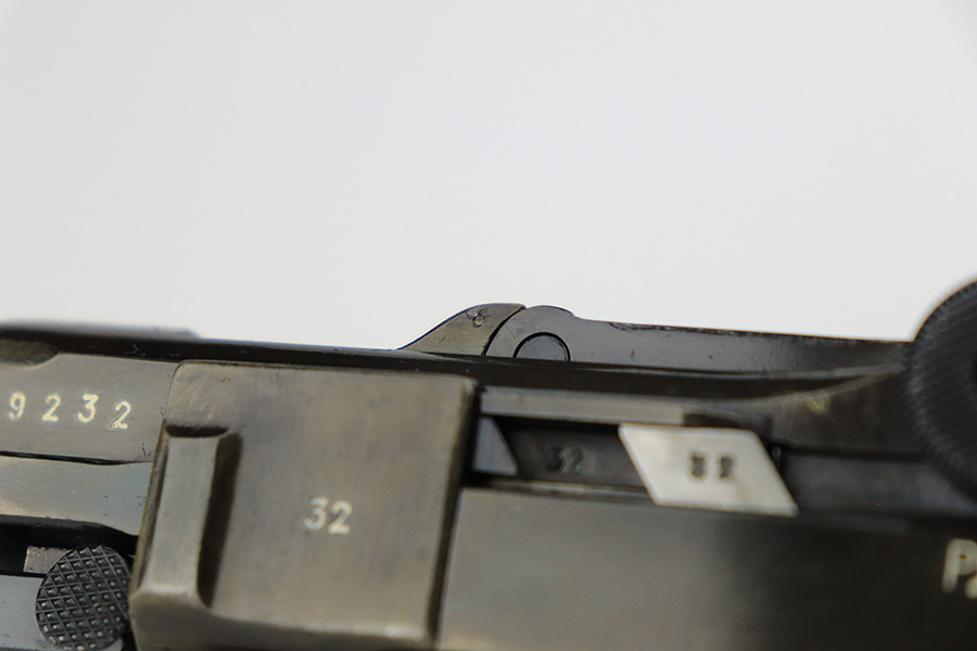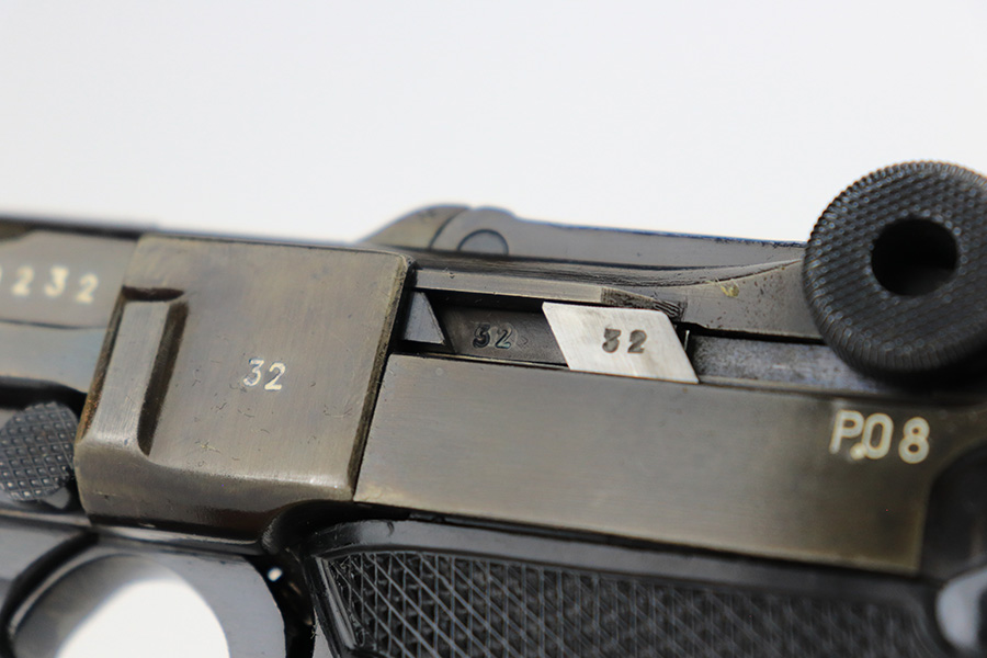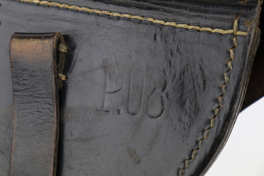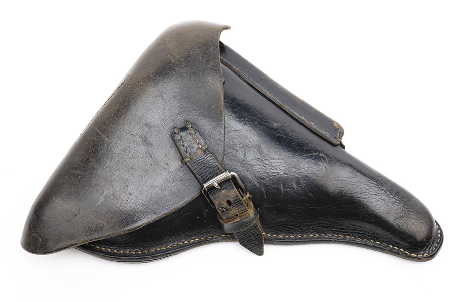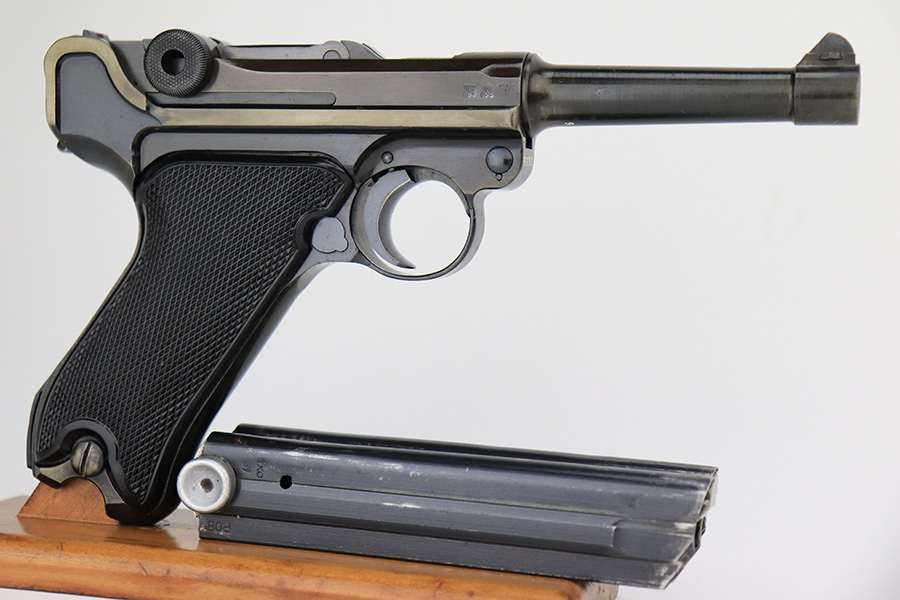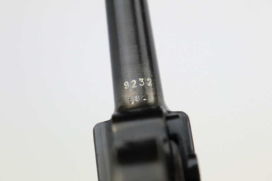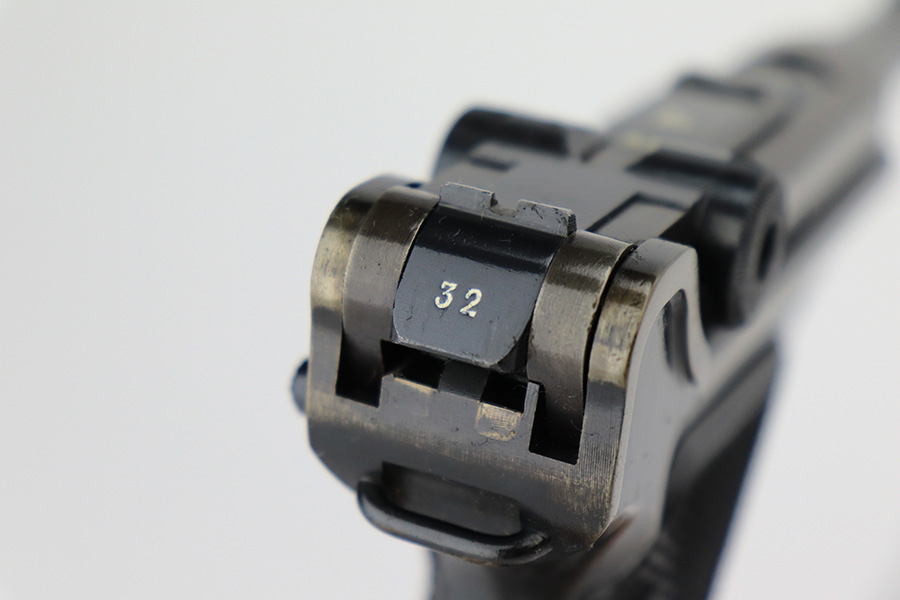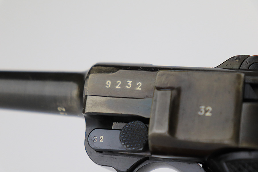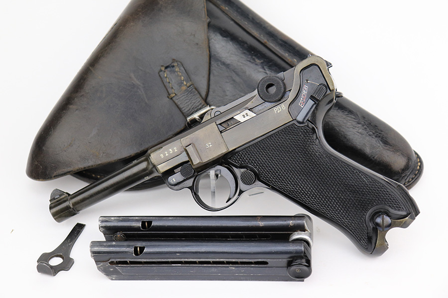 5/26/23 – This is a desirable Luger variation – the 1941/42 Mauser Luger. Only about 7,000 made, making them even rarer than the K date Luger. This one is all matching, has the proper “Eagle 655” Nazi military proofs. It is fitted with a set of high quality reproduction “Black Widow” grips and comes as a rig with a very nice 1941-dated holster, an “Eagle 655” tool, one original “Black Widow” magazine, and one un-numbered aluminum bottom magazine. The gun itself has retained roughly 60% of its finish. Much of the gun appears to have been touched up with cold blue. In any case, there is obvious finish loss and discoloration along both sides of the slide and frame. Minty bore. The hold-open does not work properly when the black widow mag is inside the gun – works fine with the other magazine.